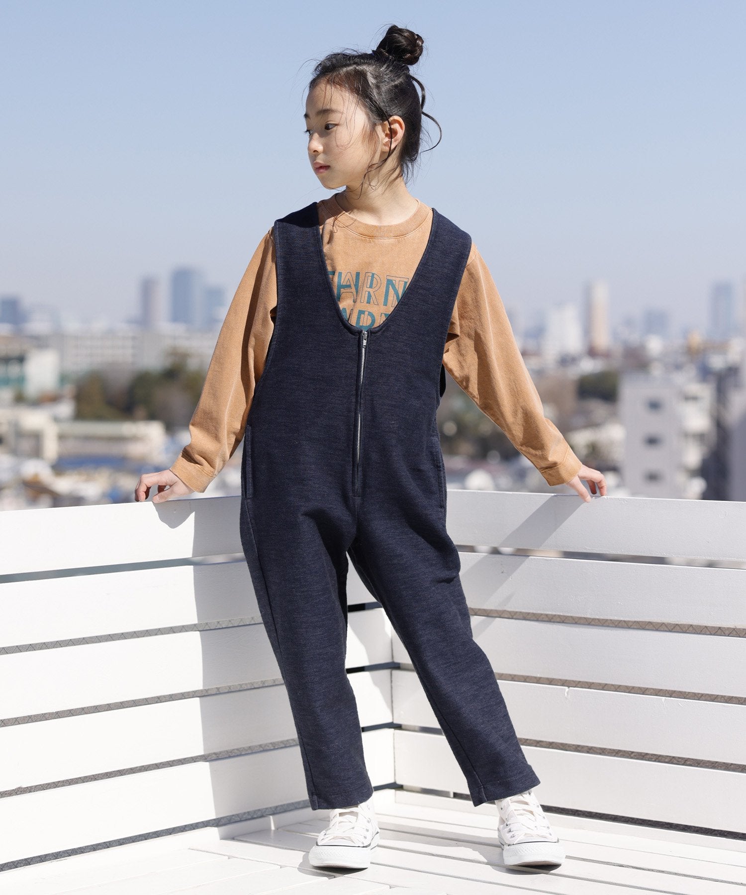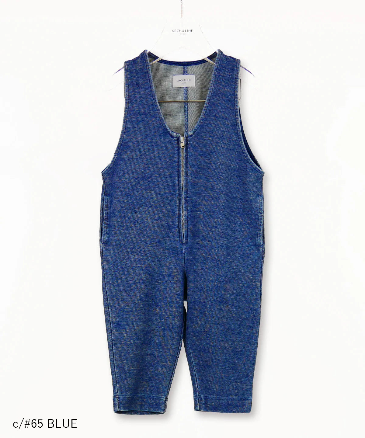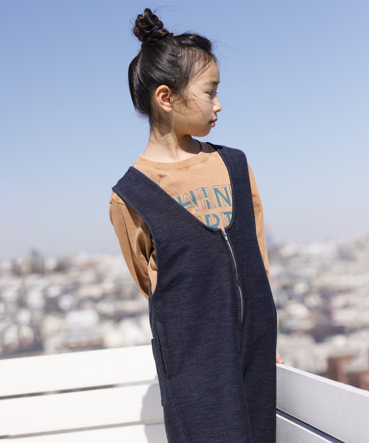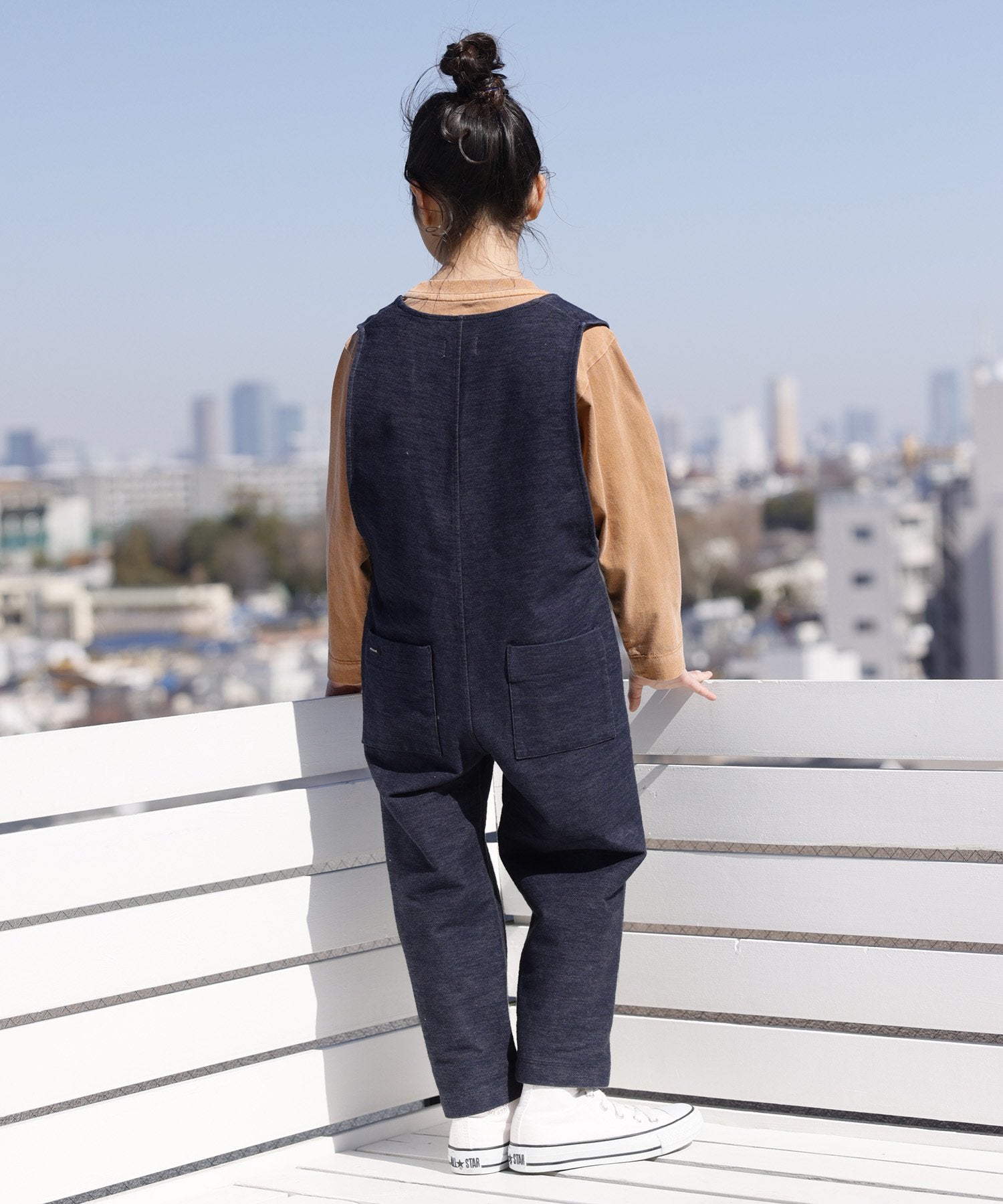 Overalls that can be worn all year round, using classic SOFT DENIM JERSEY. Although it looks like denim, the main point of this product is that it is cut and sewn. These overalls are made of this material that you will become addicted to once you wear them, and are perfect for active children as they will relieve the feeling of tightness in your stomach. Putting on and taking it off is as easy as raising and lowering the zip, so it's not difficult to use the bathroom. This item is dyed with indigo, so you can enjoy it as it changes over time. It has a design that can be worn by both children and adults.