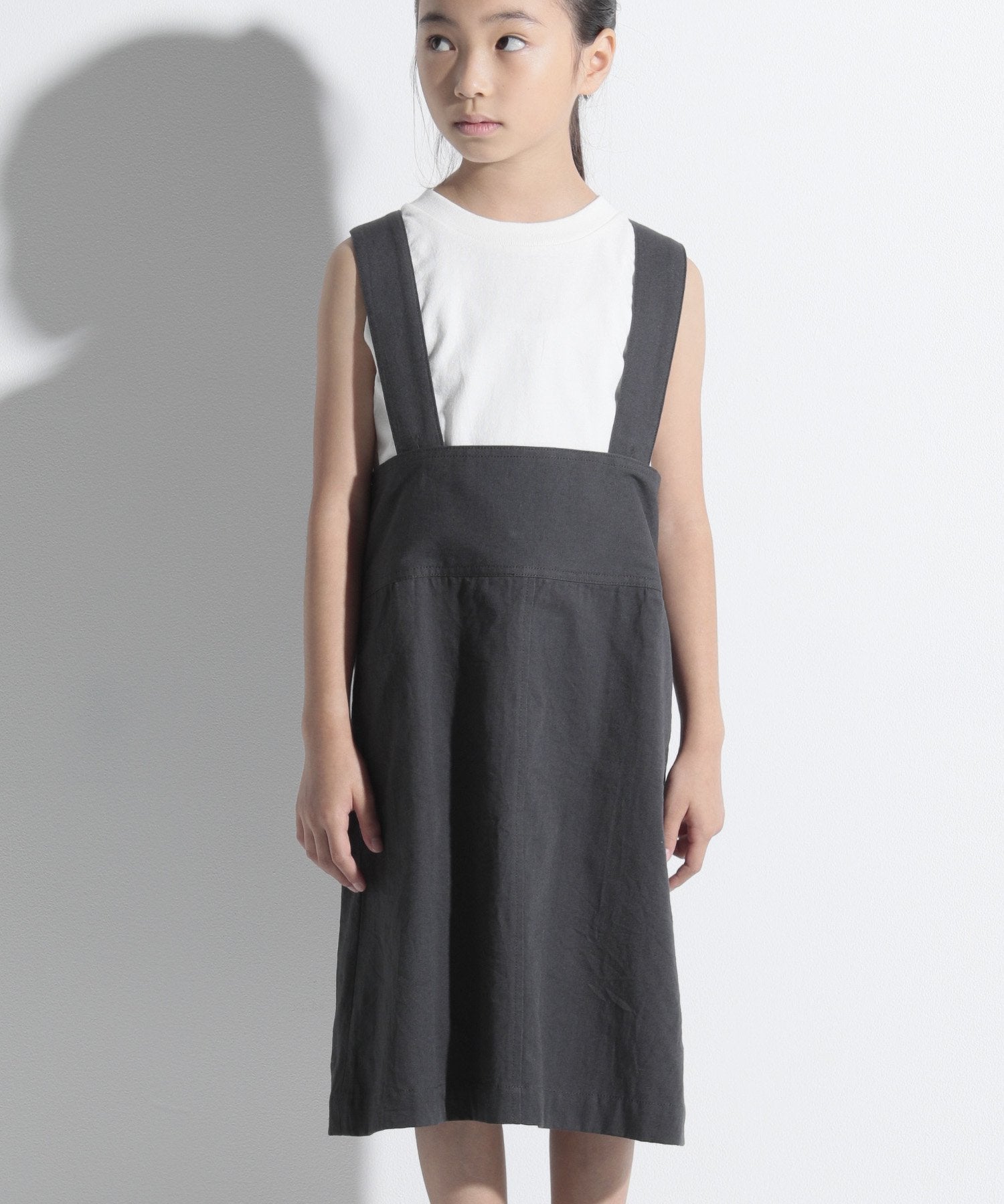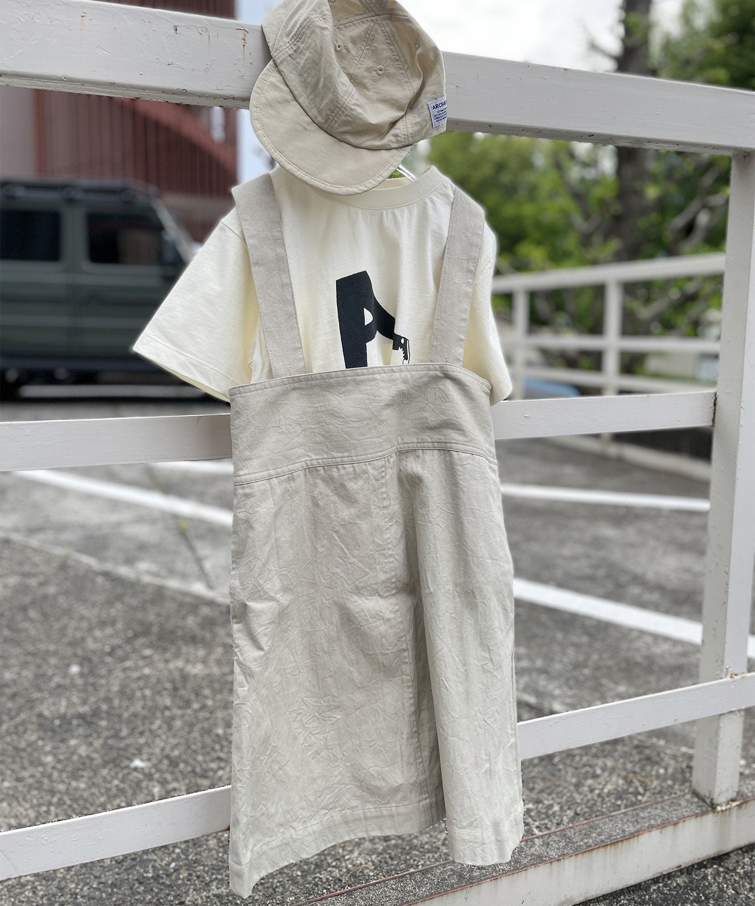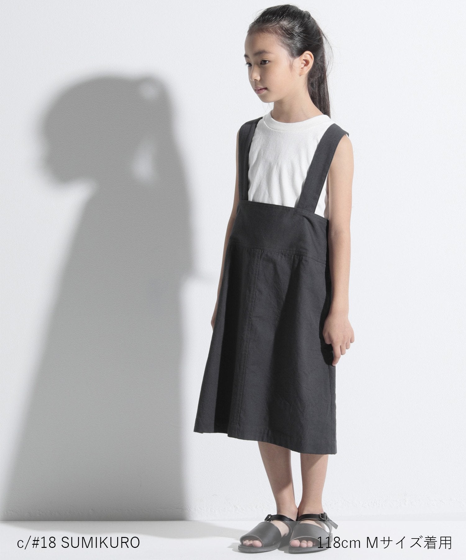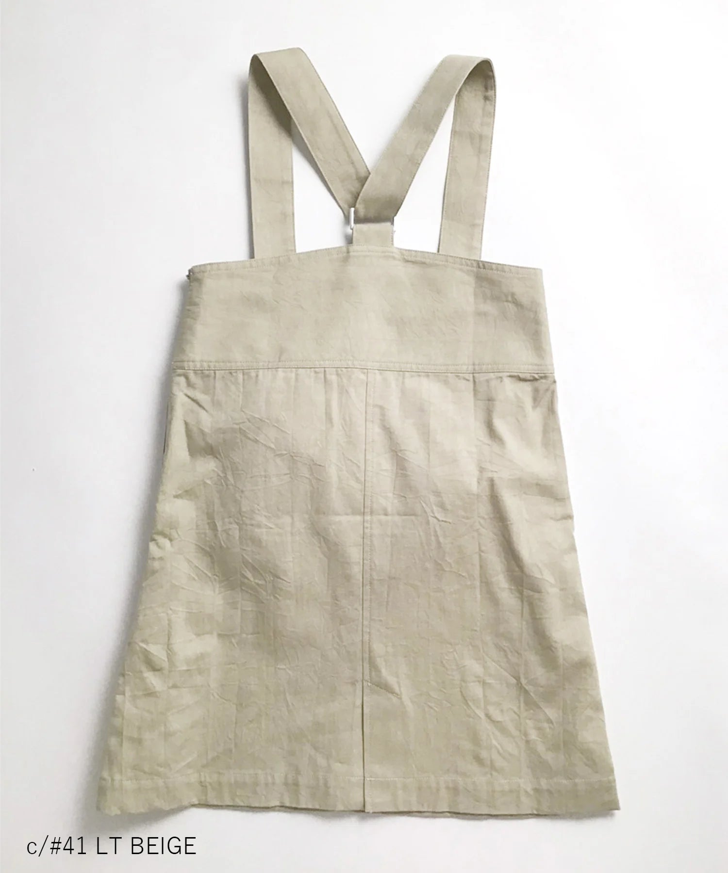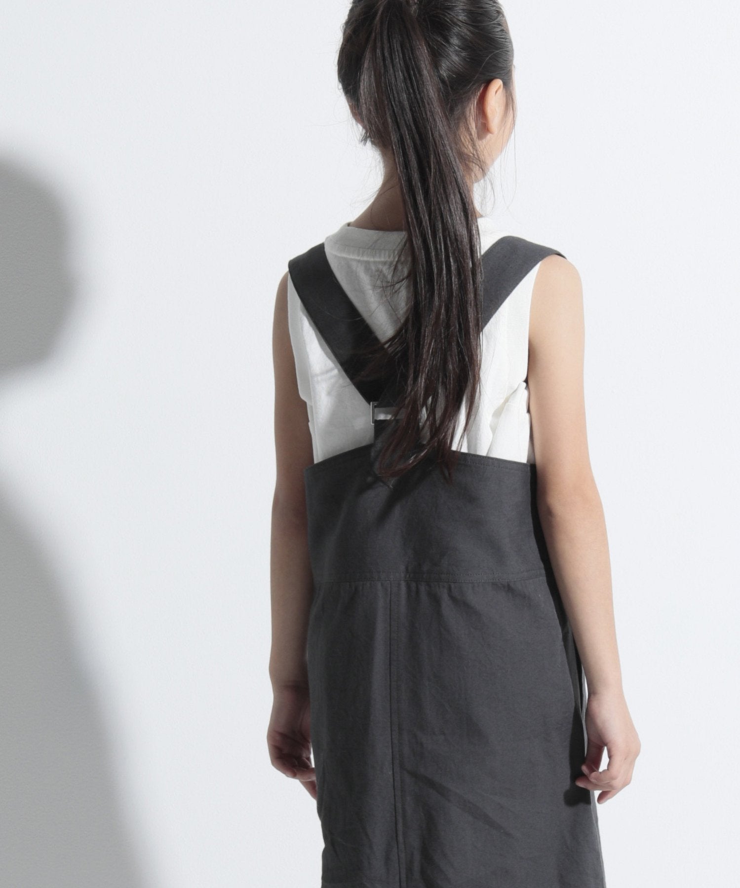 Jumper skirt made of cotton oxford with washer finish. The thick shoulder straps give it a crisp look that's not just cute. Also, making it slightly high-waisted will enhance your style. In addition, the stitch work and accessories have a slightly work-like feel, creating a fun piece that creates a gap between beautiful eyes and work. There are 3 holes on the front side, which can be adjusted according to growth and preference. The back view of the shoulder straps looks like a V-shape, which is extremely cute and has a strong presence.