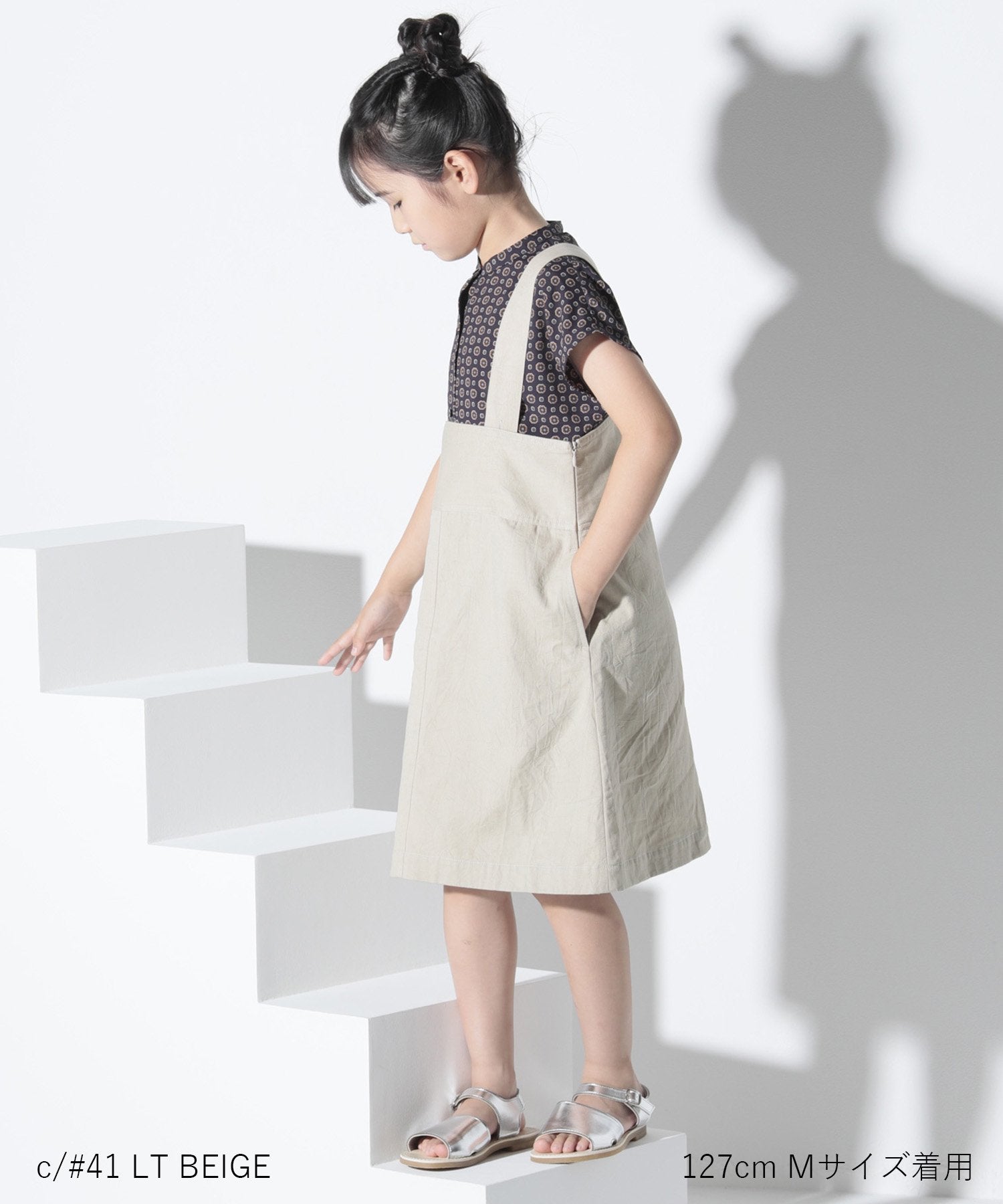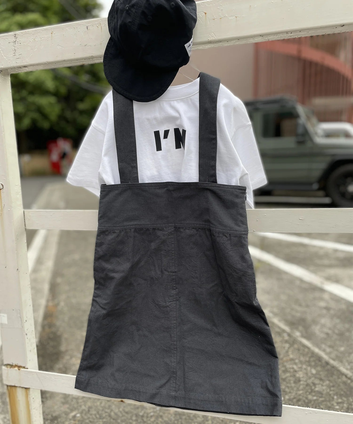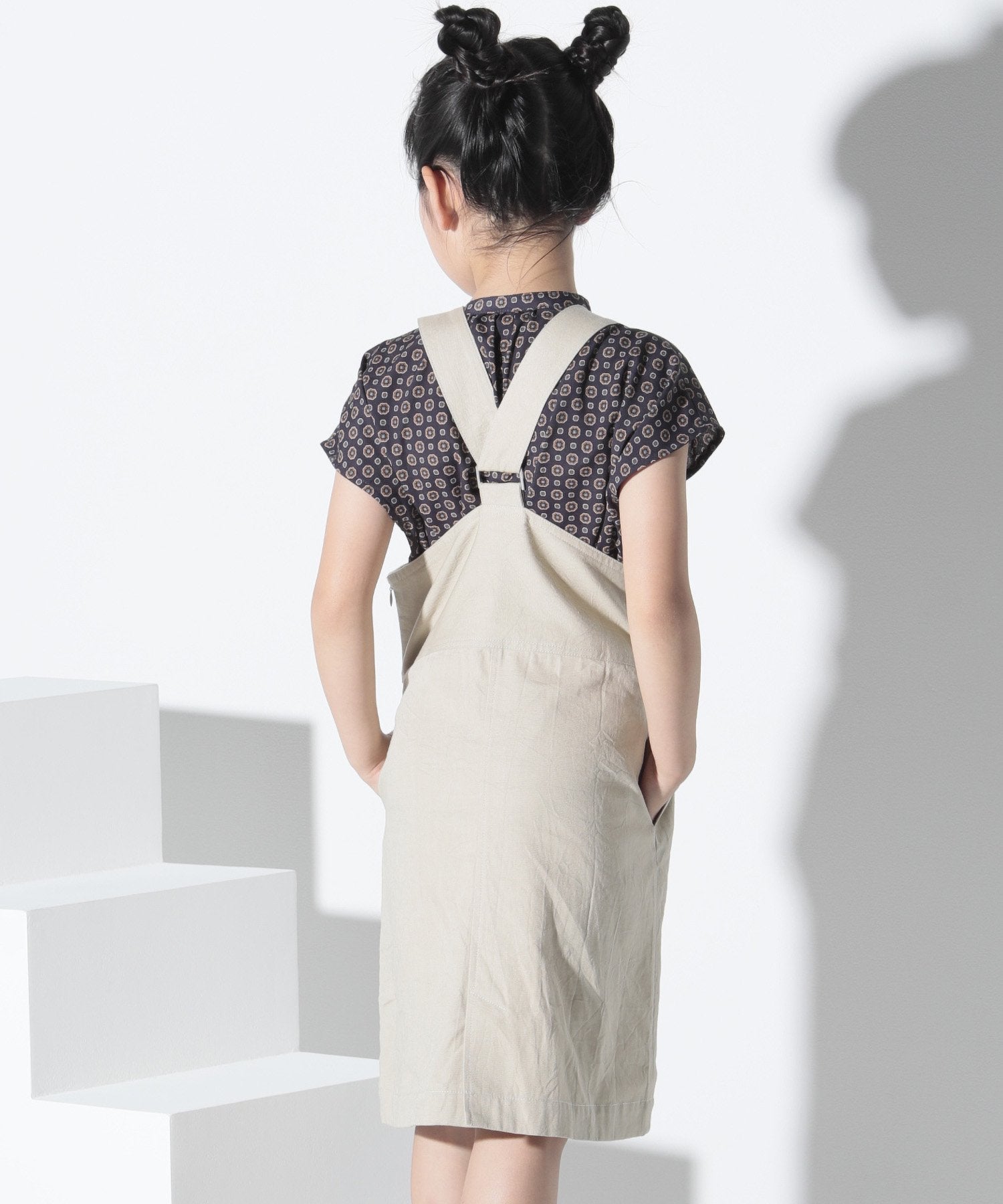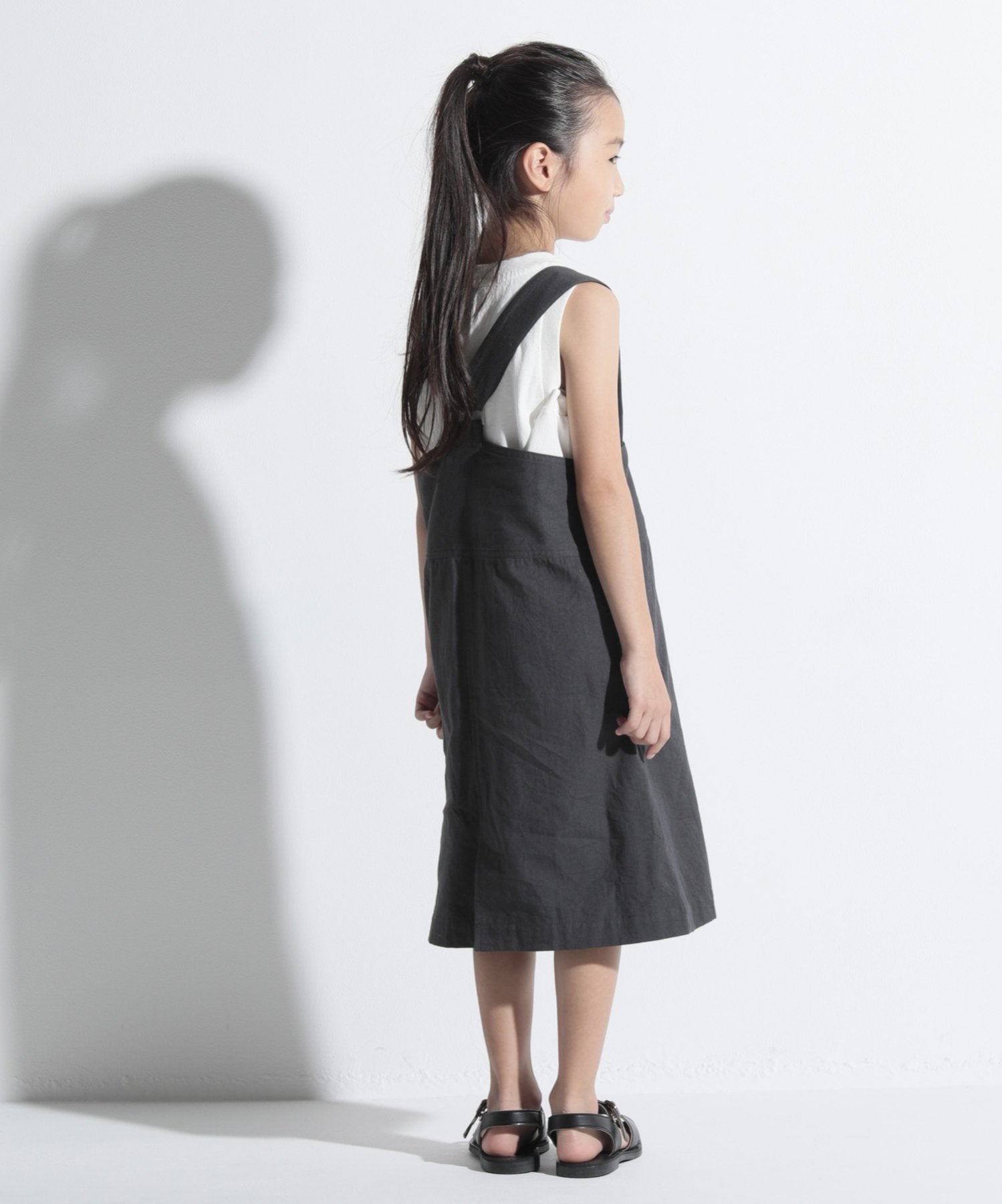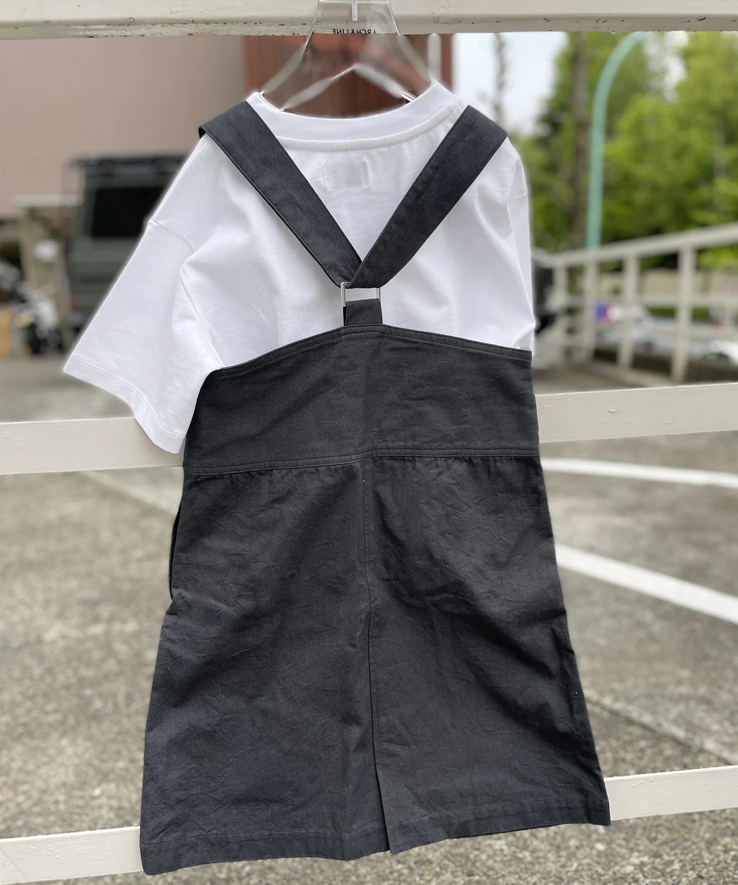Jumper skirt made of cotton oxford with washer finish. The thick shoulder straps give it a crisp look that's not just cute. Also, making it slightly high-waisted will enhance your style. In addition, the stitch work and accessories have a slightly work-like feel, creating a fun piece that creates a gap between beautiful eyes and work. There are 3 holes on the front side, which can be adjusted according to growth and preference. The back view of the shoulder straps looks like a V-shape, which is extremely cute and has a strong presence.