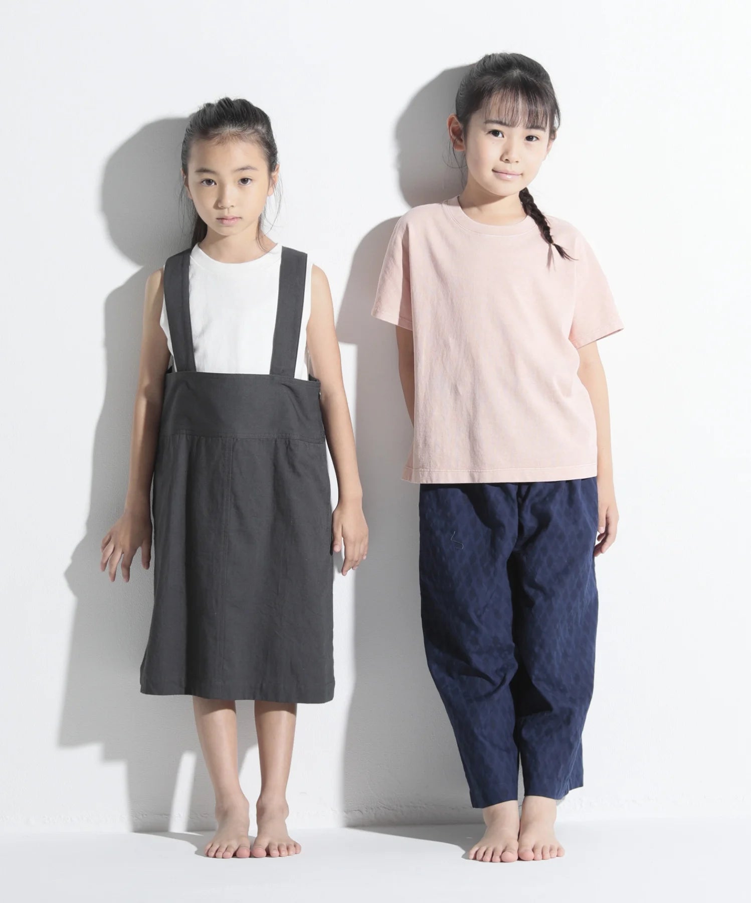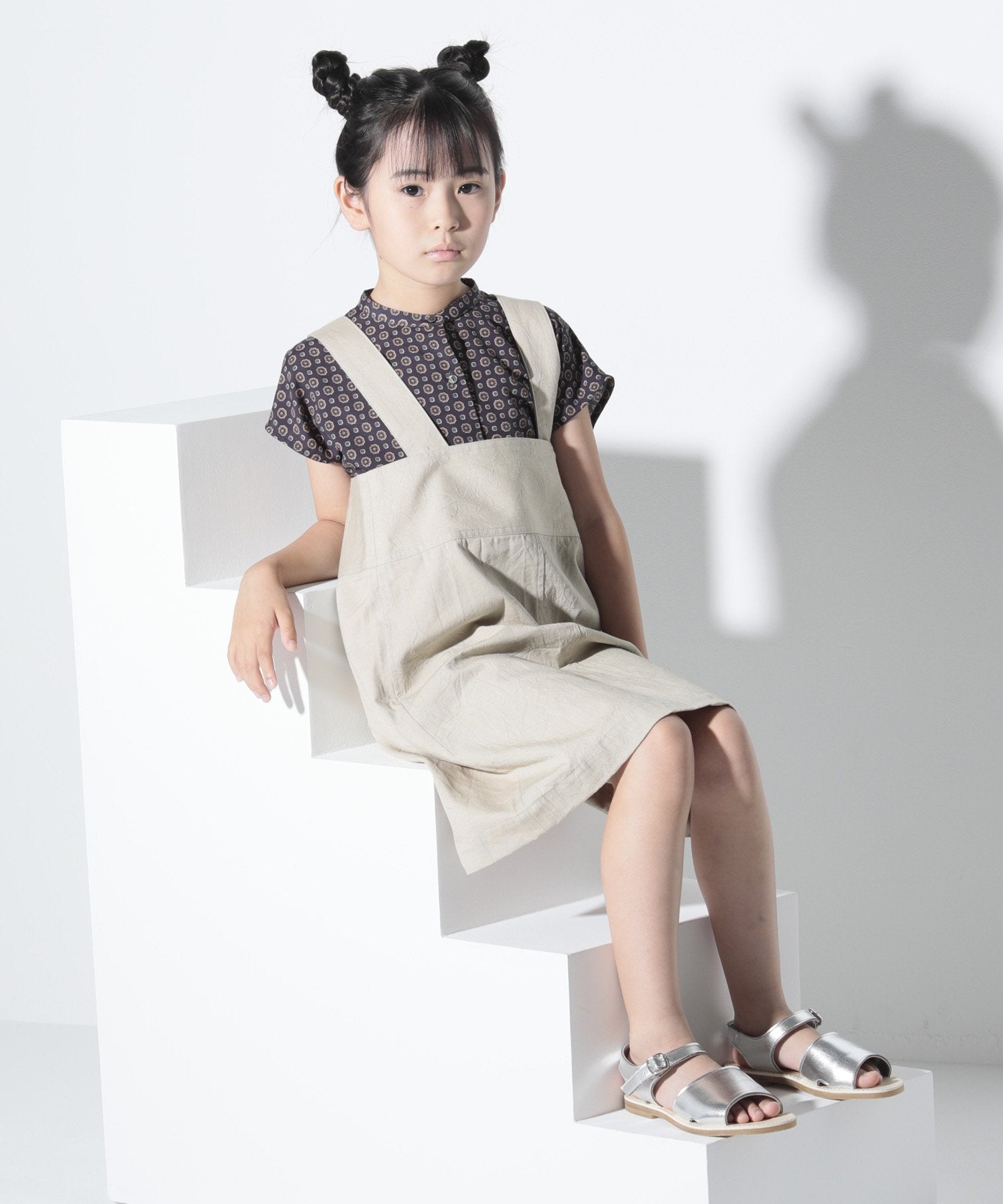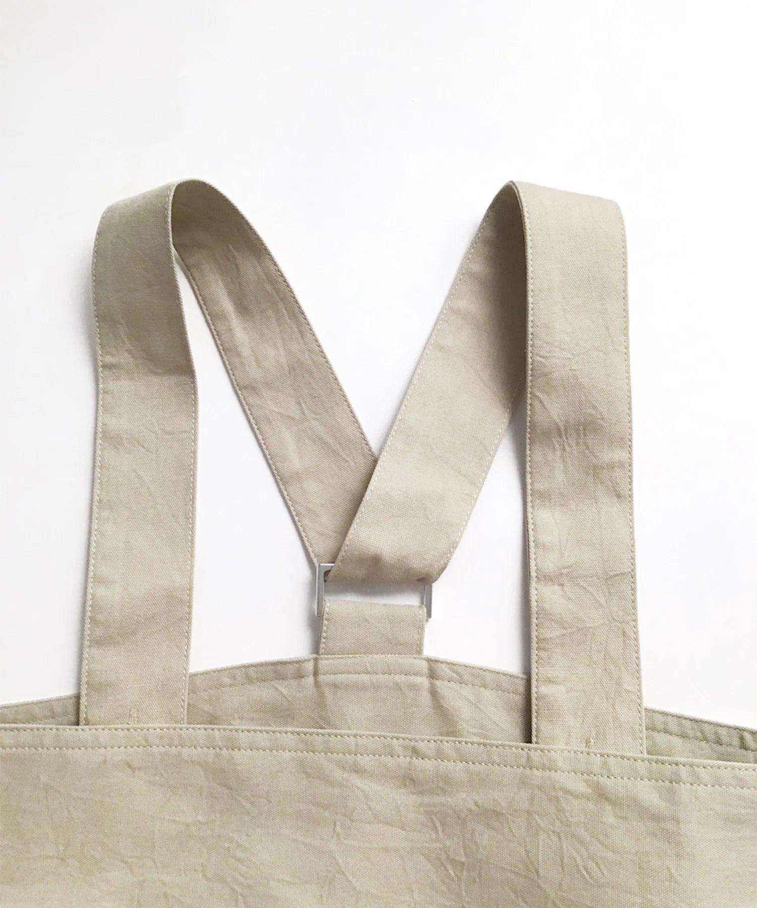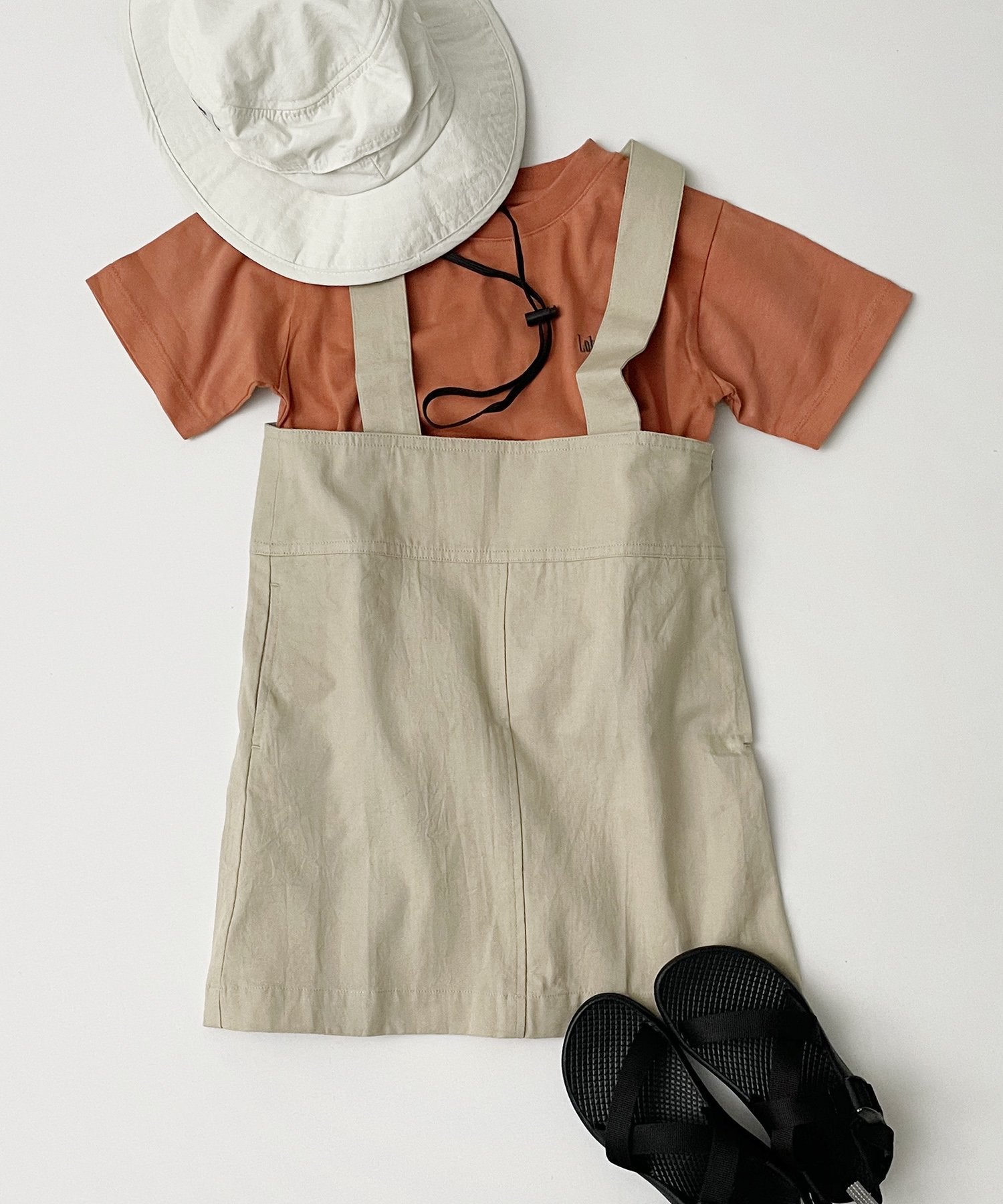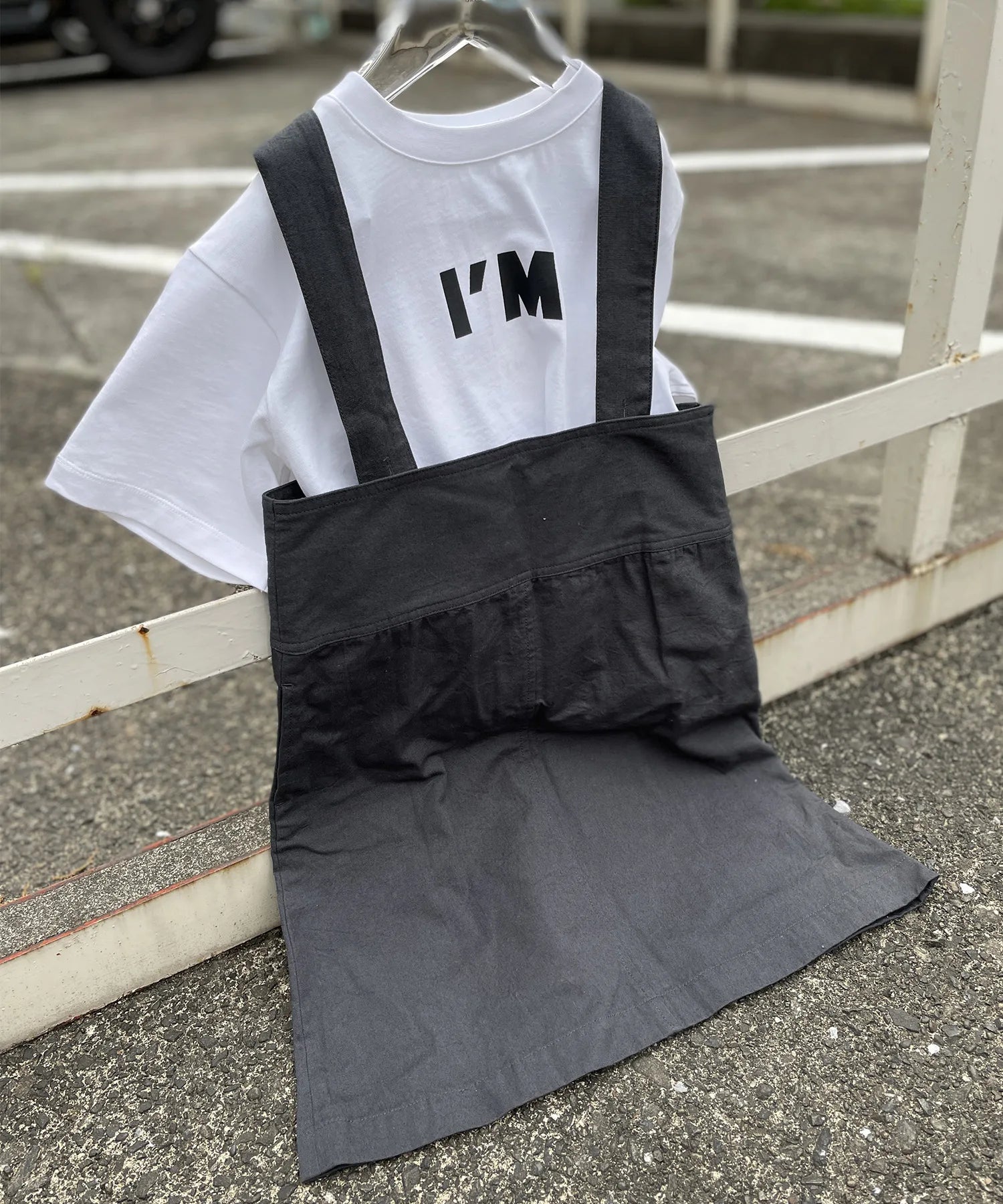 Jumper skirt made of cotton oxford with washer finish. The thick shoulder straps give it a crisp look that's not just cute. Also, making it slightly high-waisted will enhance your style. In addition, the stitch work and accessories have a slightly work-like feel, creating a fun piece that creates a gap between beautiful eyes and work. There are 3 holes on the front side, which can be adjusted according to growth and preference. The back view of the shoulder straps looks like a V-shape, which is extremely cute and has a strong presence.