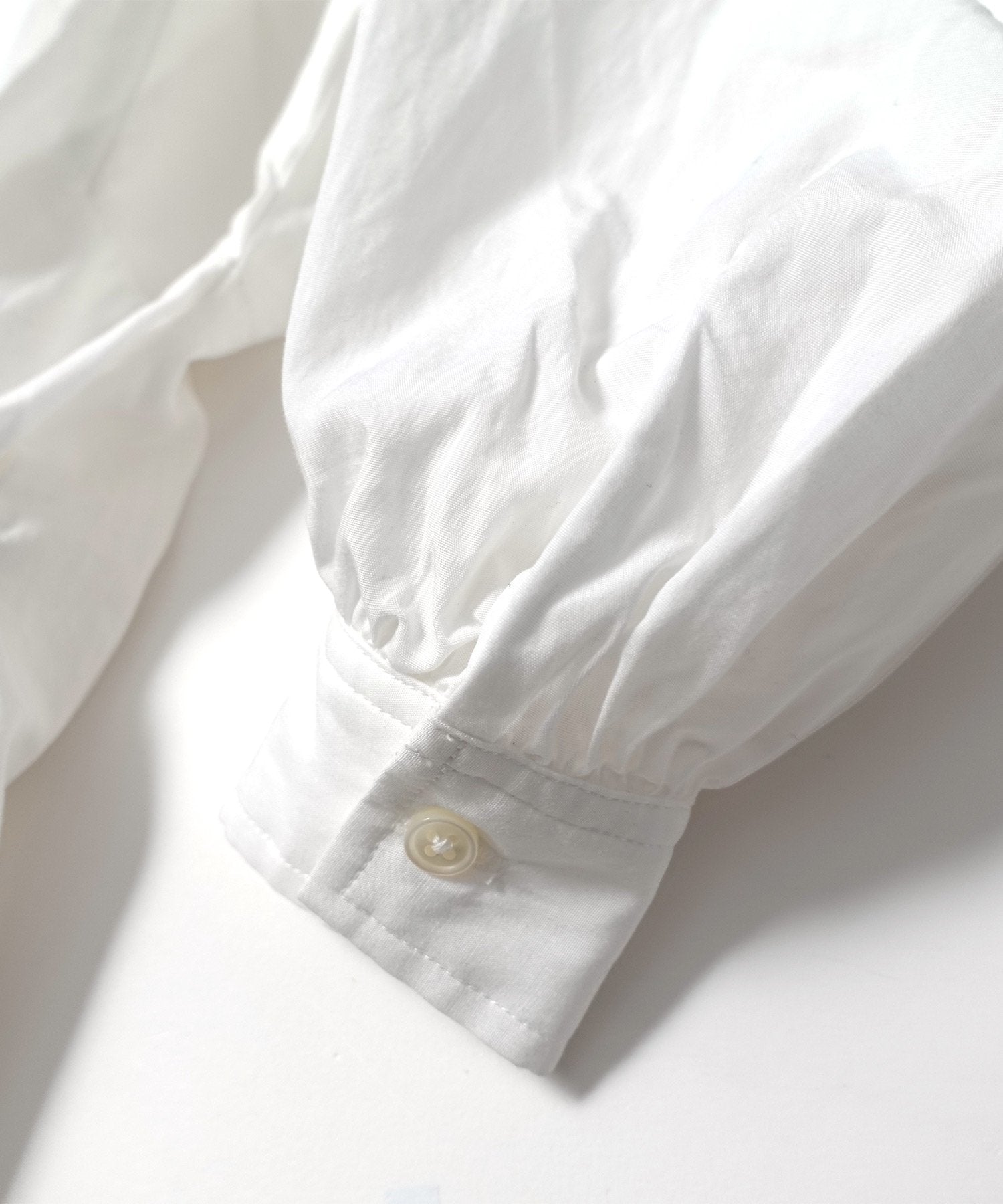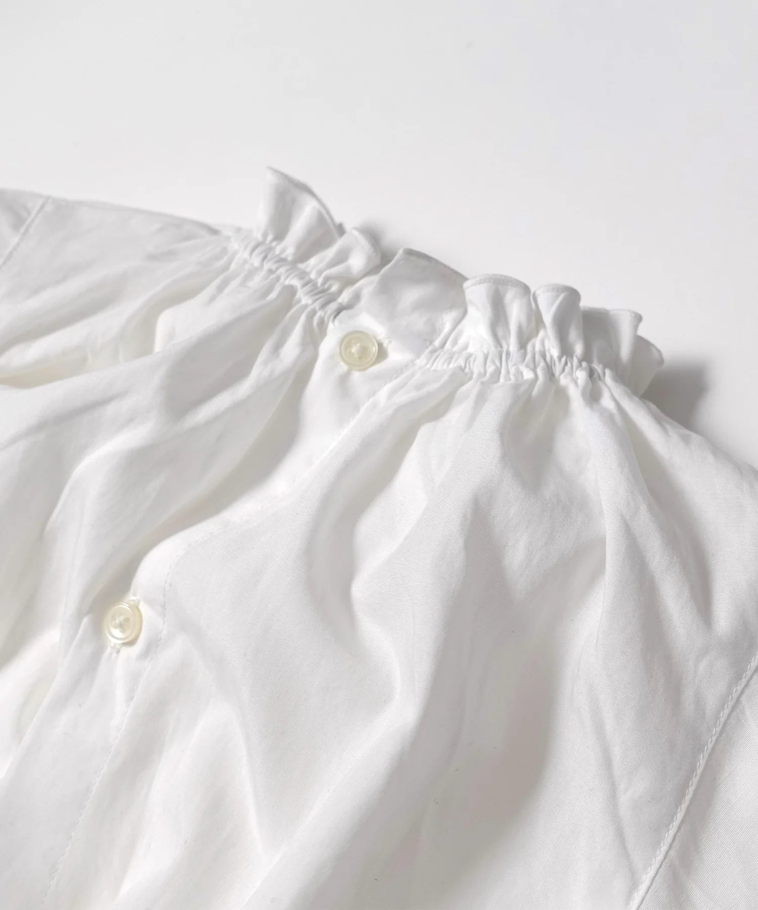 ■Details 2-way design that can be worn with either side in front. The design has sweet details such as the ruffles on the collar and the gathered waist. The sleeves are also generously gathered. By adding thin-edged buttons, we created a somewhat mature impression that is not just sweet.