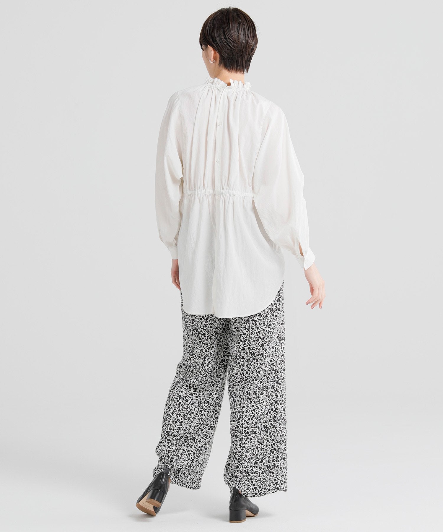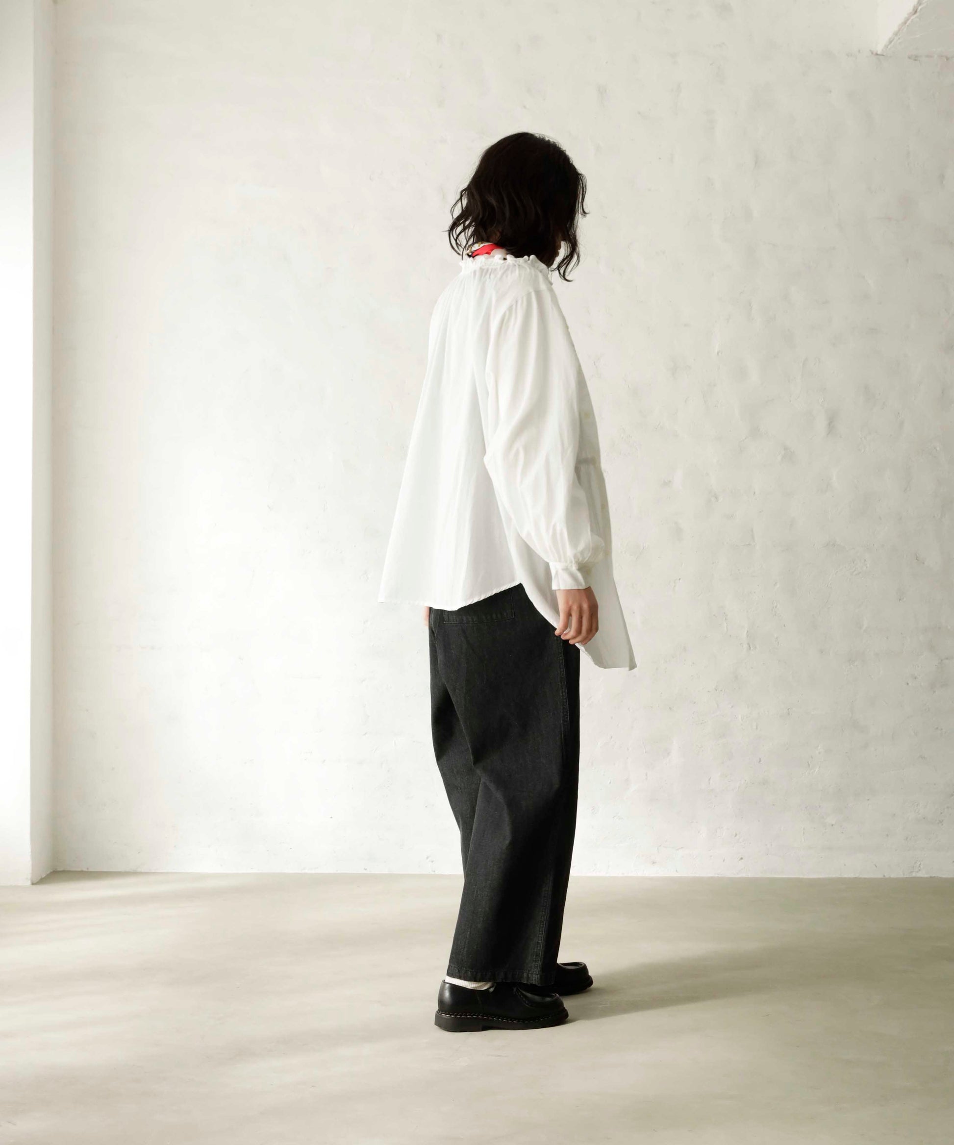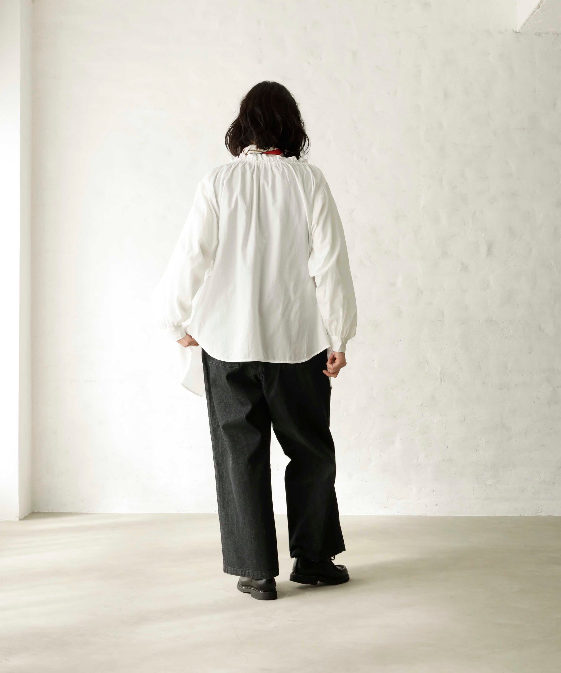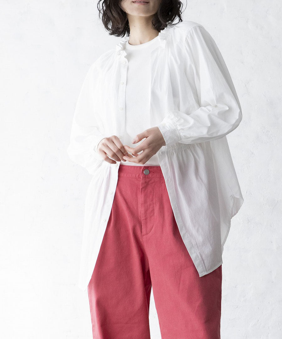 ■Material A blend of lyocell and cotton yarn that is natural, yet has a beautiful and moist feel. Due to the lyocell content, the generous amount of gathers does not add bulk and blends in beautifully. Lyocell, a recycled fiber, is attracting attention as a plant-based and sustainable material.