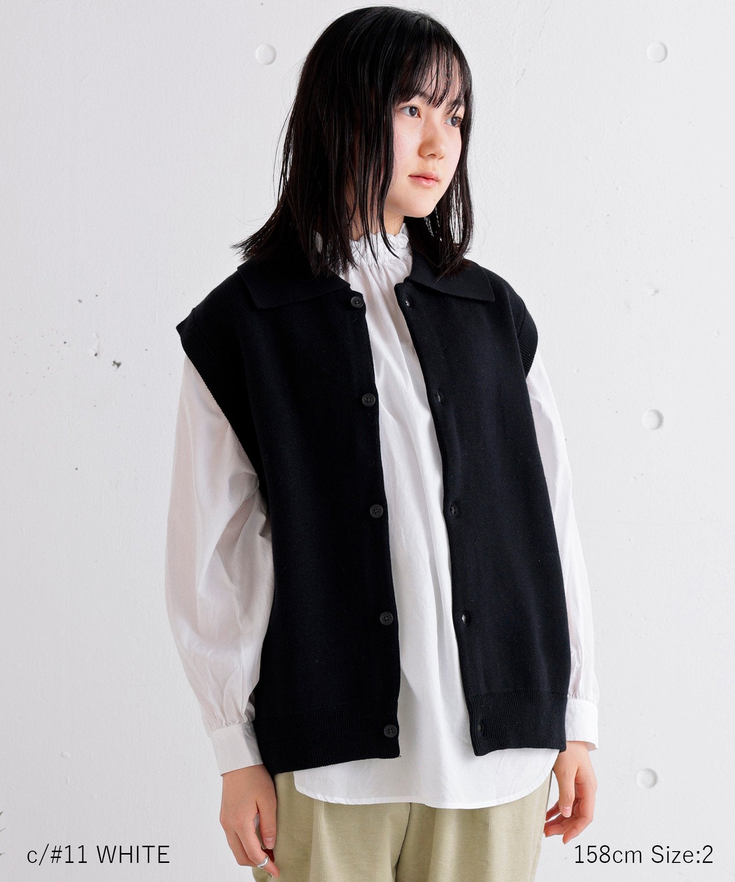 ■Styling You can enjoy coordinating it according to your mood that day by closing the buttons for a neat look or opening the front and wearing it as a jacket. Furthermore, it has a 2-way design that can be worn front to back, so you can style it with the buttons on the back for a clean look. It can be paired with a skirt or bolero for a formal outfit, so it is an item that can be used in a variety of outfits throughout the year. In winter, we recommend wearing it under a casual sweatshirt or knit to show just the collar.
