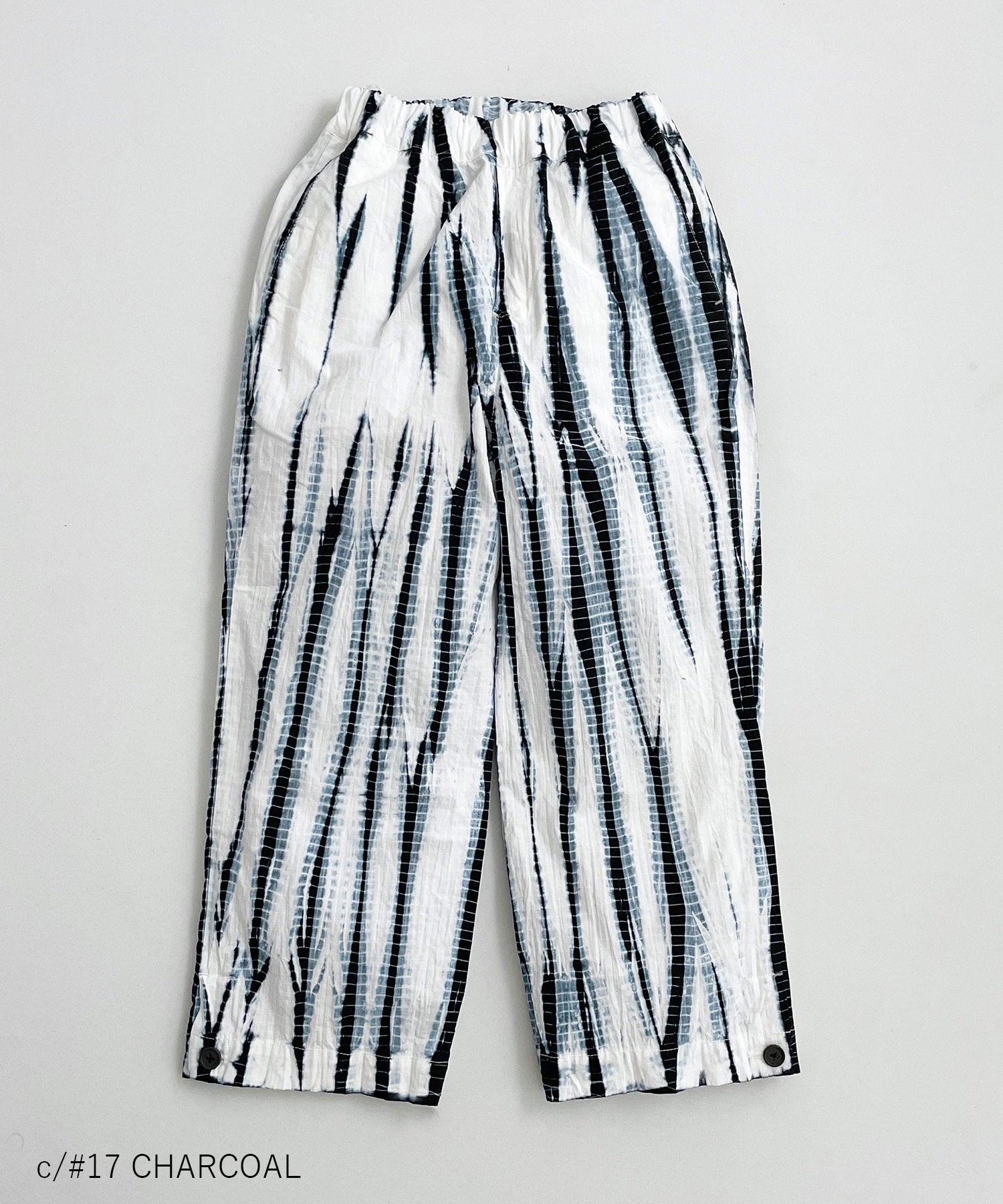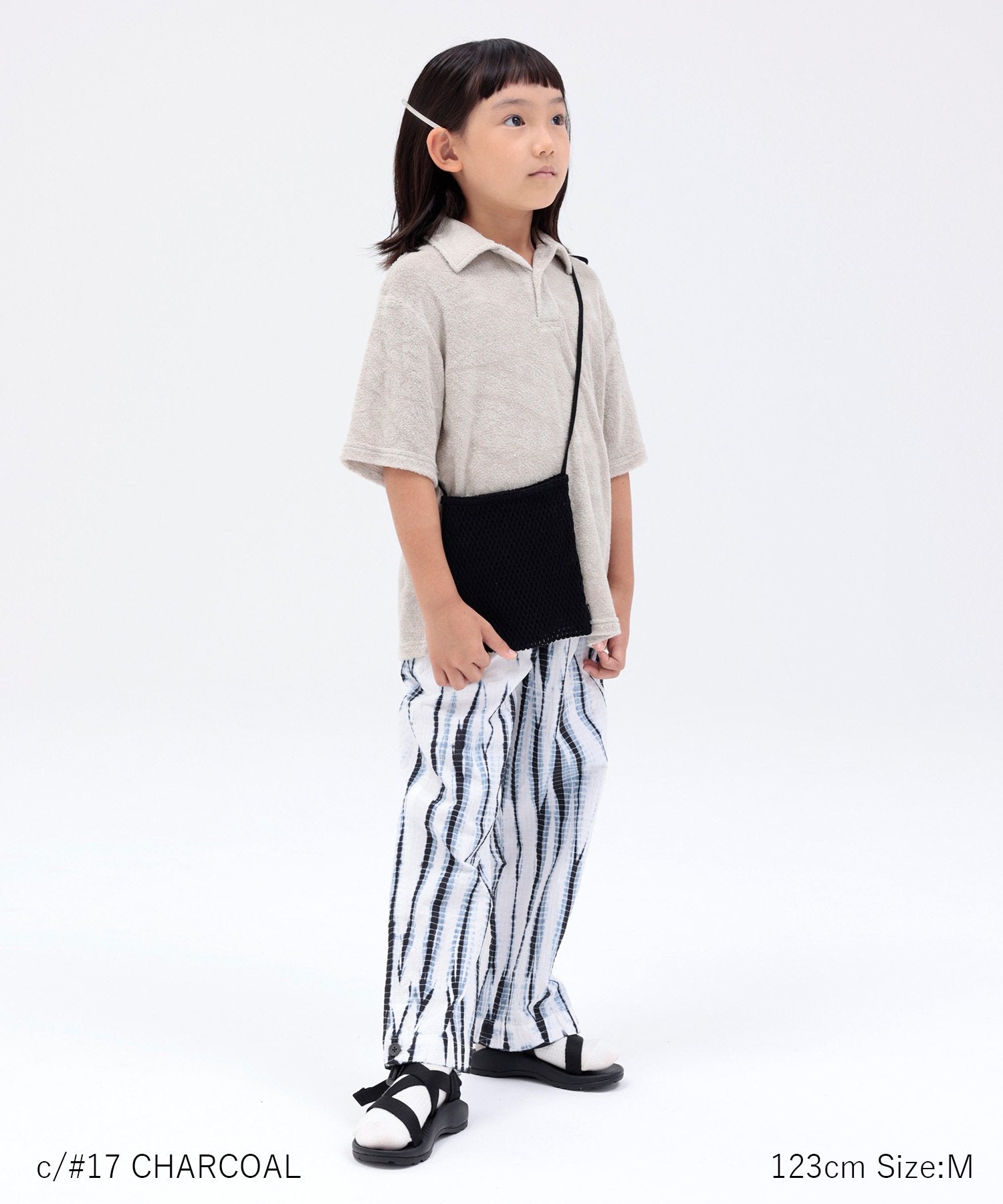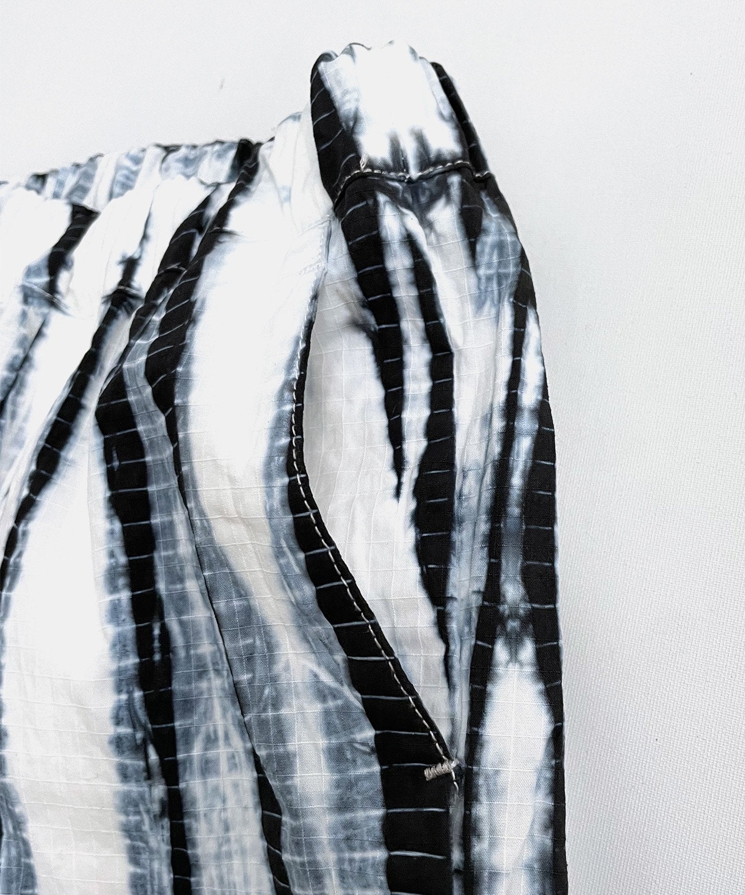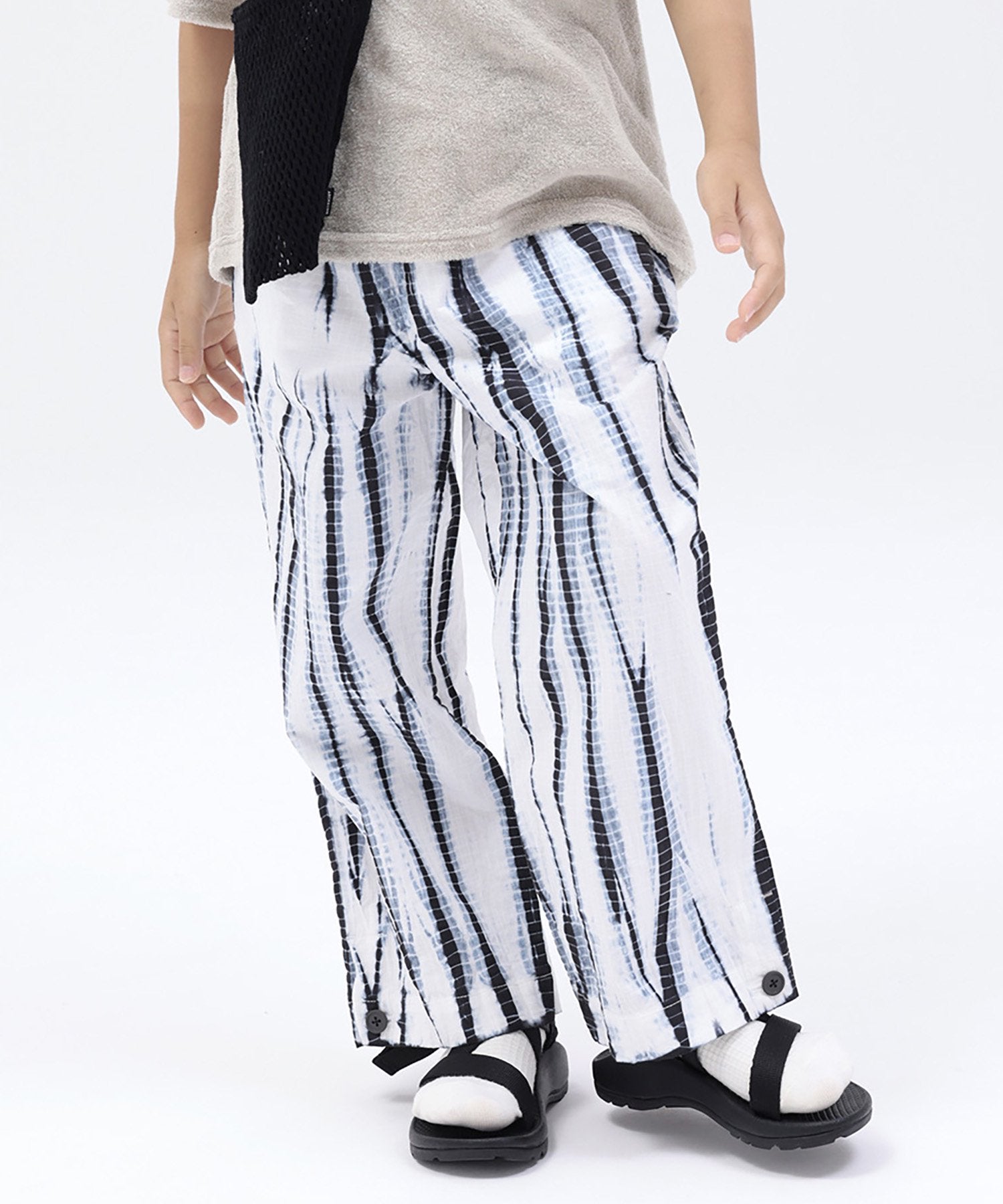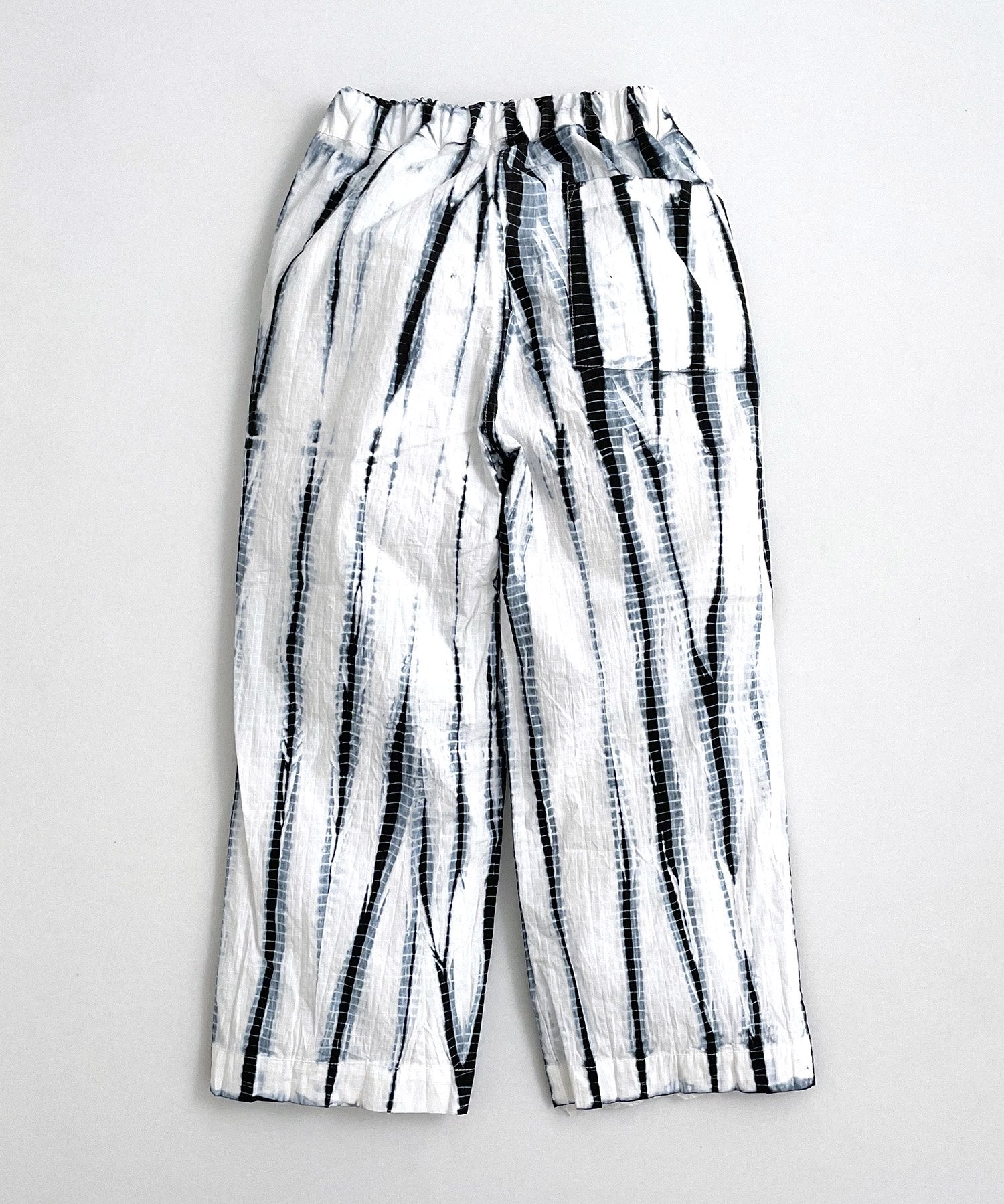 ■Details Baker pants made of 100% organic cotton ripstop. Arashi Shibori is a fantastic dyeing technique that has continued since the Edo period in Arimatsu, Aichi Prefecture. It is called "Arashi Shibori" because of the way it blows like a storm. Kimonos with these colors and patterns were worn 150 to 200 years ago. We have created it in the shape of baker pants so that you can enjoy it even in modern life. Baker pants have a rare single cuff. The silhouette is not too thick and does not restrict movement. - Pockets on both sides and right hip - There is an elastic opening on the left side for sizes S to 1, so you can adjust it by replacing the elastic according to your preference and growth. Size 2 and 3 waist opening and closing with zip and button. There is a waist string that can be adjusted to suit your preference.・The processed part has a color close to navy to charcoal. ・As each piece is processed by hand by a craftsman, the color appearance and texture may vary depending on the item, and there may be bleeding, uneven color, or dye splatter due to the processing. . Please note that this is not a defective product.・If you wash repeatedly, the dyed area may become lighter. I would be happy if I could share the wonderful Japanese culture and craftsmanship with children (and adults as well).