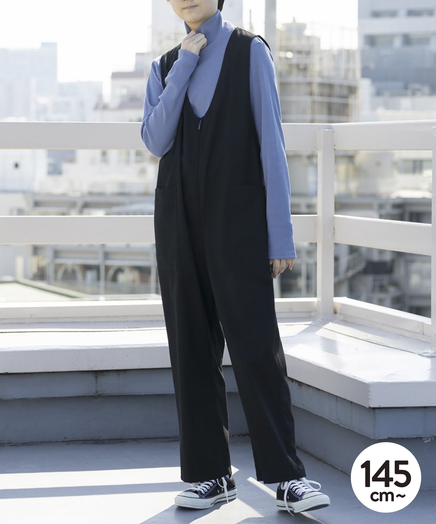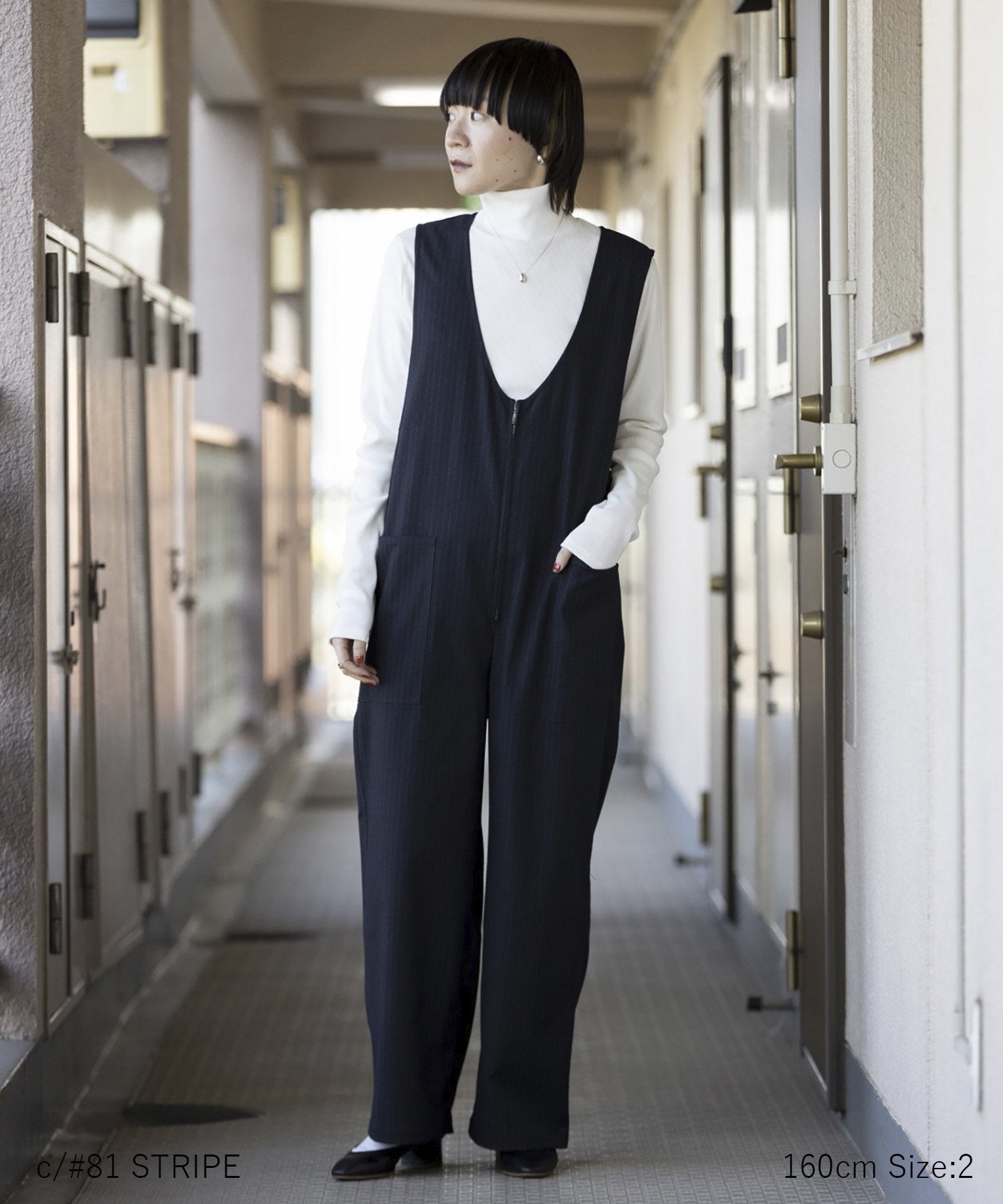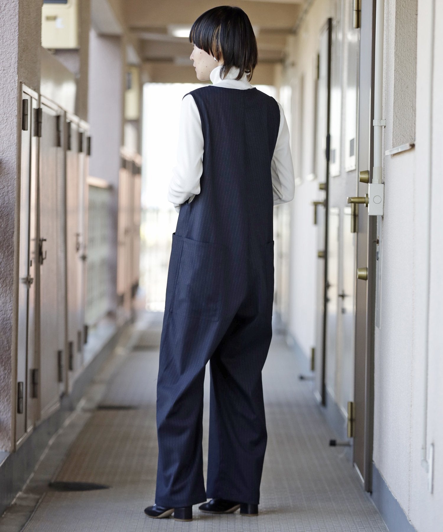 U-neck overalls that are popular among people of all ages and genders are now available in beautiful materials. The extra room around the hips and hem width makes it easier to move and more comfortable. There are four pockets on the waist, which are also a design point. It has been adjusted so that it fits well with a double jacket made of the same material.