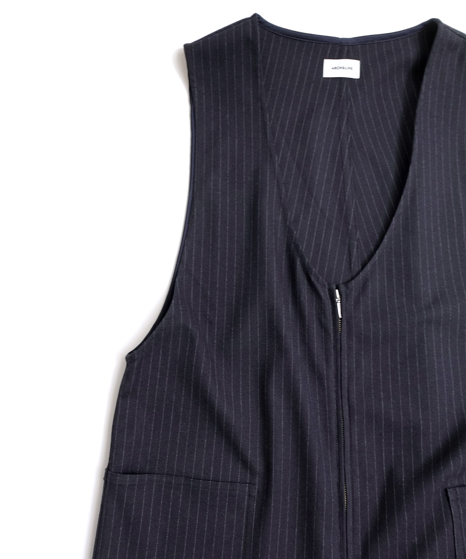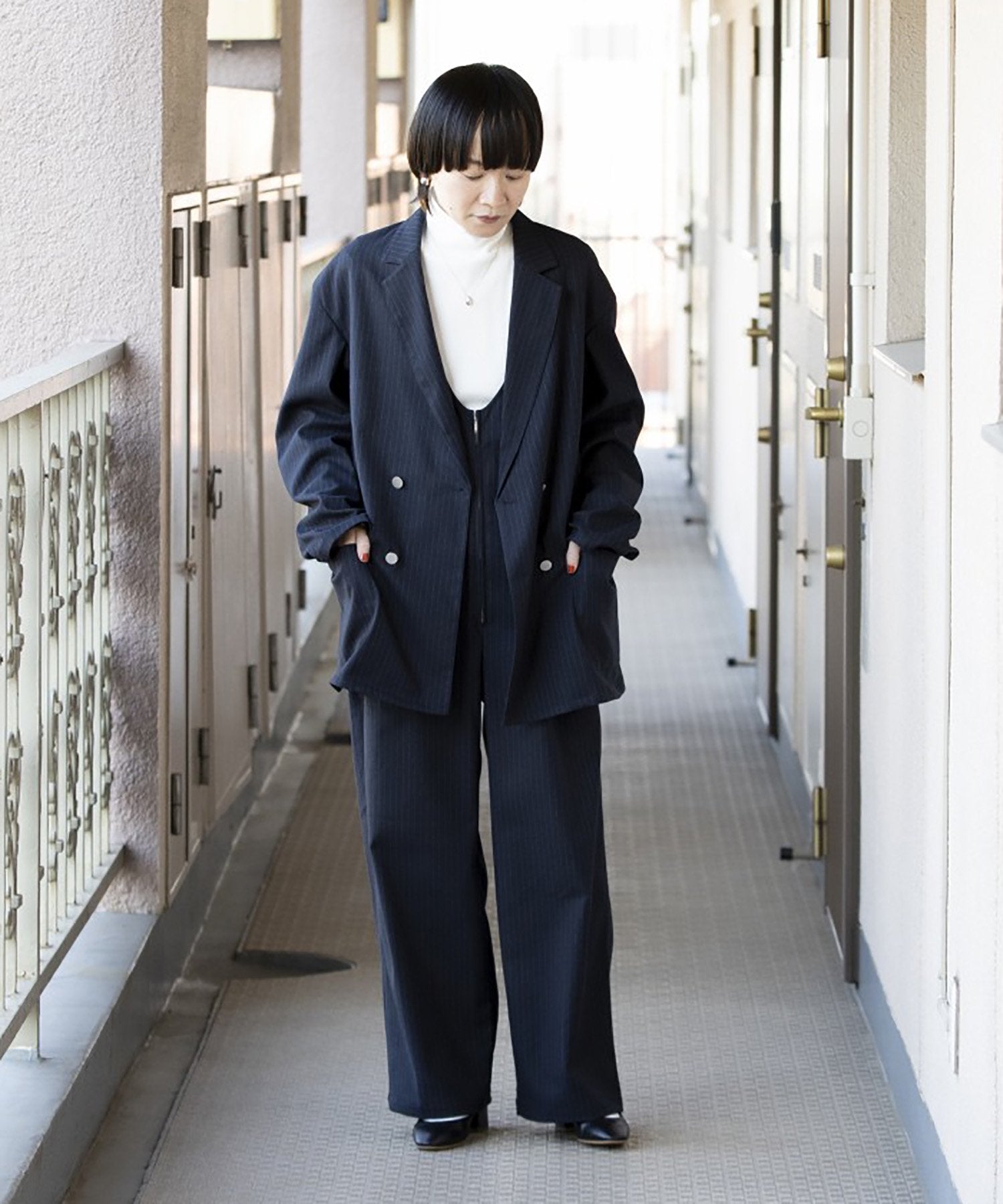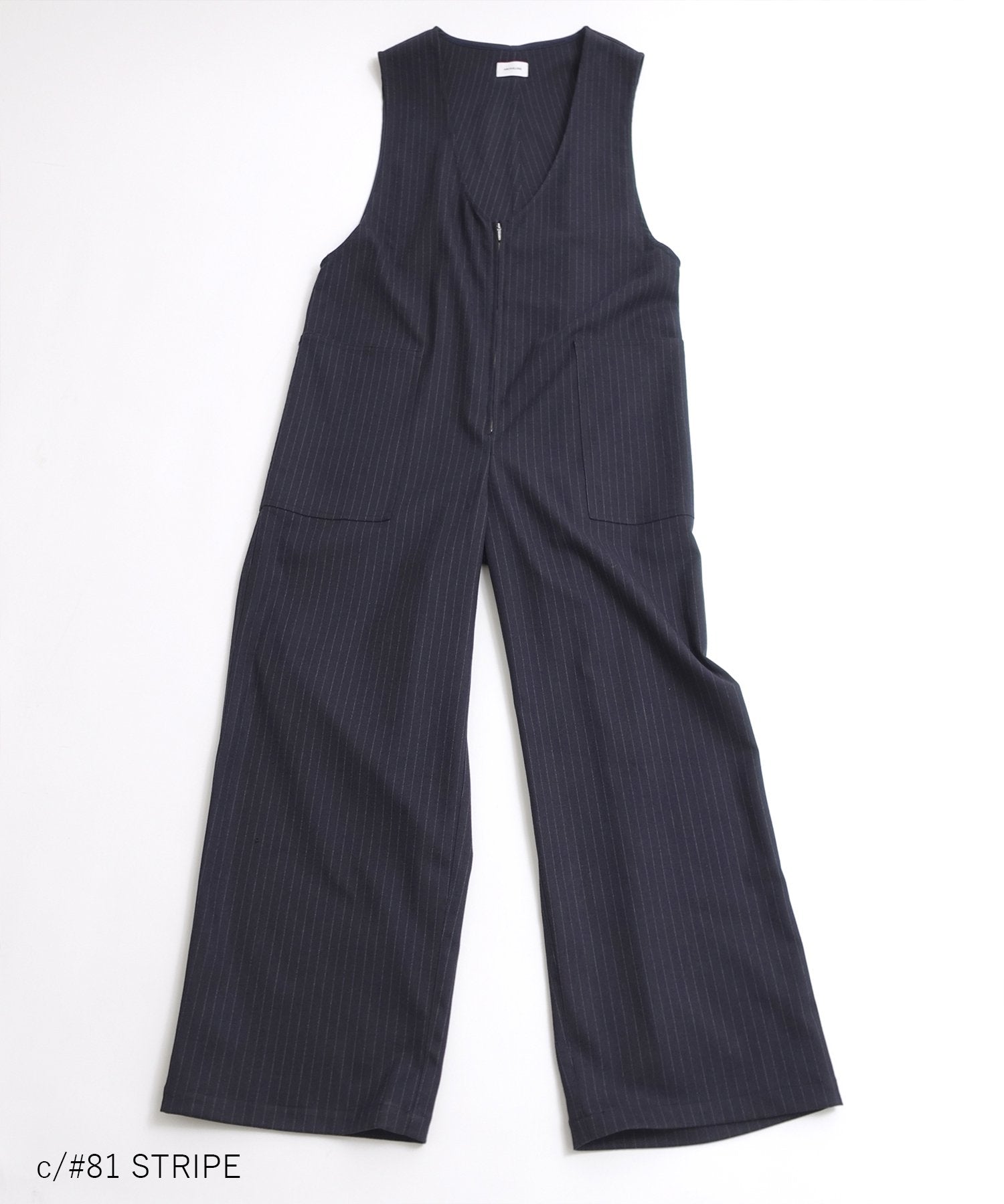 U-neck overalls that are popular among people of all ages and genders are now available in beautiful materials. The extra room around the hips and hem width makes it easier to move and more comfortable. There are four pockets on the waist, which are also a design point. It has been adjusted so that it fits well with a double jacket made of the same material.