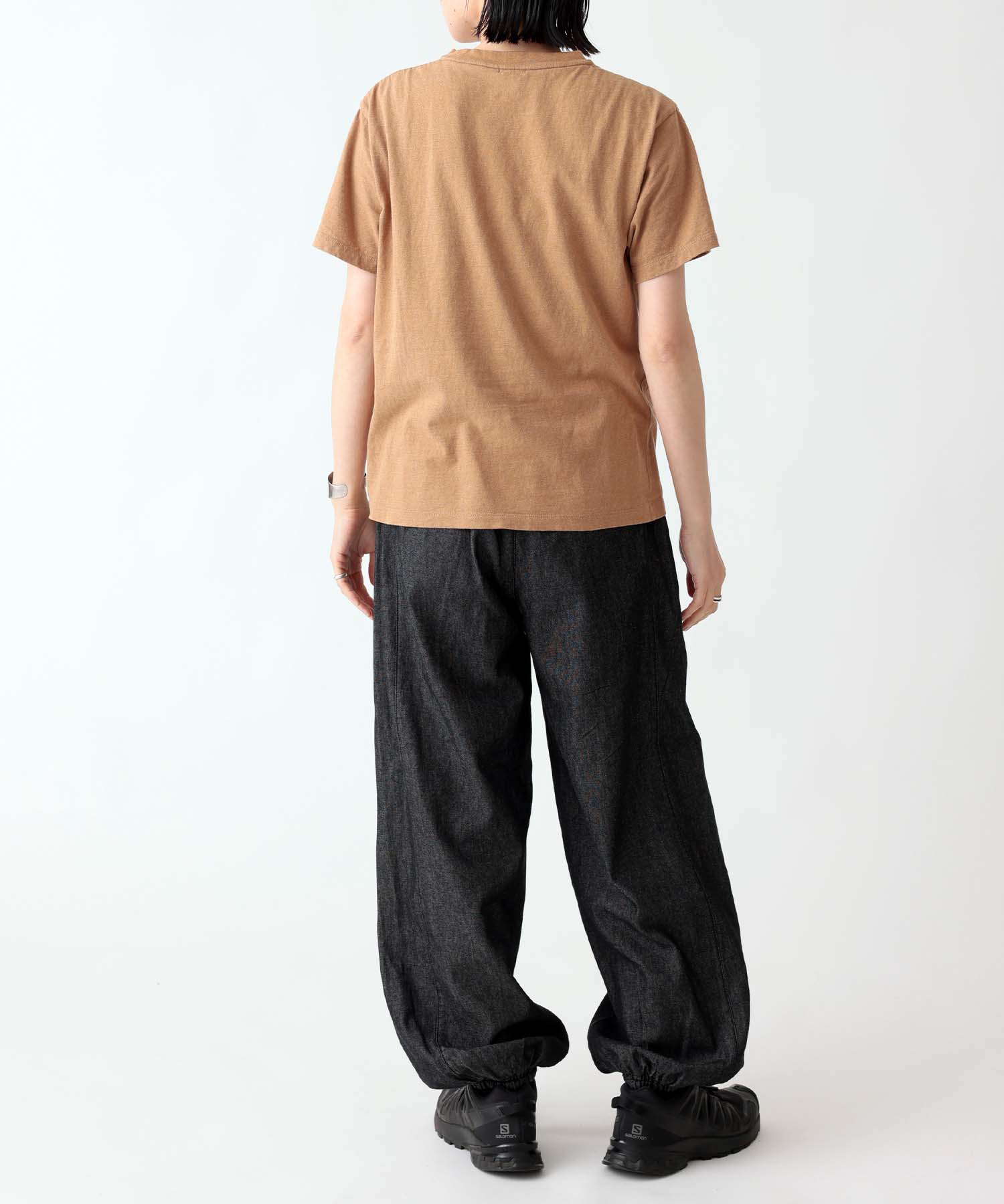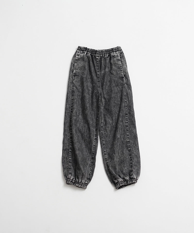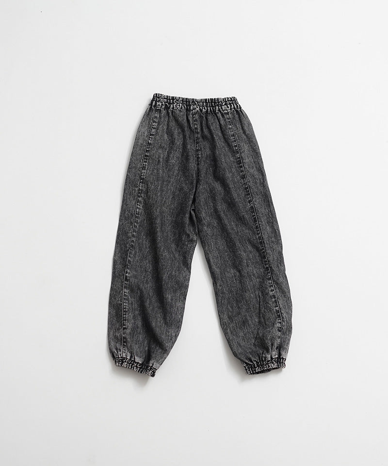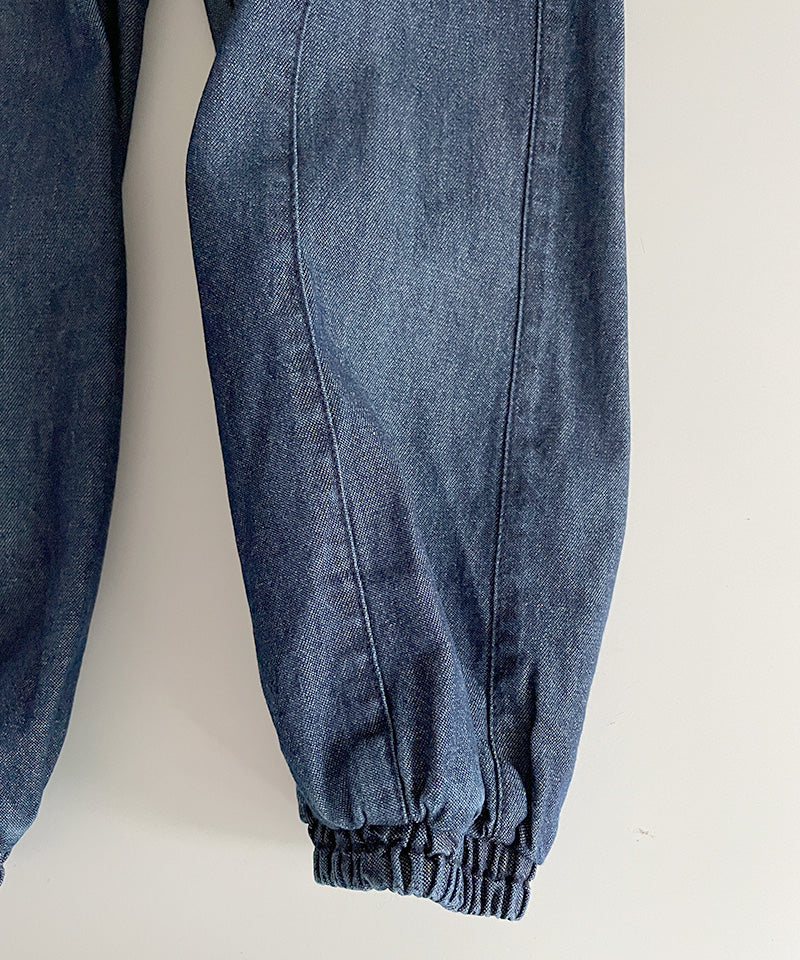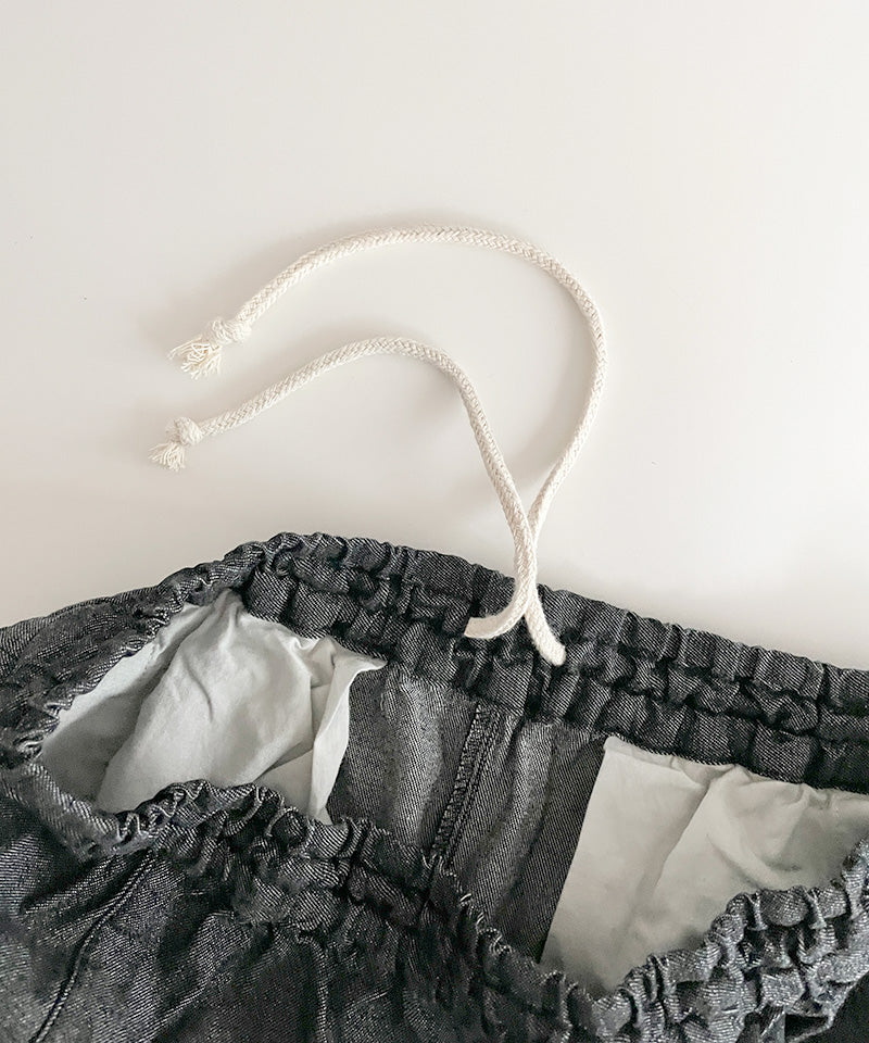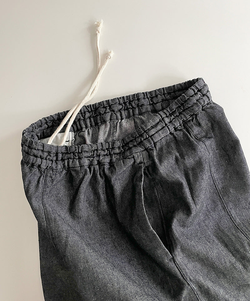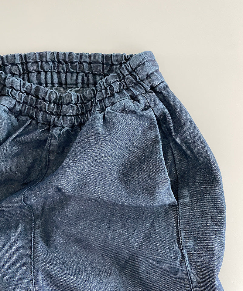 人気のアラジンパンツがデニム素材で登場。アラジンが履いているパンツに似ていることが名前の由来。脇の切り替えがポイント。裾にゴムを入れることで自転車にも乗りやすい作りになっています。ウエストゴムは、通常1本のところを細いゴムを3本通すことで肌当たりが柔らかくなるよう仕上げています。また、パターンを工夫することで足を上げやすくなっています。おうちでリラックスする時にも便利な一着です。
