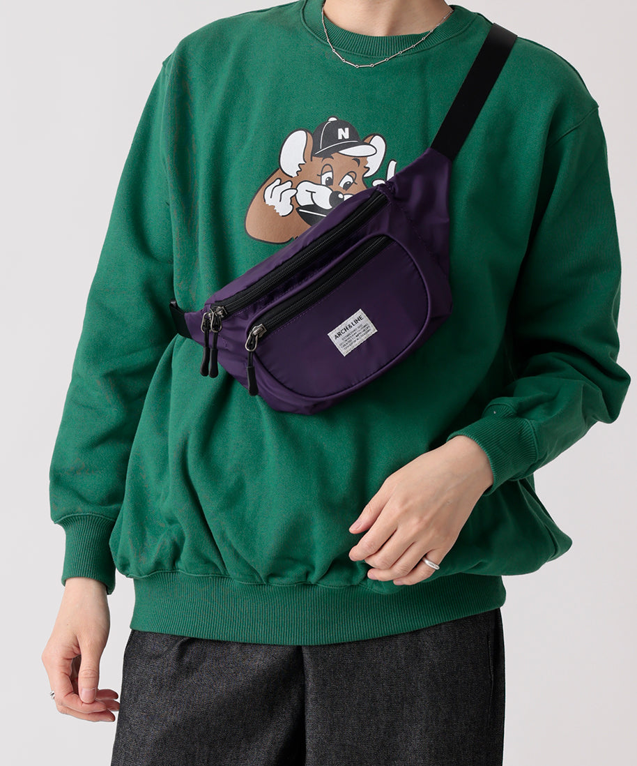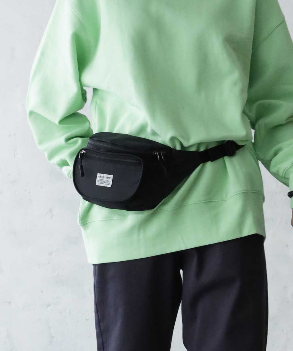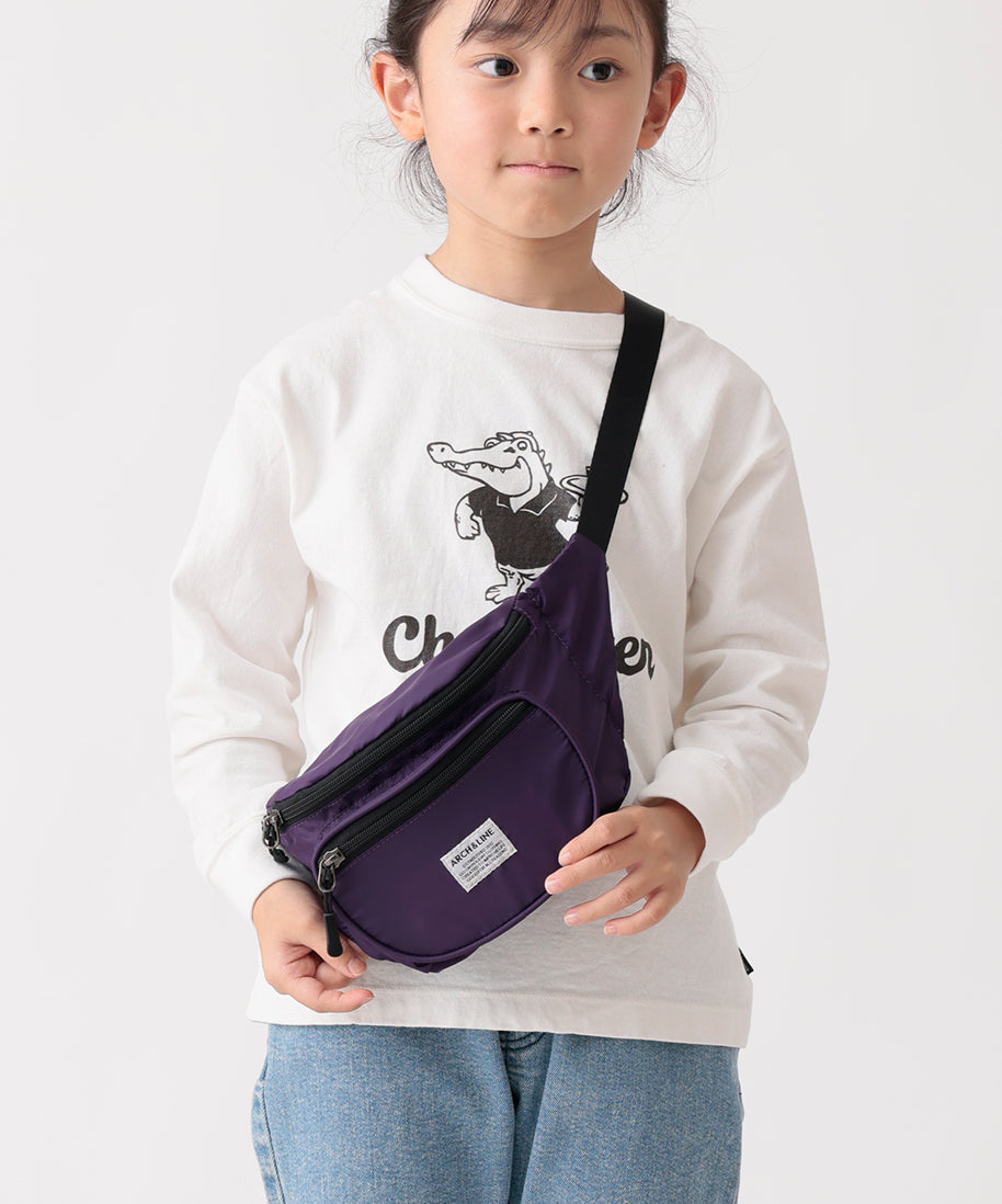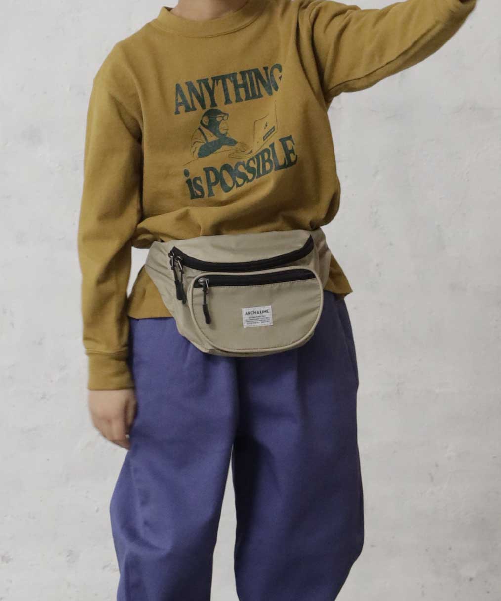 リサイクルナイロンを使用したウエストバッグ。古着屋さんに売っていそうなレトロなイメージで作りました。外側に二つポケット付き。グリーン、パープルはスタイリングのポイントに。大人まで使用可能。ARCH&LINEのブランドネームがポイントになっています。同素材を使用したジッププルオーバーと合わせたスタイリングも可能。