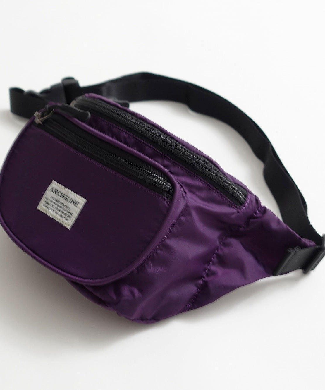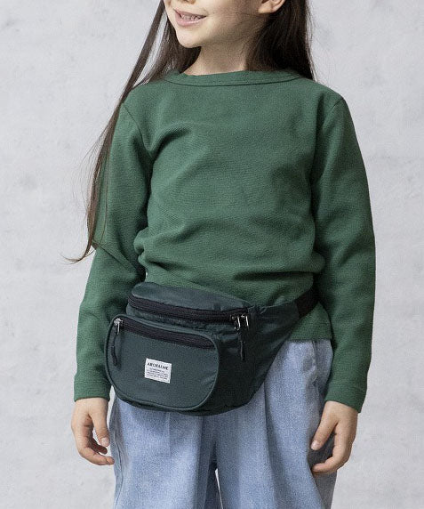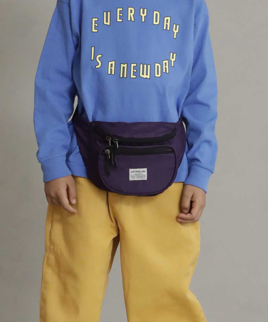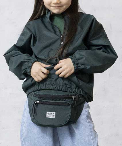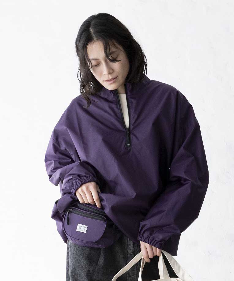 リサイクルナイロンを使用したウエストバッグ。古着屋さんに売っていそうなレトロなイメージで作りました。外側に二つポケット付き。グリーン、パープルはスタイリングのポイントに。大人まで使用可能。ARCH&LINEのブランドネームがポイントになっています。同素材を使用したジッププルオーバーと合わせたスタイリングも可能。