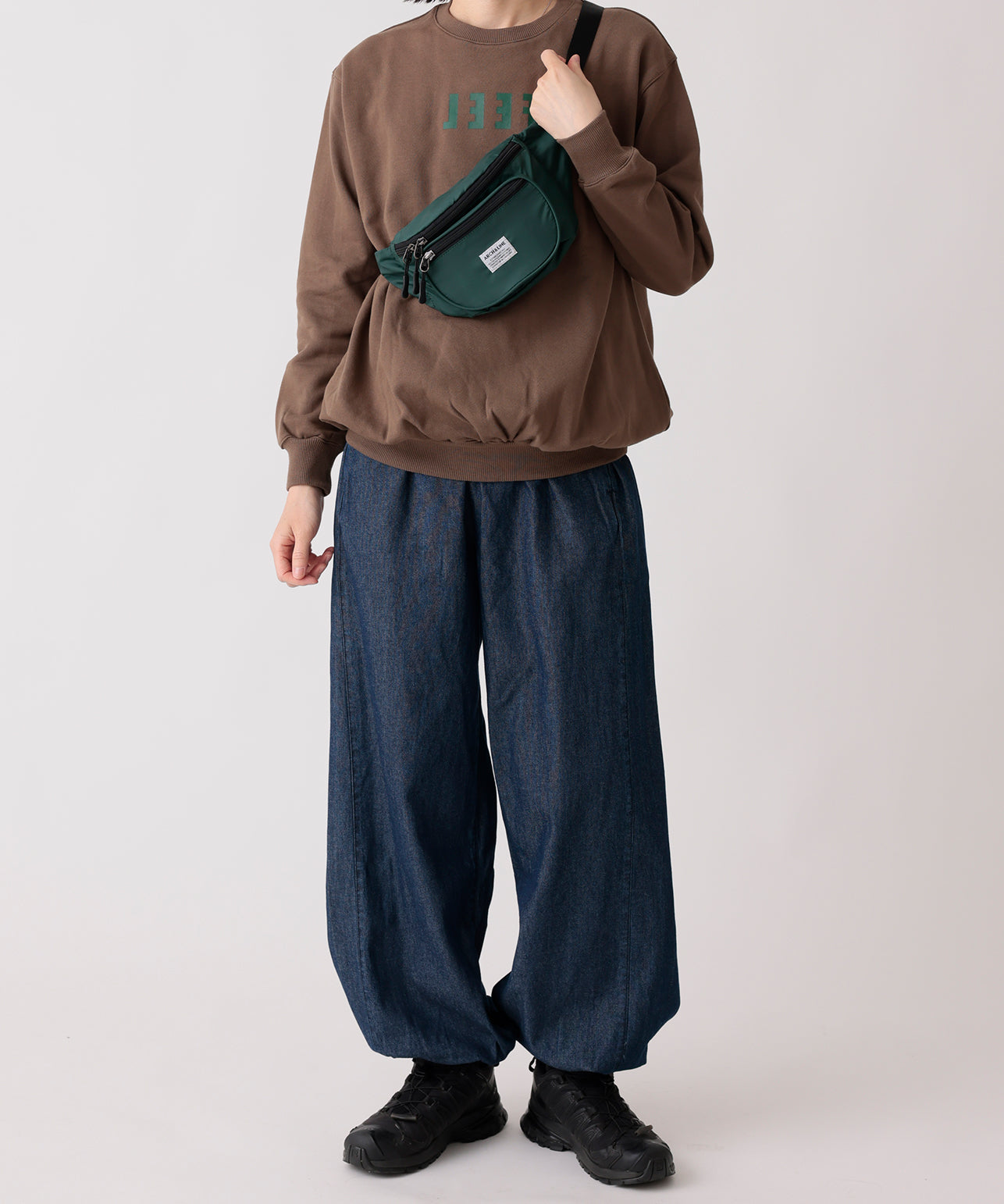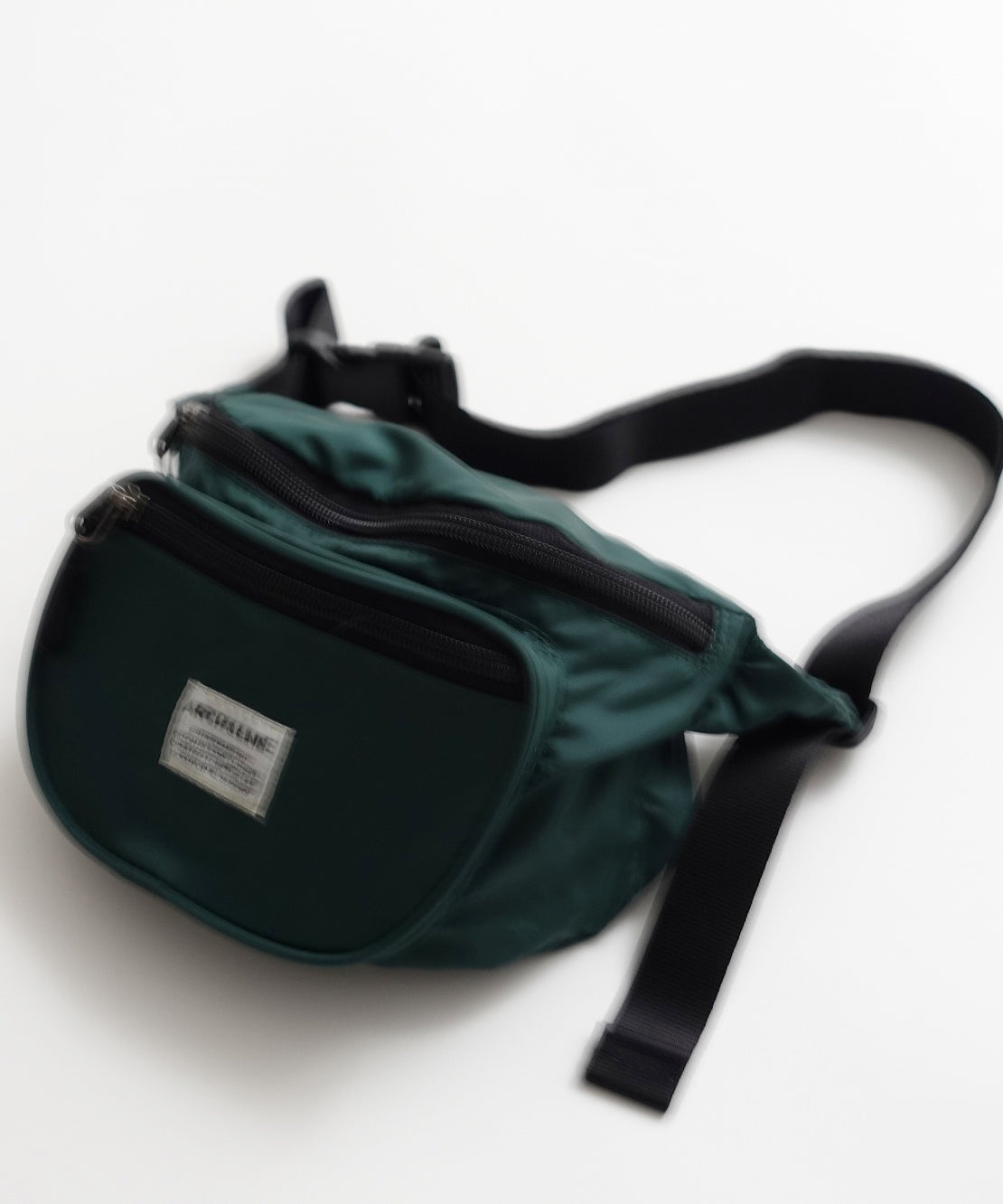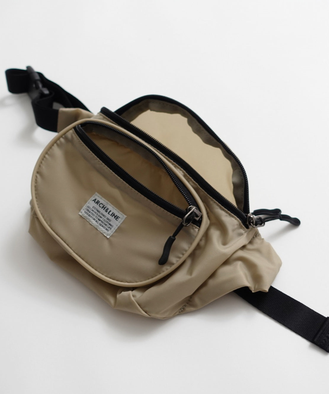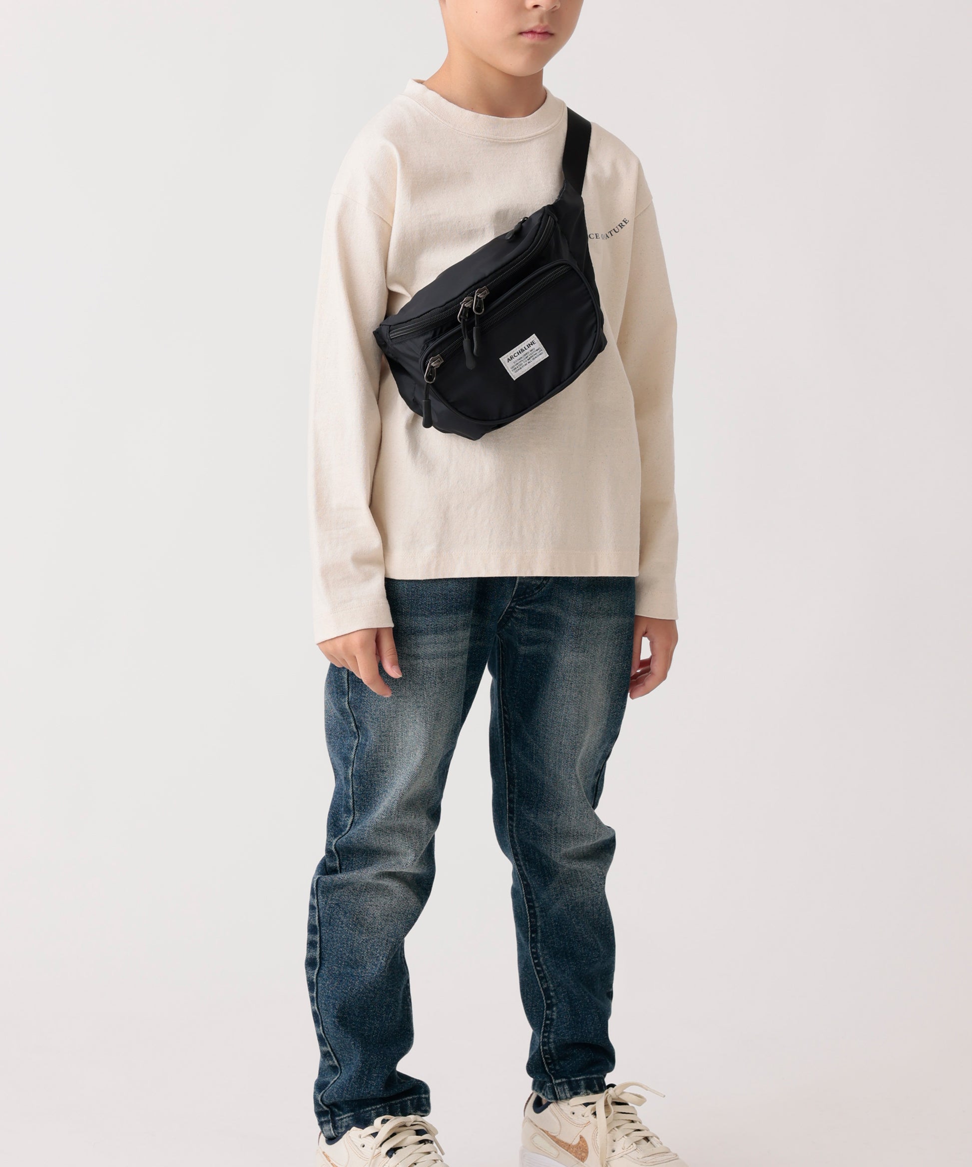 リサイクルナイロンを使用したウエストバッグ。古着屋さんに売っていそうなレトロなイメージで作りました。外側に二つポケット付き。グリーン、パープルはスタイリングのポイントに。大人まで使用可能。ARCH&LINEのブランドネームがポイントになっています。同素材を使用したジッププルオーバーと合わせたスタイリングも可能。