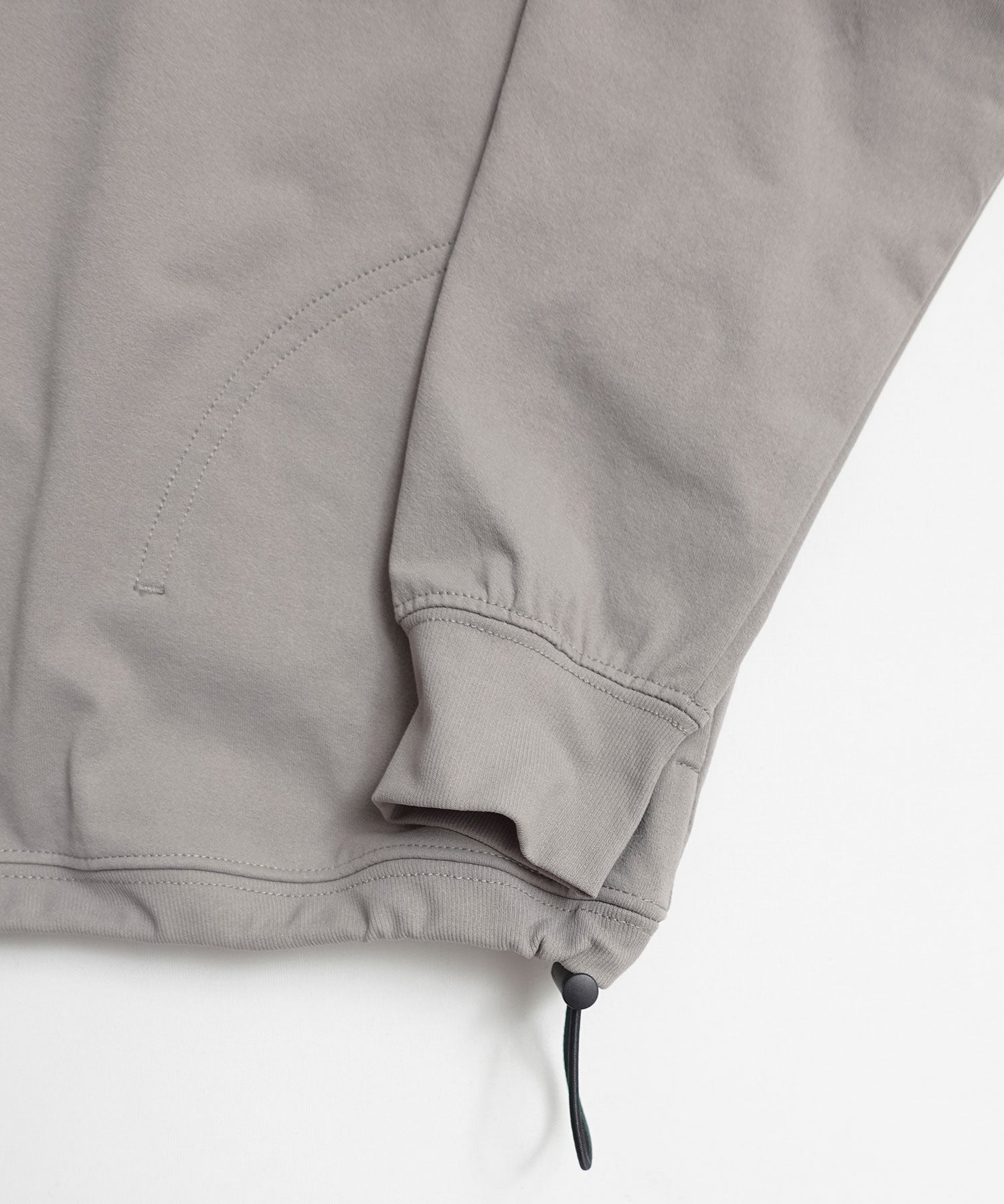 ラッシュガード素材を天竺で編み立てました。軽量でキックバックがあり、ダレにくいのが特徴。収縮率の違う糸で編み立て、メランジ風の見え方に。・UPF50(紫外線保護指数)