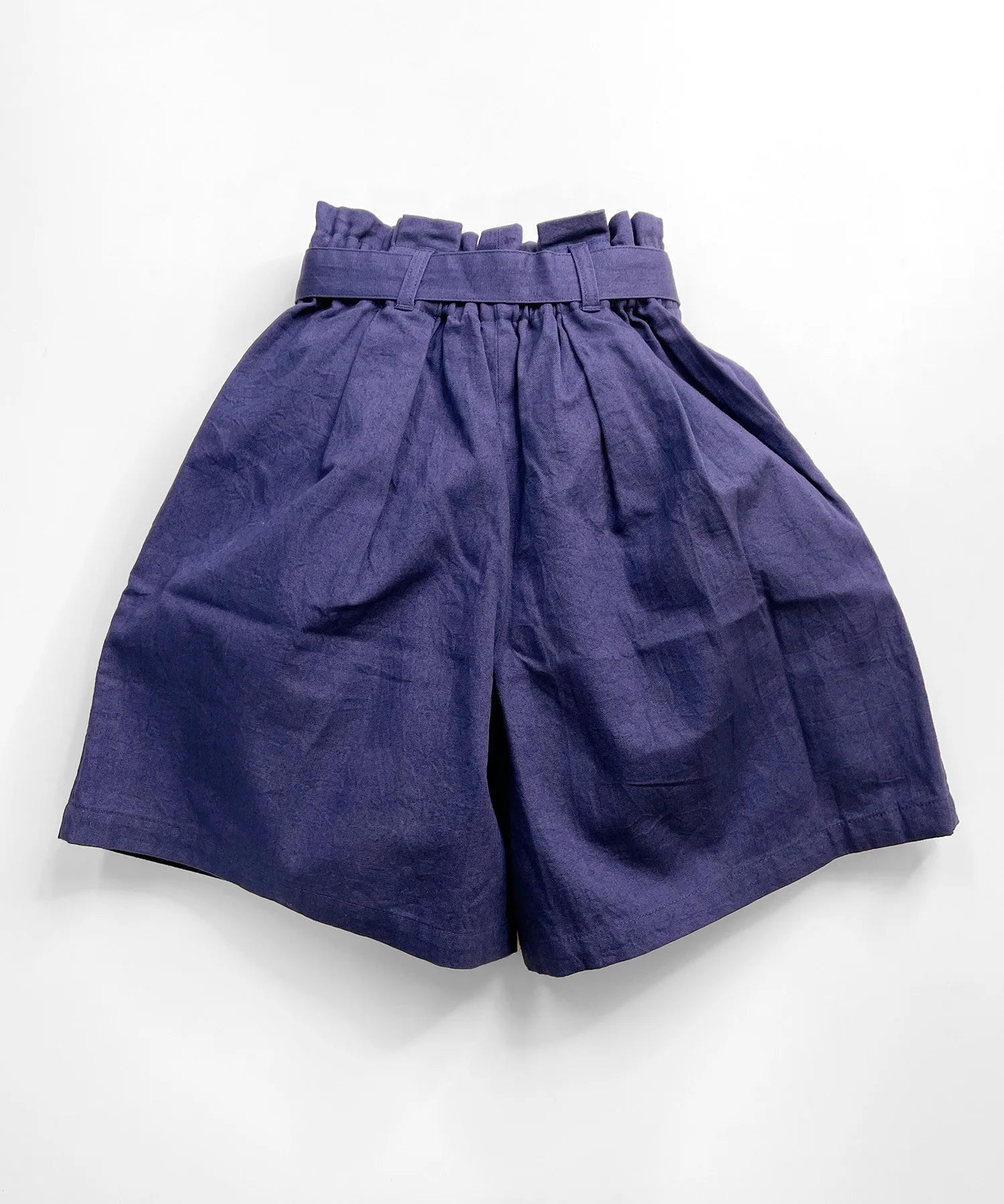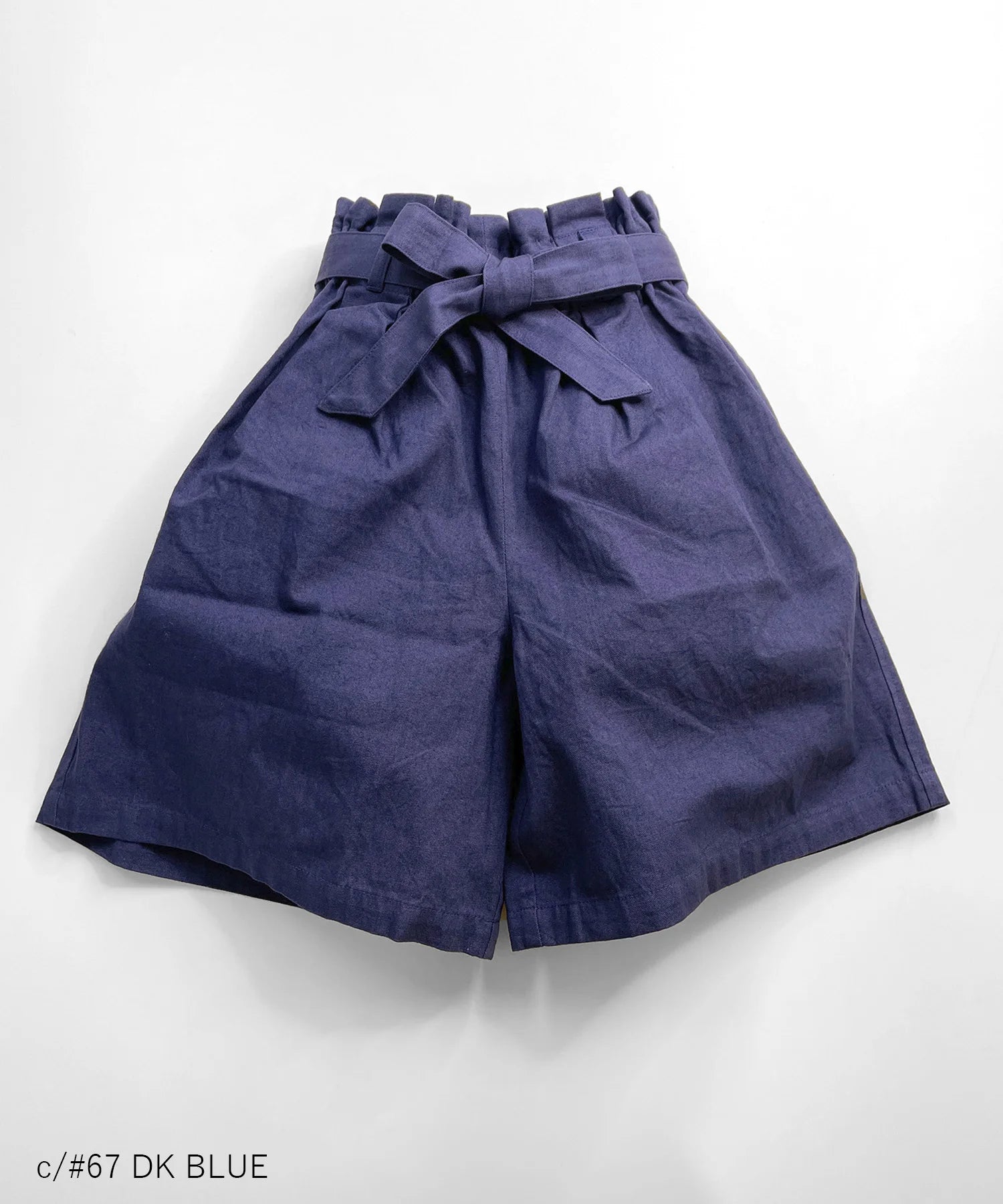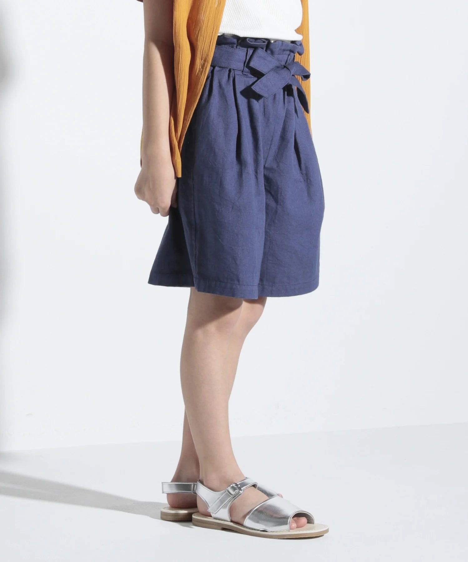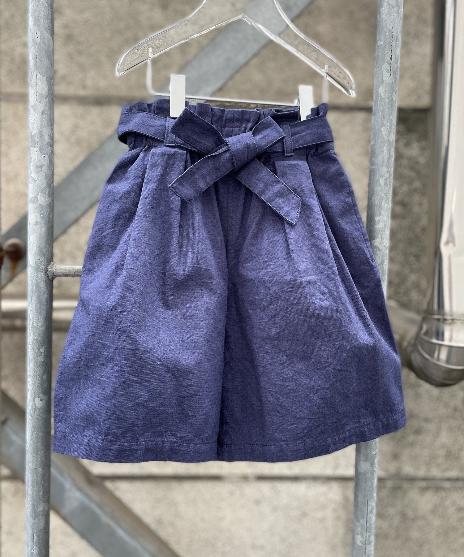 ワッシャー加工を施したコットンオックスを使用したキュロット。元気いっぱいな丈感の中にも落ち着いた雰囲気を残せるようディテールを追求しました。タック使いにより、着ると立体的なシルエットに。広がり過ぎない裾幅なので、低学年から高学年まで年齢を選びません。共地のベルトを付けてTシャツをインし、リボン結びを見せるスタイリングがおすすめ。