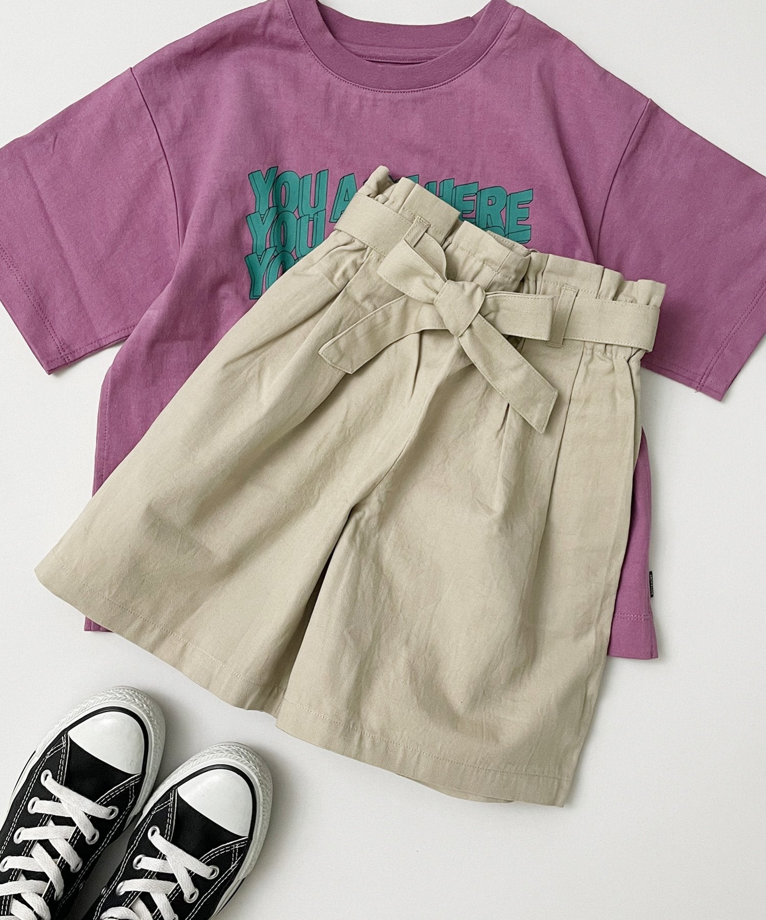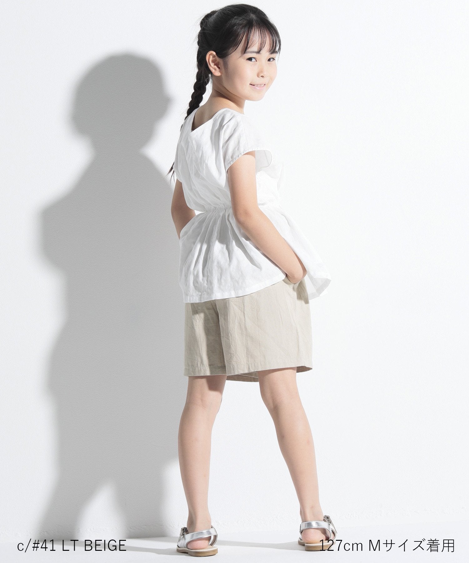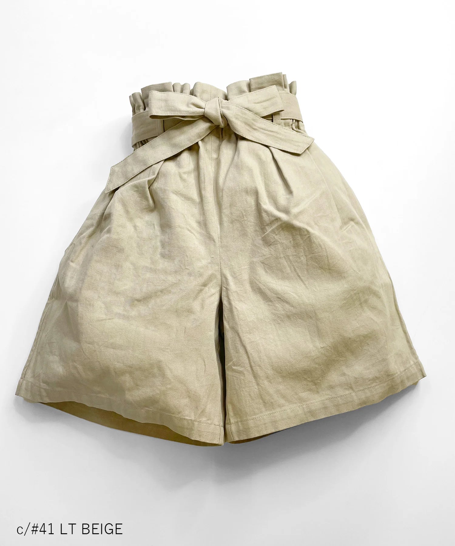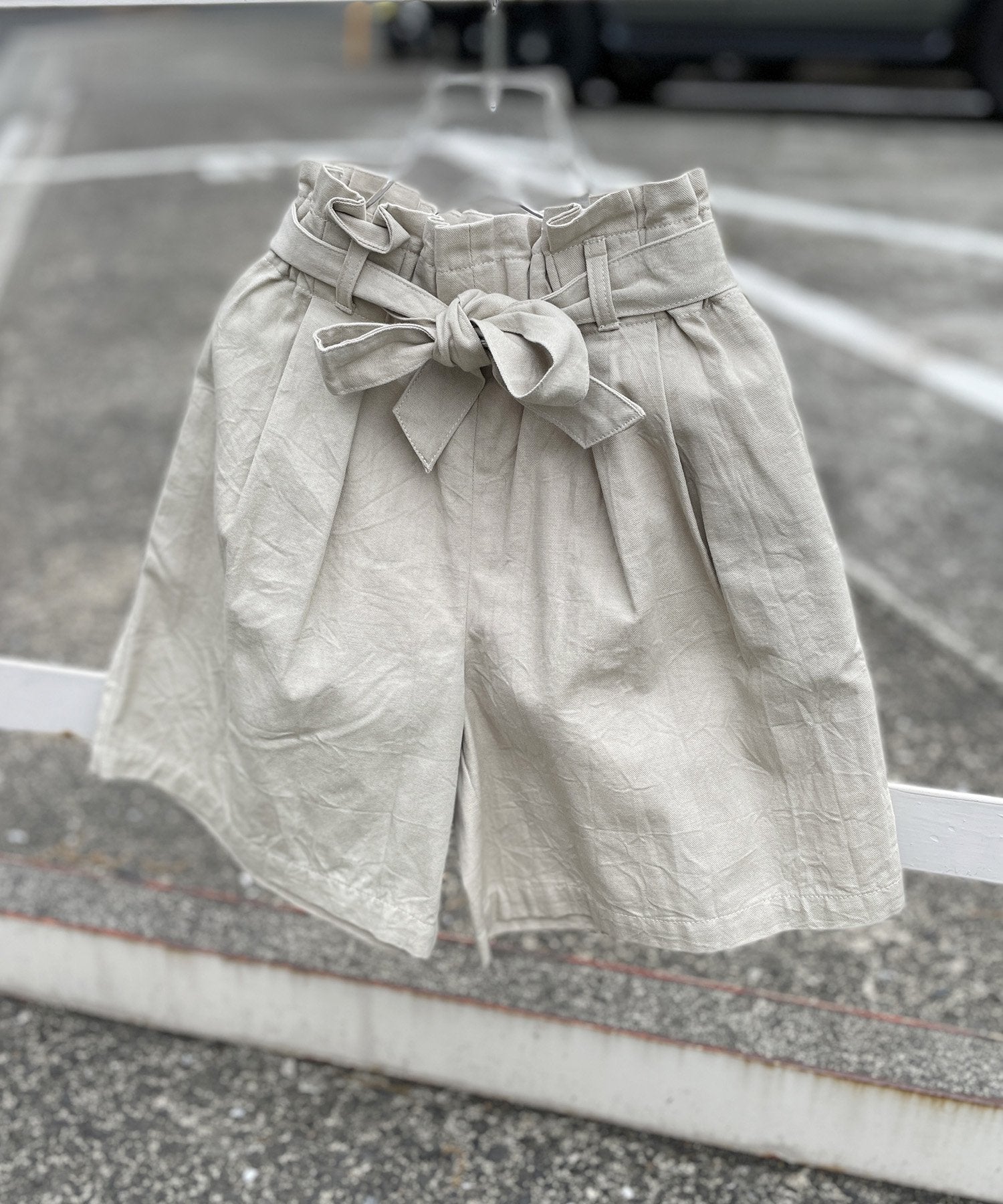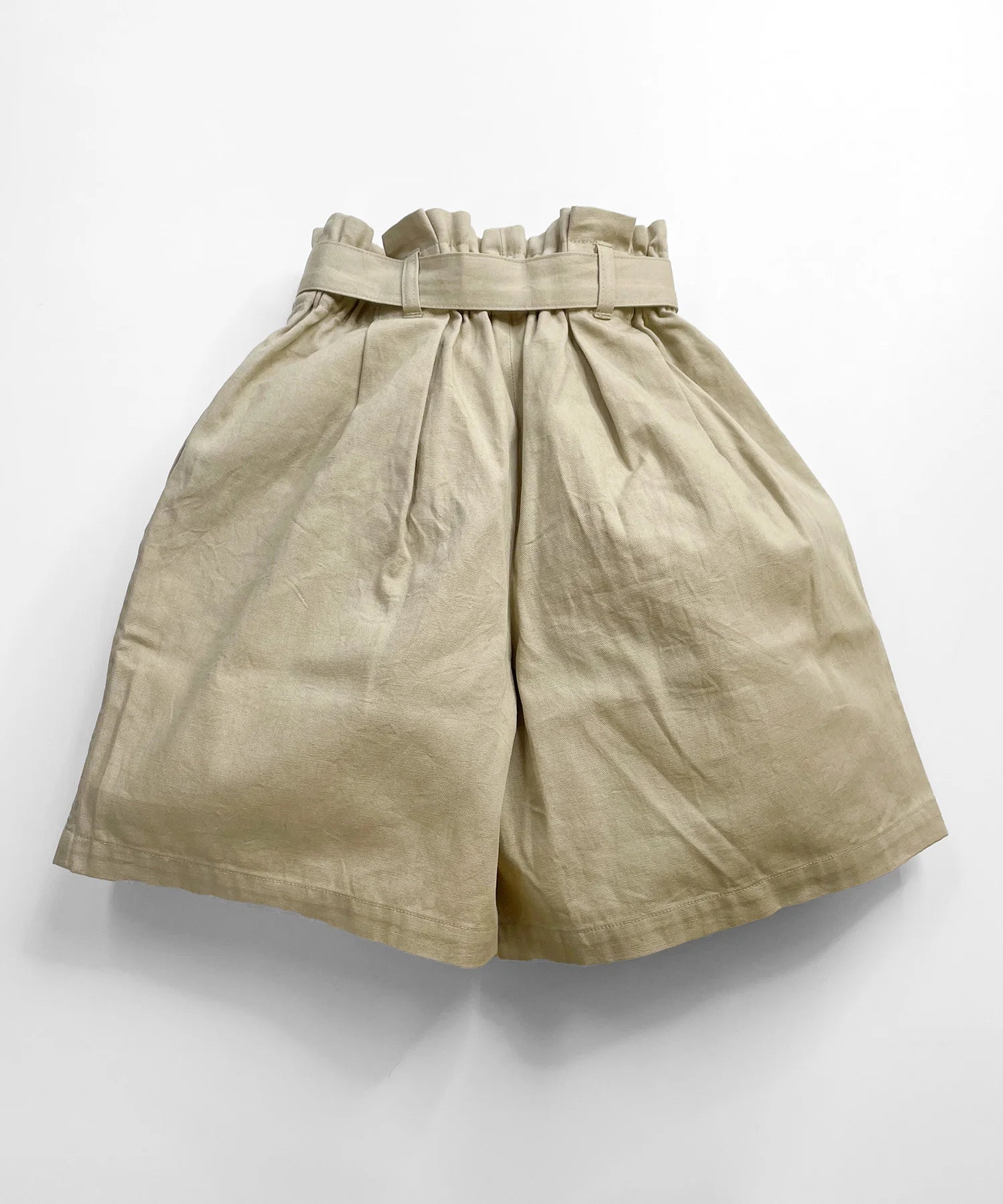 ワッシャー加工を施したコットンオックスを使用したキュロット。元気いっぱいな丈感の中にも落ち着いた雰囲気を残せるようディテールを追求しました。タック使いにより、着ると立体的なシルエットに。広がり過ぎない裾幅なので、低学年から高学年まで年齢を選びません。共地のベルトを付けてTシャツをインし、リボン結びを見せるスタイリングがおすすめ。