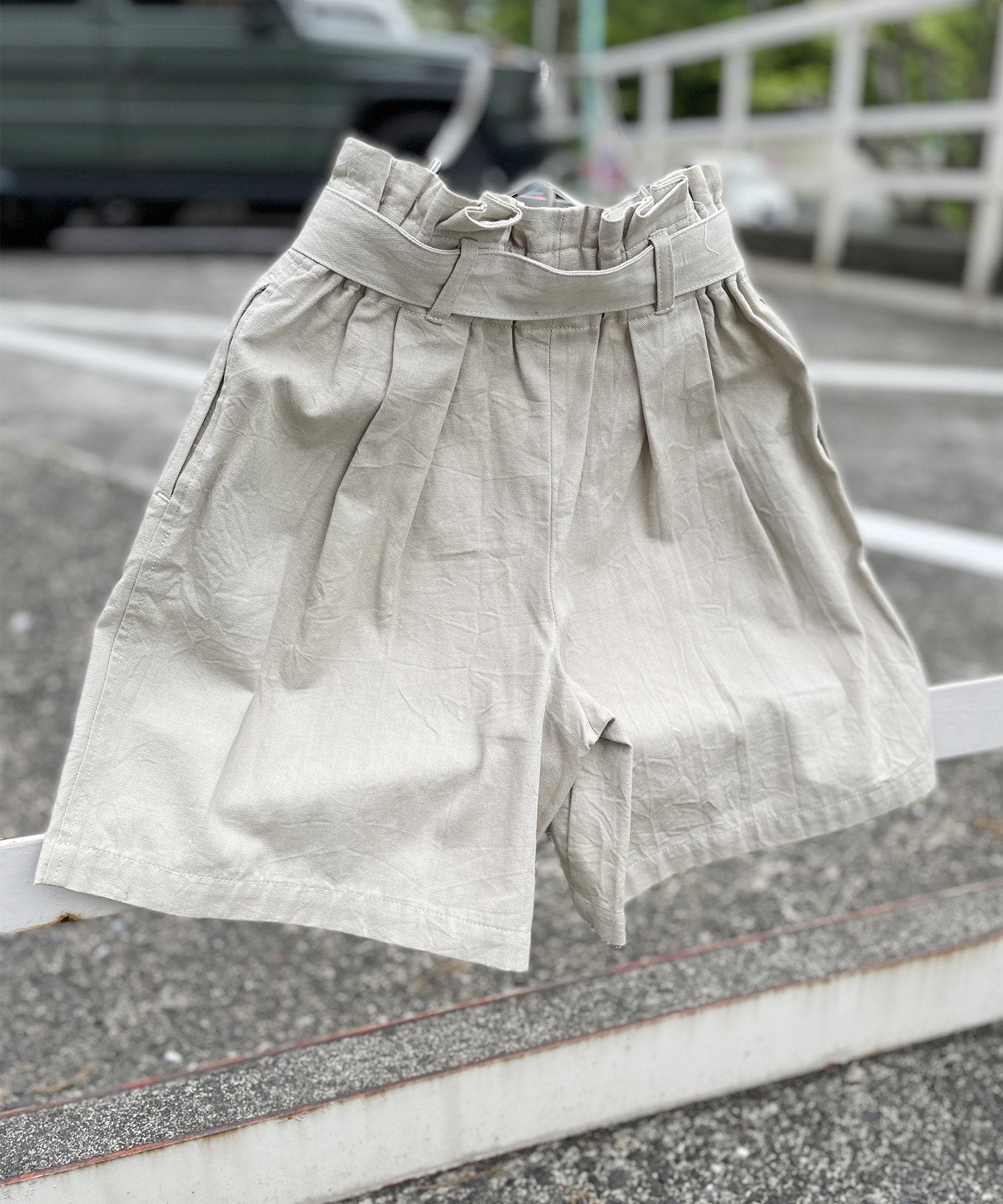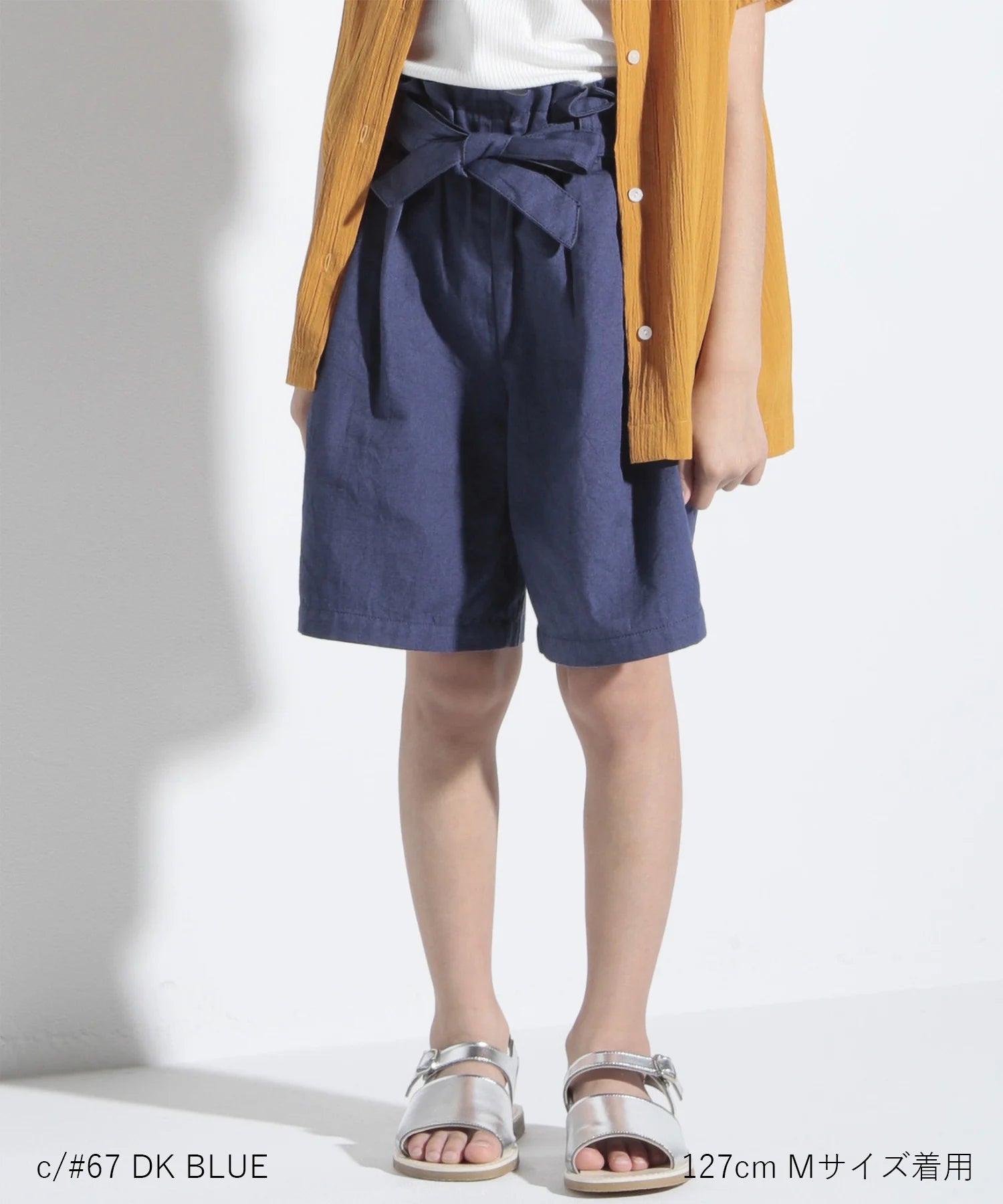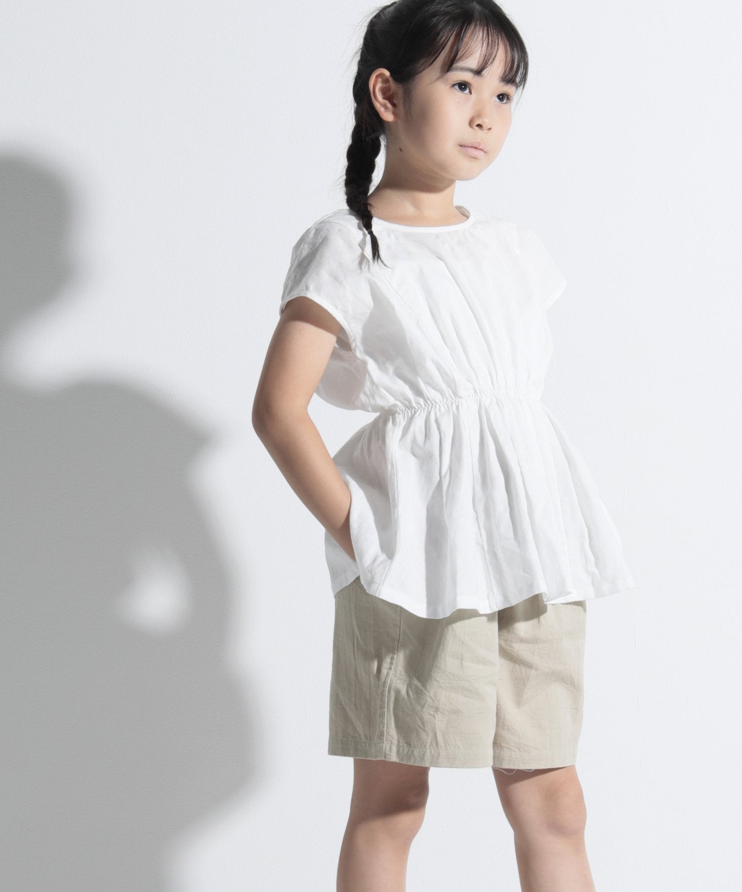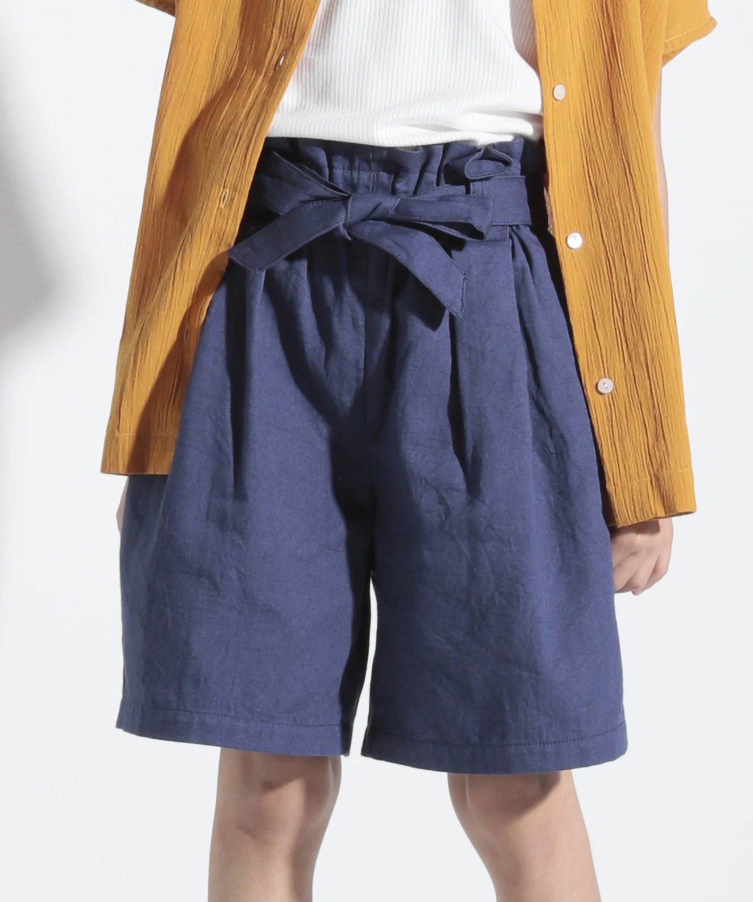 ワッシャー加工を施したコットンオックスを使用したキュロット。元気いっぱいな丈感の中にも落ち着いた雰囲気を残せるようディテールを追求しました。タック使いにより、着ると立体的なシルエットに。広がり過ぎない裾幅なので、低学年から高学年まで年齢を選びません。共地のベルトを付けてTシャツをインし、リボン結びを見せるスタイリングがおすすめ。