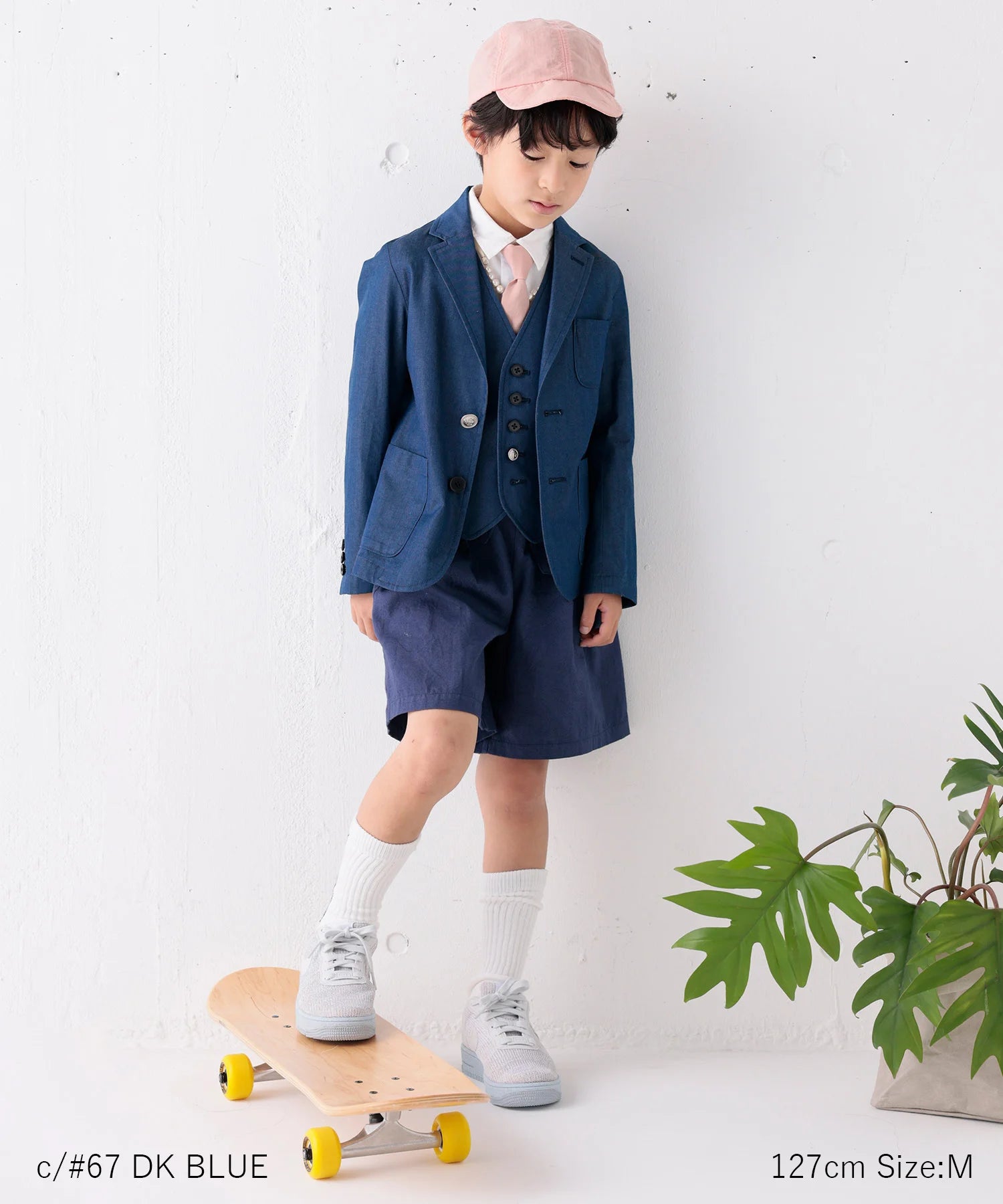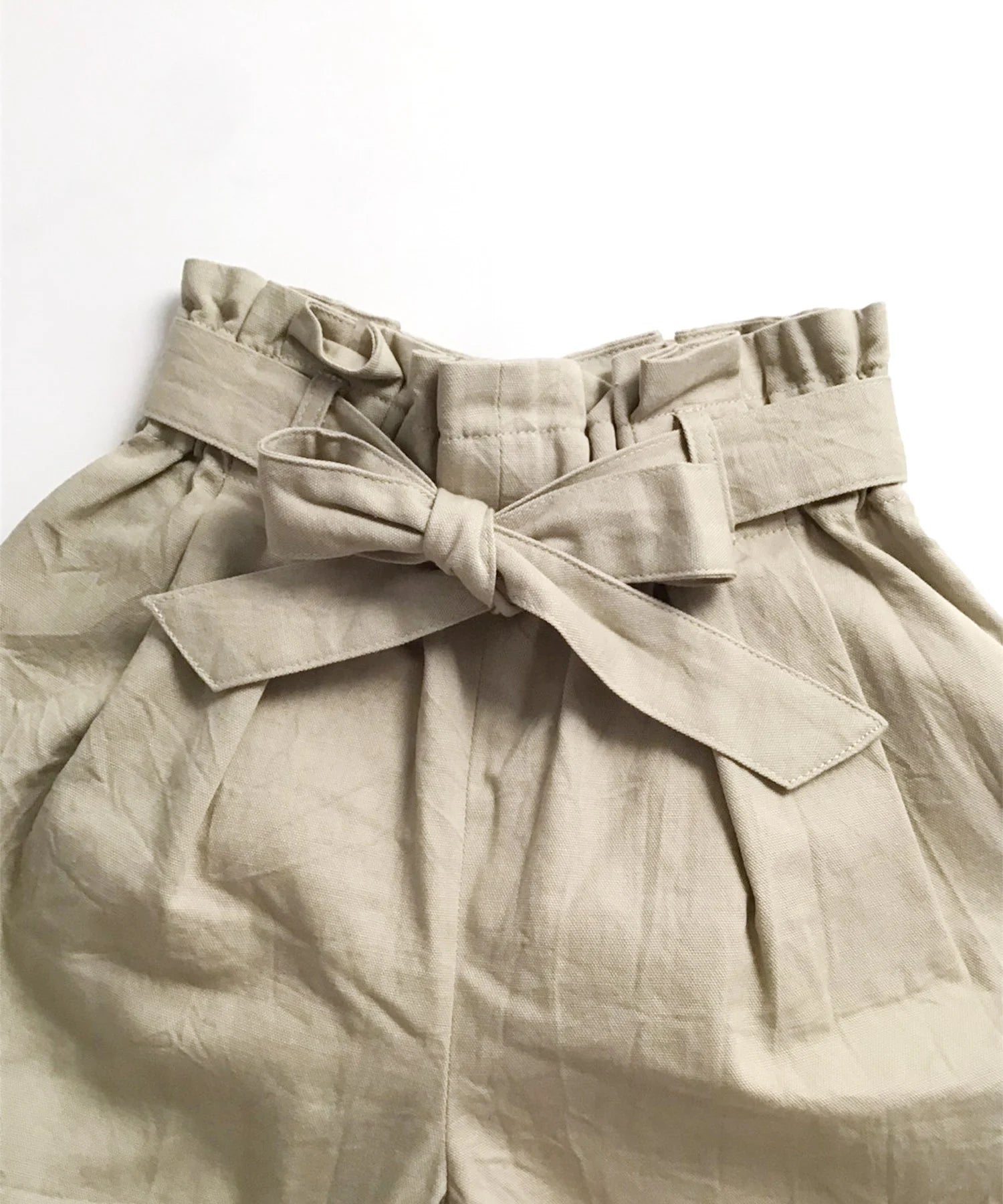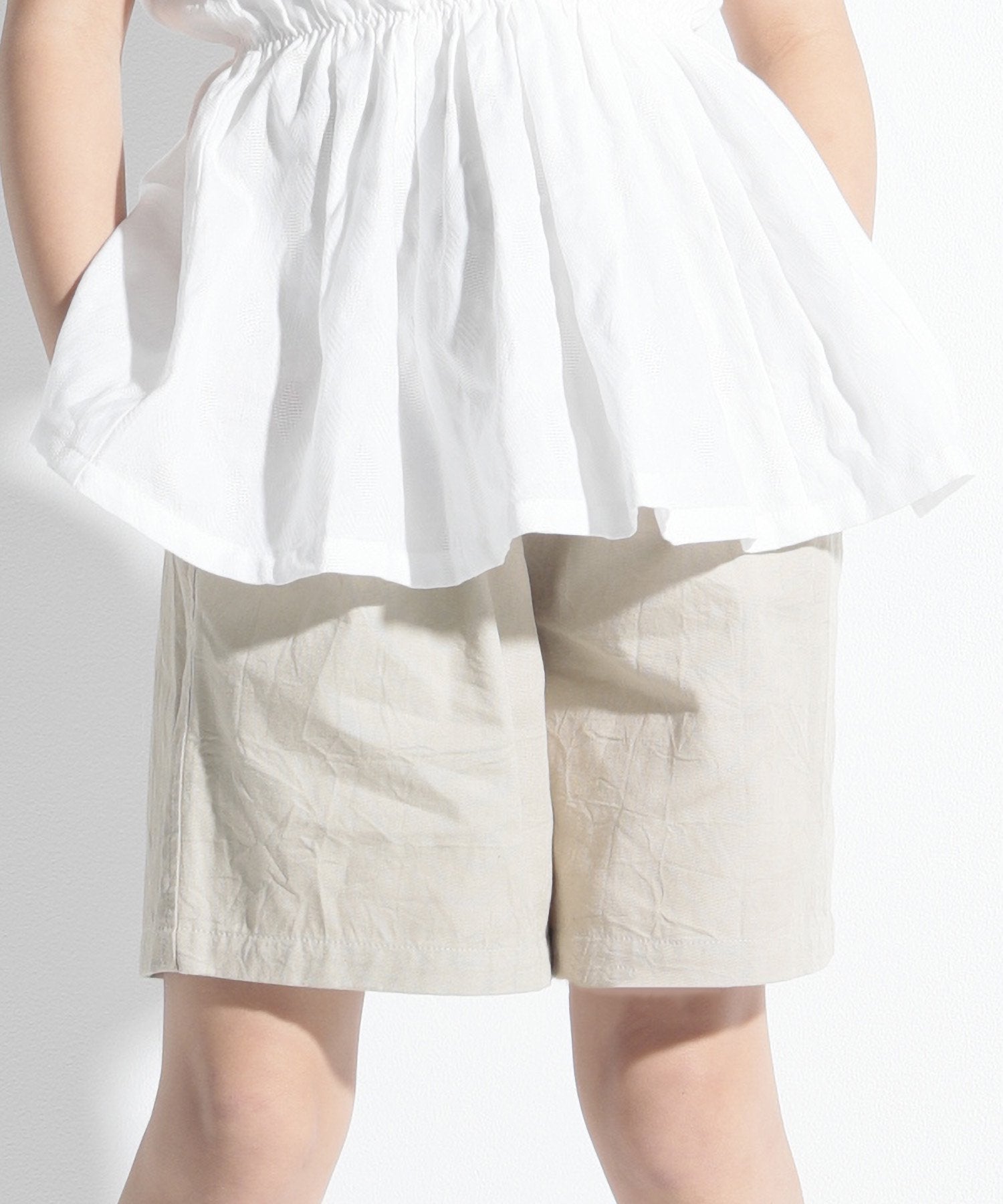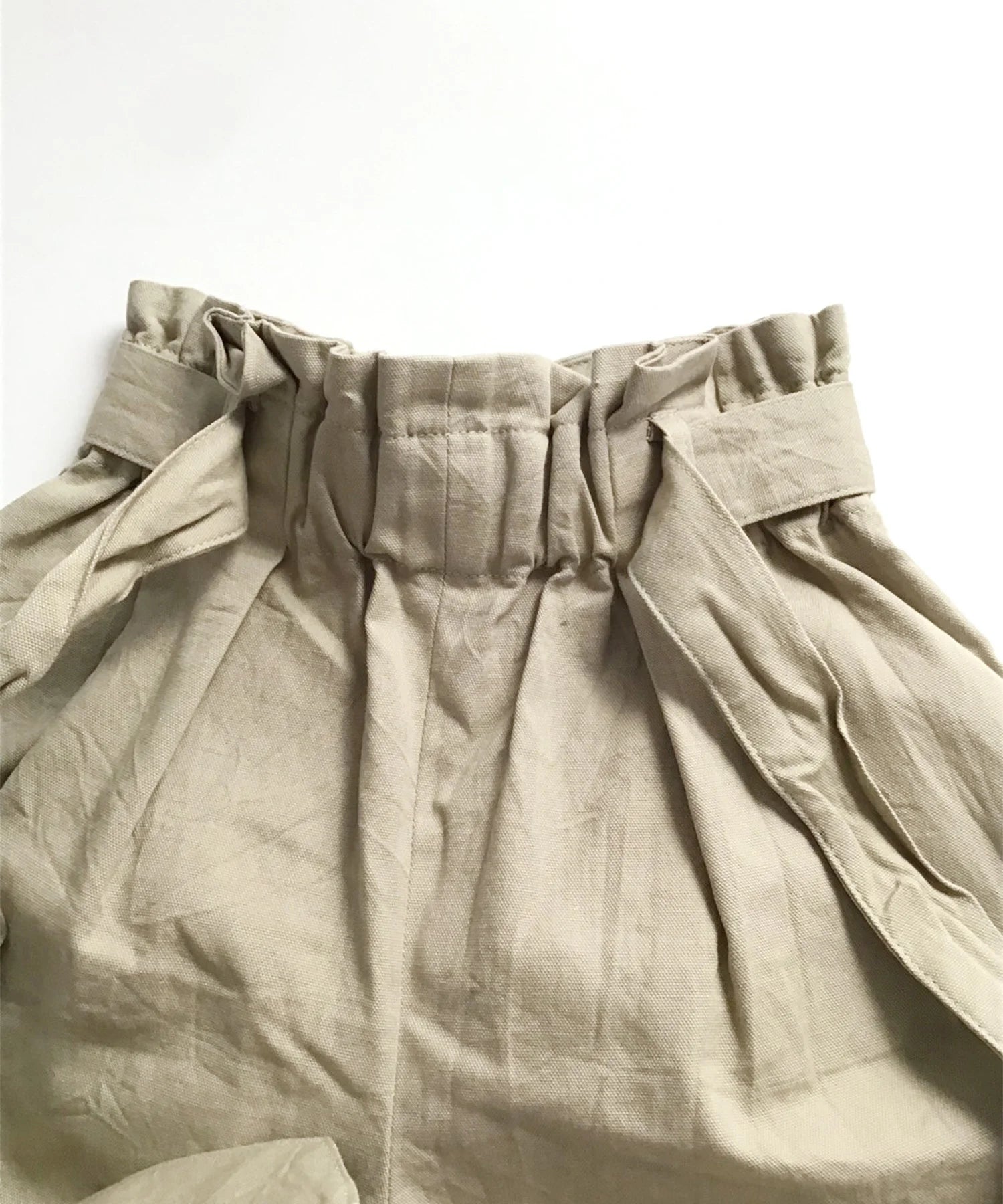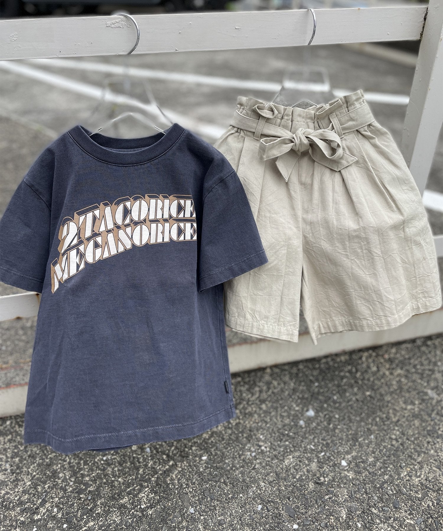 ワッシャー加工を施したコットンオックスを使用したキュロット。元気いっぱいな丈感の中にも落ち着いた雰囲気を残せるようディテールを追求しました。タック使いにより、着ると立体的なシルエットに。広がり過ぎない裾幅なので、低学年から高学年まで年齢を選びません。共地のベルトを付けてTシャツをインし、リボン結びを見せるスタイリングがおすすめ。