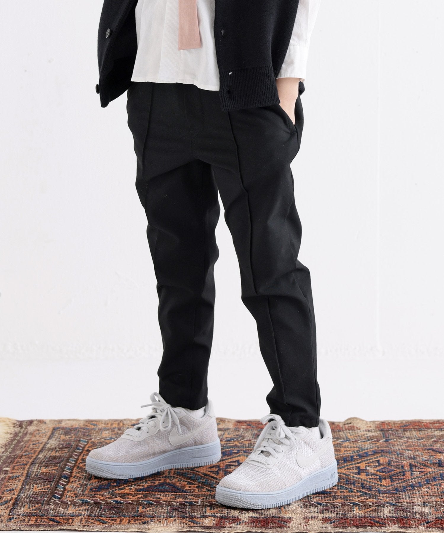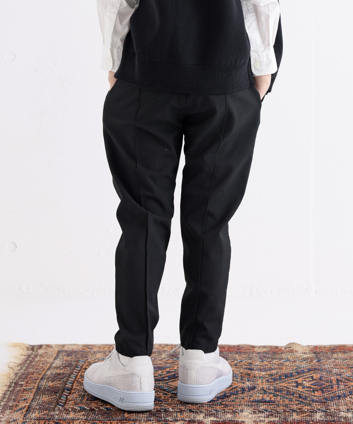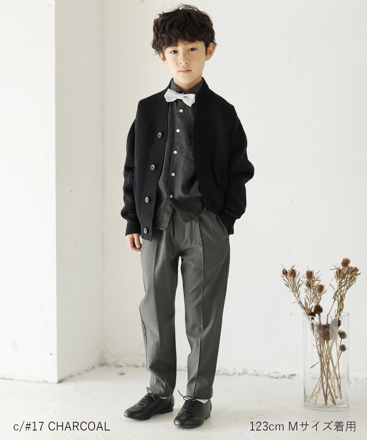 ■ディテール センタークリース入りで、式典から日常まで幅広く使えるキレイ目なイージーパンツ。スーツのボトムとしても使用しているパターン(型紙)をアレンジしたテーパード型の為、とてもスッキリとしたラインでバランスの取りやすい一着です。左脇にはゴム通し口があり、お好みや成長に合わせてゴムの入れ替えで調整していただけます。ウエストはリブの仕様になっており、小さなお子様でも着脱しやすく仕上げています。