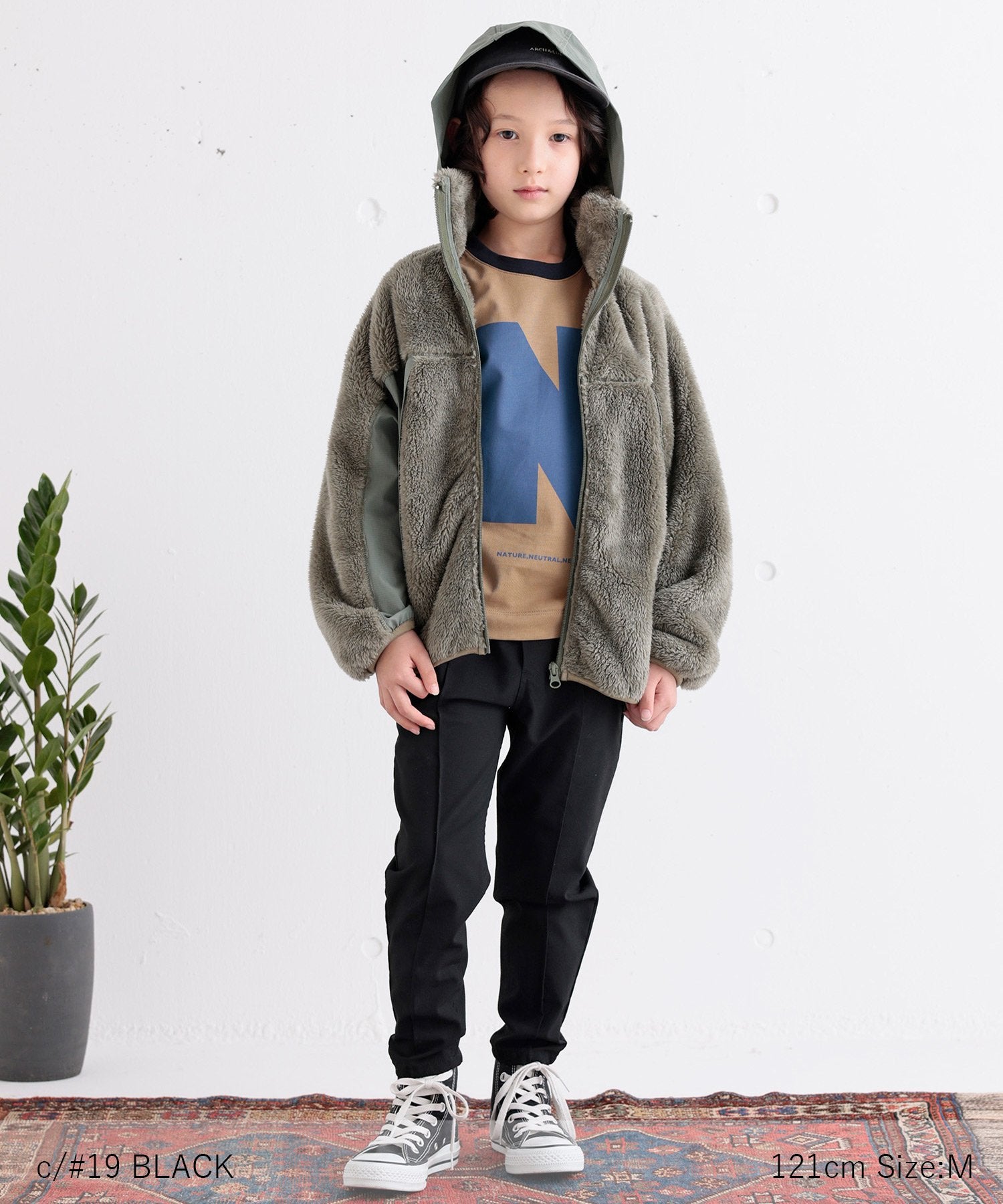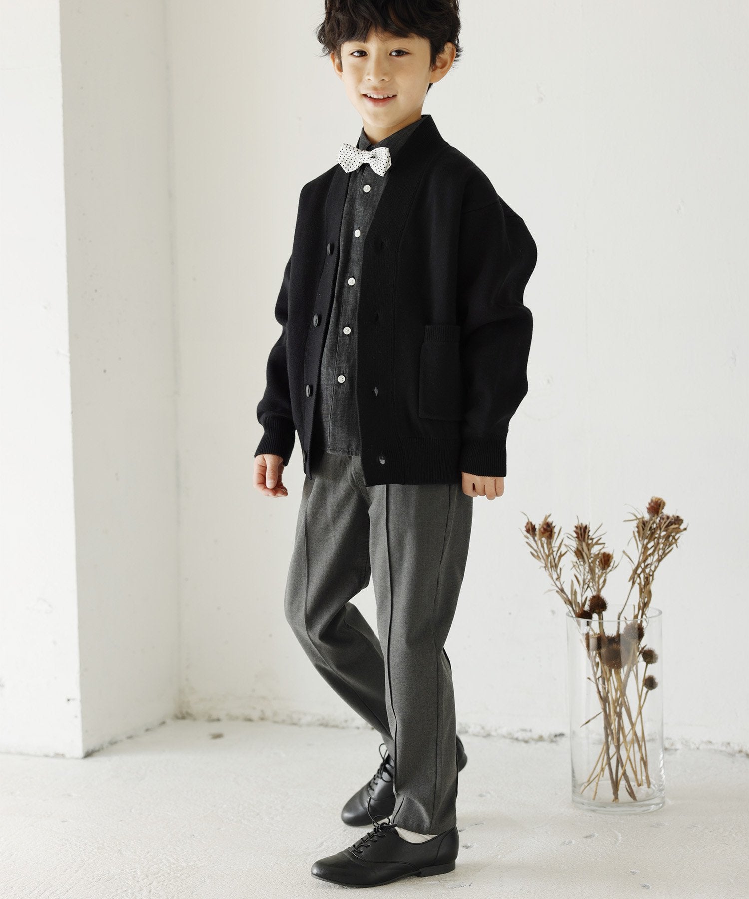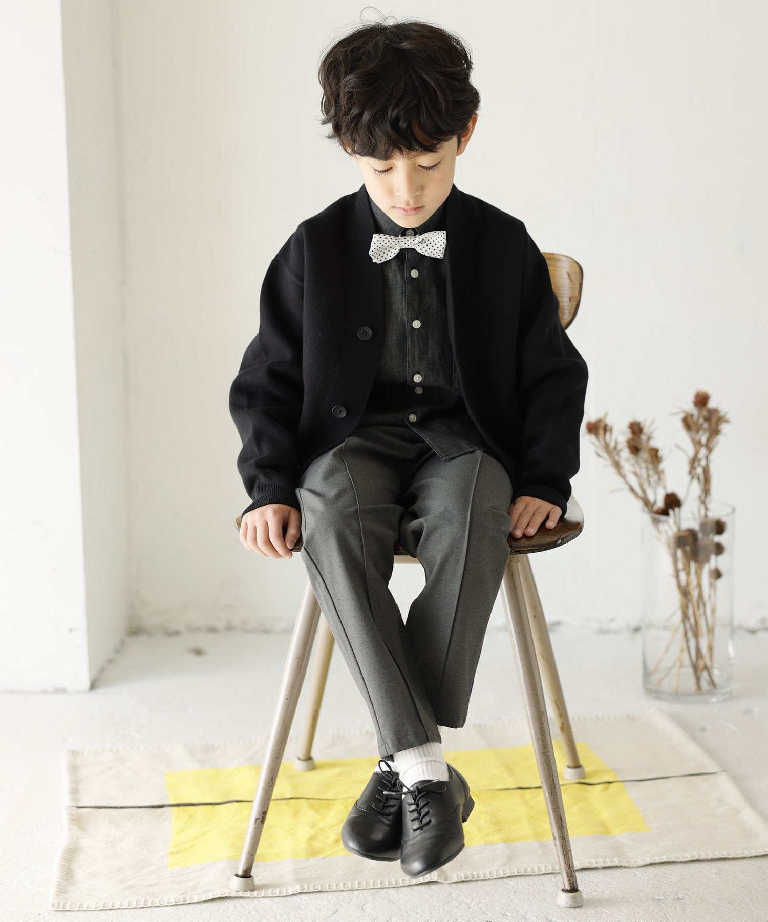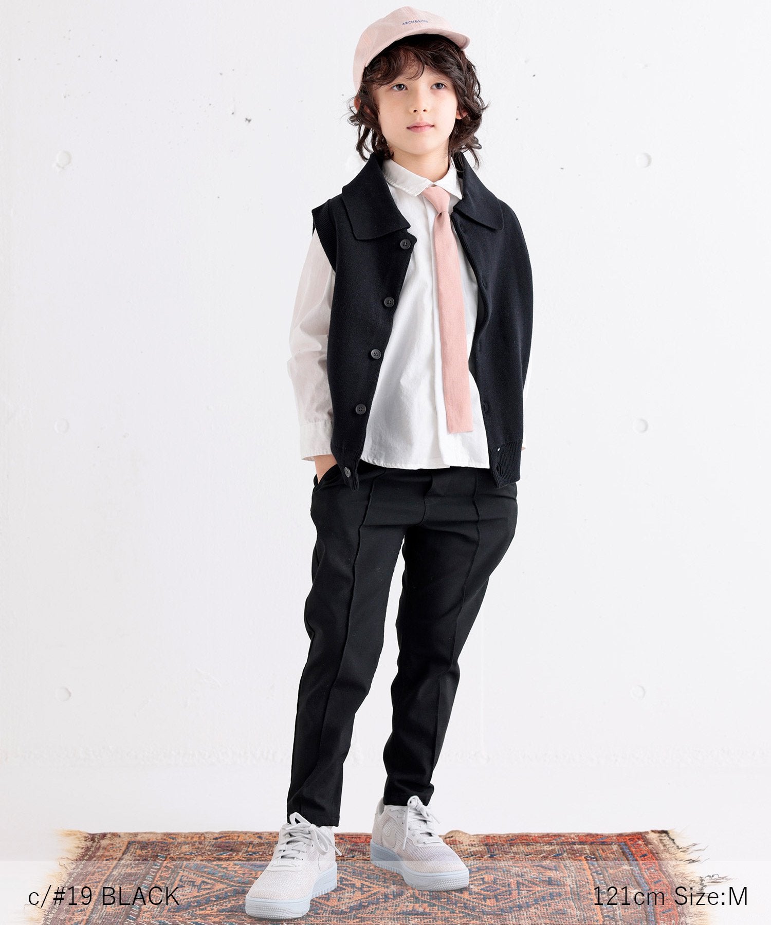 ■ディテール センタークリース入りで、式典から日常まで幅広く使えるキレイ目なイージーパンツ。スーツのボトムとしても使用しているパターン(型紙)をアレンジしたテーパード型の為、とてもスッキリとしたラインでバランスの取りやすい一着です。左脇にはゴム通し口があり、お好みや成長に合わせてゴムの入れ替えで調整していただけます。ウエストはリブの仕様になっており、小さなお子様でも着脱しやすく仕上げています。