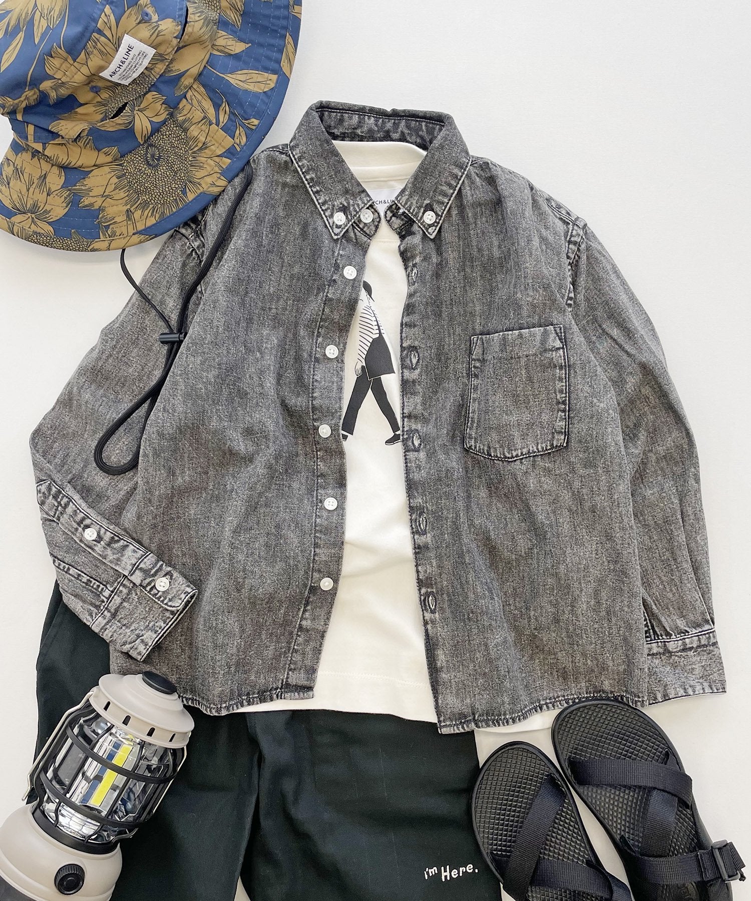 ■ディテール オーガニックコットンライトデニムを使用したボタンダウンシャツ。 ややワイドなシルエットで裾をストレートに仕上げることでアウターのようにも着られるデザインに仕上がっています。加工によりとても柔らかな仕上がりで、通年お召し頂けます. パパママにもオススメ.