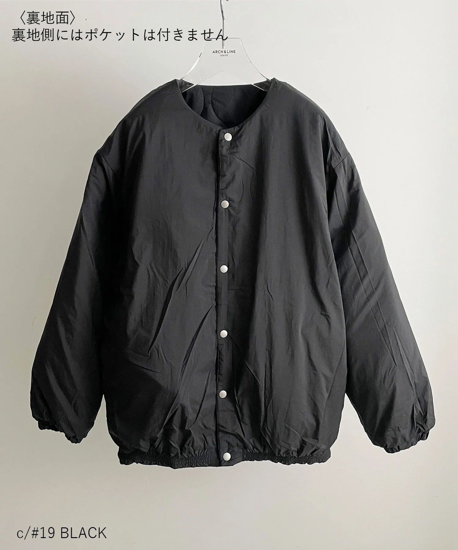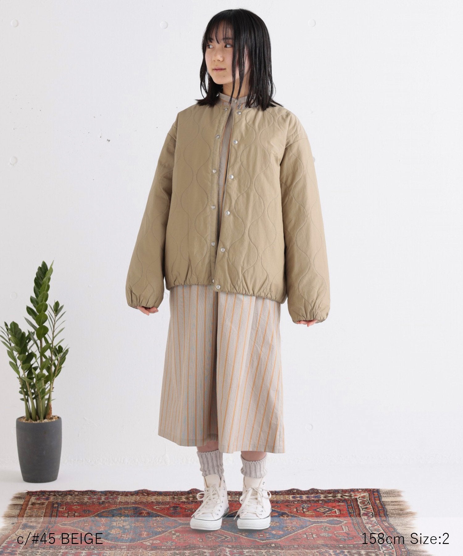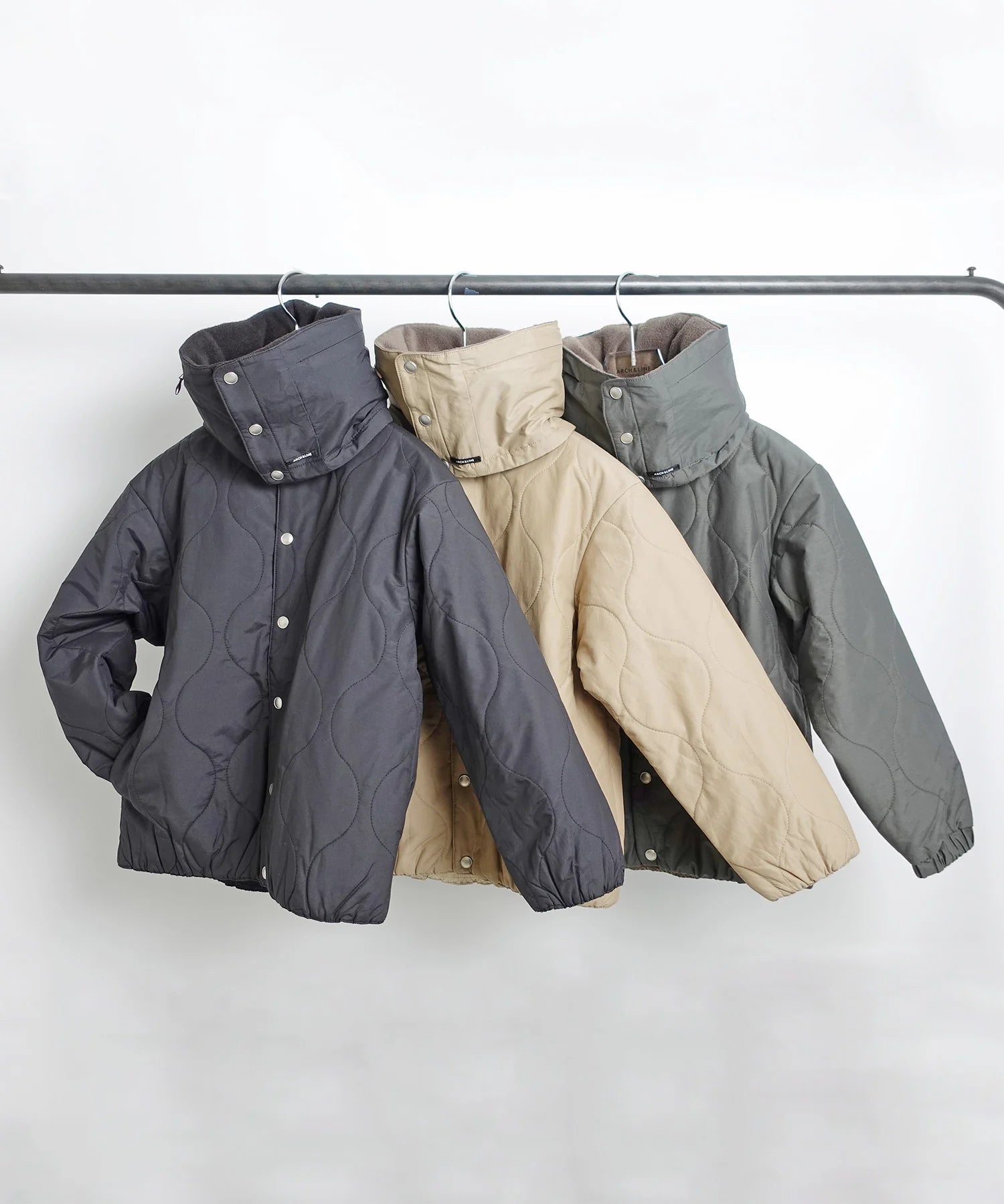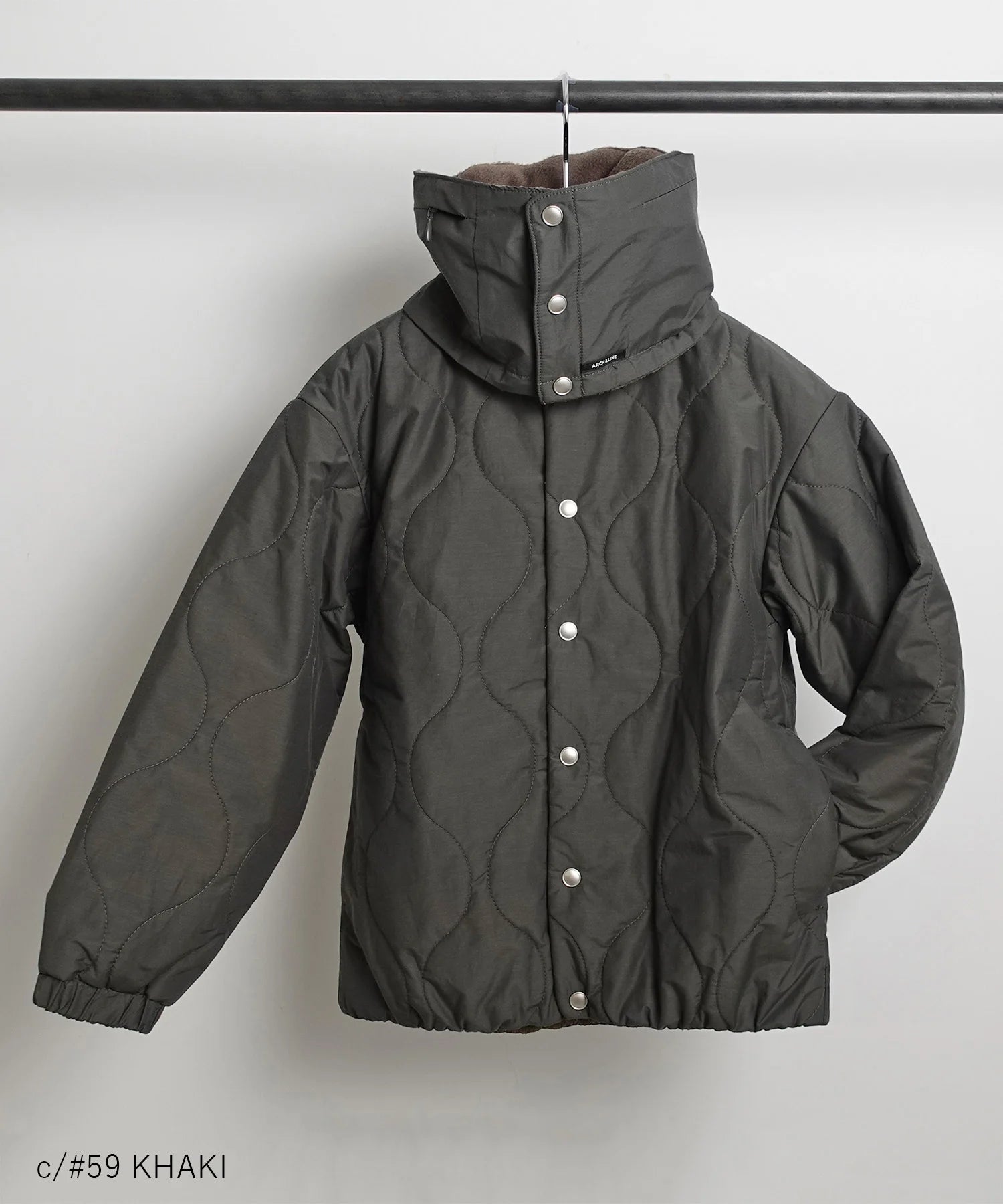 ■ディテール <本体> リバーシブル仕様のブルゾン。スヌーディがセットになっています。 ・表面はヘチマキルティング加工、裏面はキルティング加工無しのシンプルな仕様 ・アウターの下にインナーコートとしてもお召しいただけるよう、比較的スッキリとしたシルエットに。 ・薄すぎず暑過ぎない中綿分量で、真夏を除く一年の半分以上はお召しいいただけます。 ・両脇にポケット付き。 ・表地はマットな質感の為、スヌーディを外すとフォーマルにもお使いいただけます。 ・袖口に入れたゴムにより風が入り込むのを防ぎます。