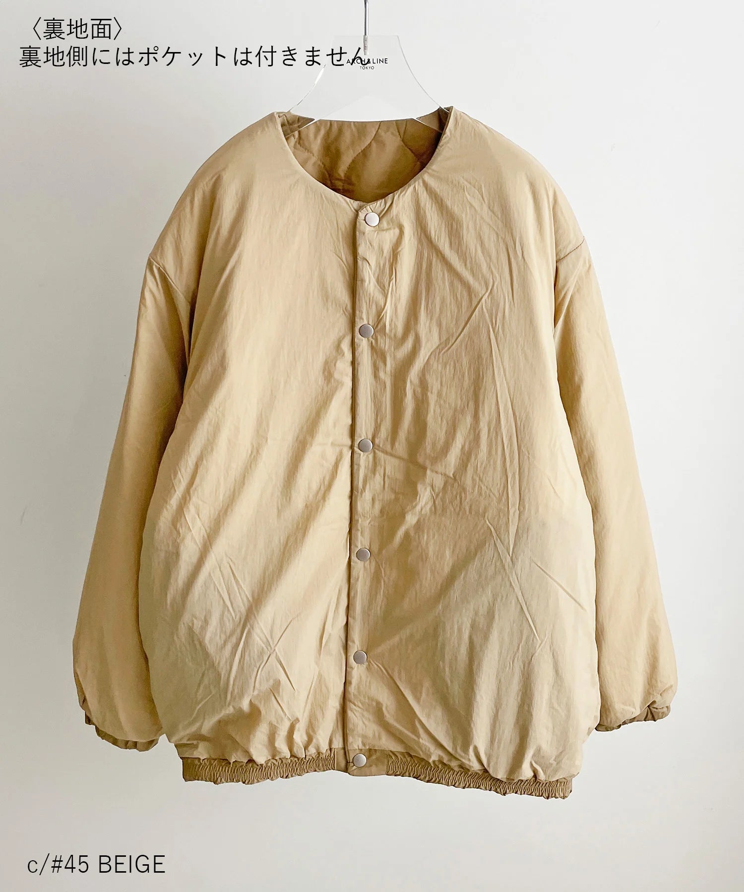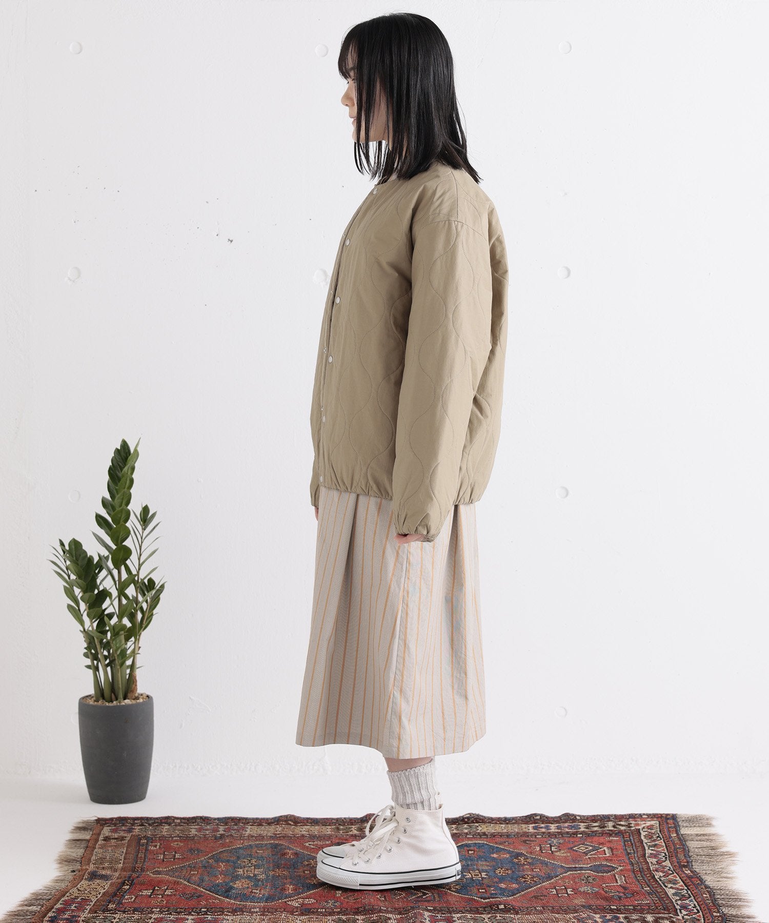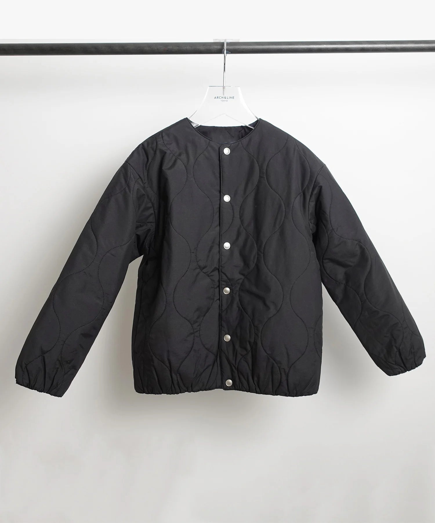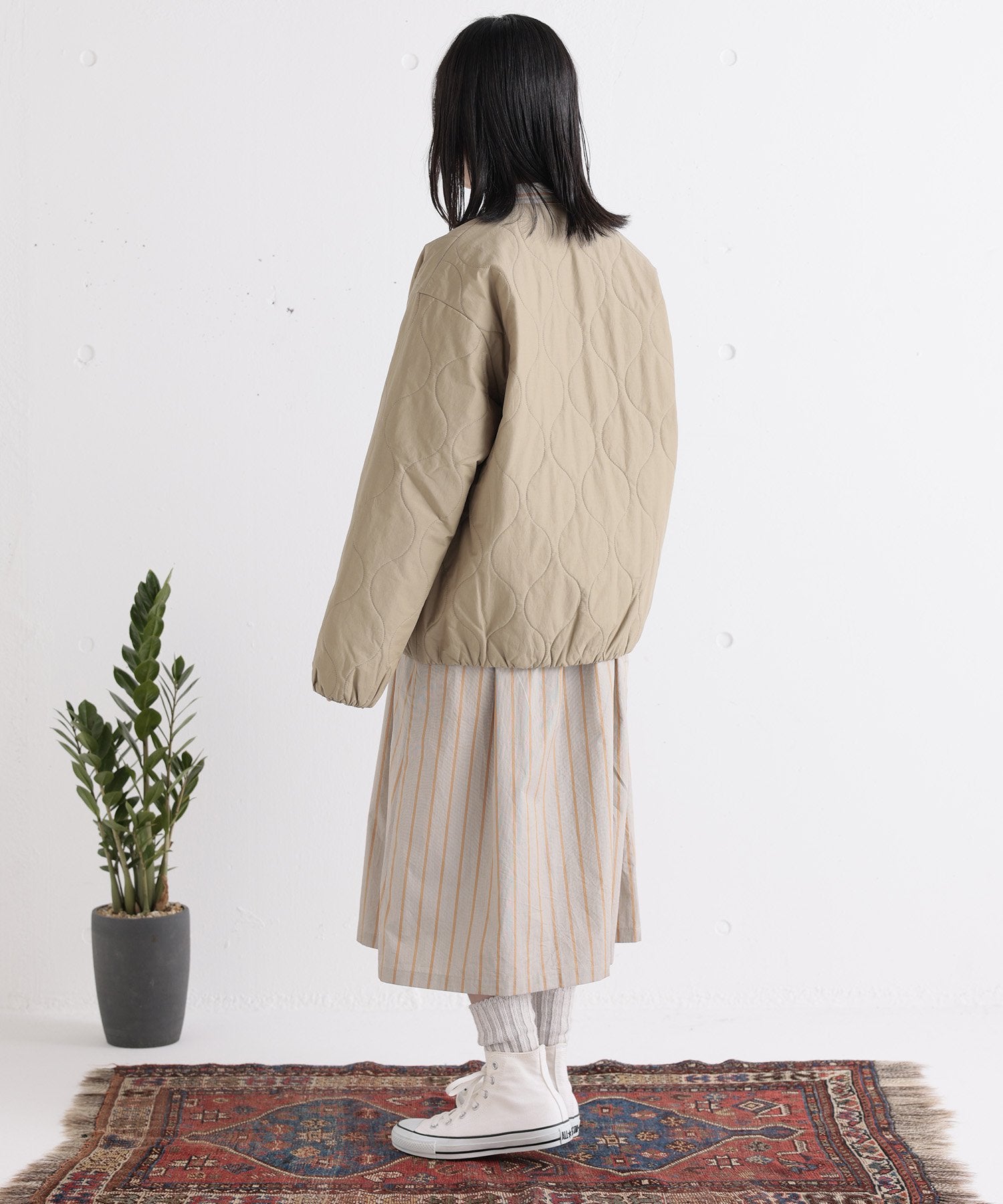 ■ディテール <本体> リバーシブル仕様のブルゾン。スヌーディがセットになっています。 ・表面はヘチマキルティング加工、裏面はキルティング加工無しのシンプルな仕様 ・アウターの下にインナーコートとしてもお召しいただけるよう、比較的スッキリとしたシルエットに。 ・薄すぎず暑過ぎない中綿分量で、真夏を除く一年の半分以上はお召しいいただけます。 ・両脇にポケット付き。 ・表地はマットな質感の為、スヌーディを外すとフォーマルにもお使いいただけます。 ・袖口に入れたゴムにより風が入り込むのを防ぎます。