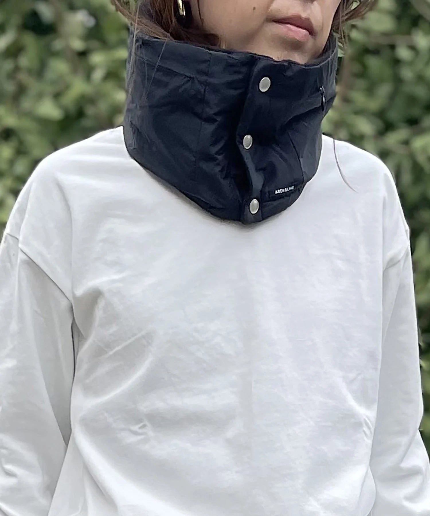 <スヌーディ> 付属で付いてくるスヌーディは、一見スヌードですが中にフードが隠れた2WAY仕様。首の裏面はフリースになっておりあたたか。秋口や春先はスヌーディのみ単品で。真冬やレジャー、自転車に乗る時などの防寒をしっかりしたいシーンではフードを出して耳を覆えば耳当て要らずでホカホカです。