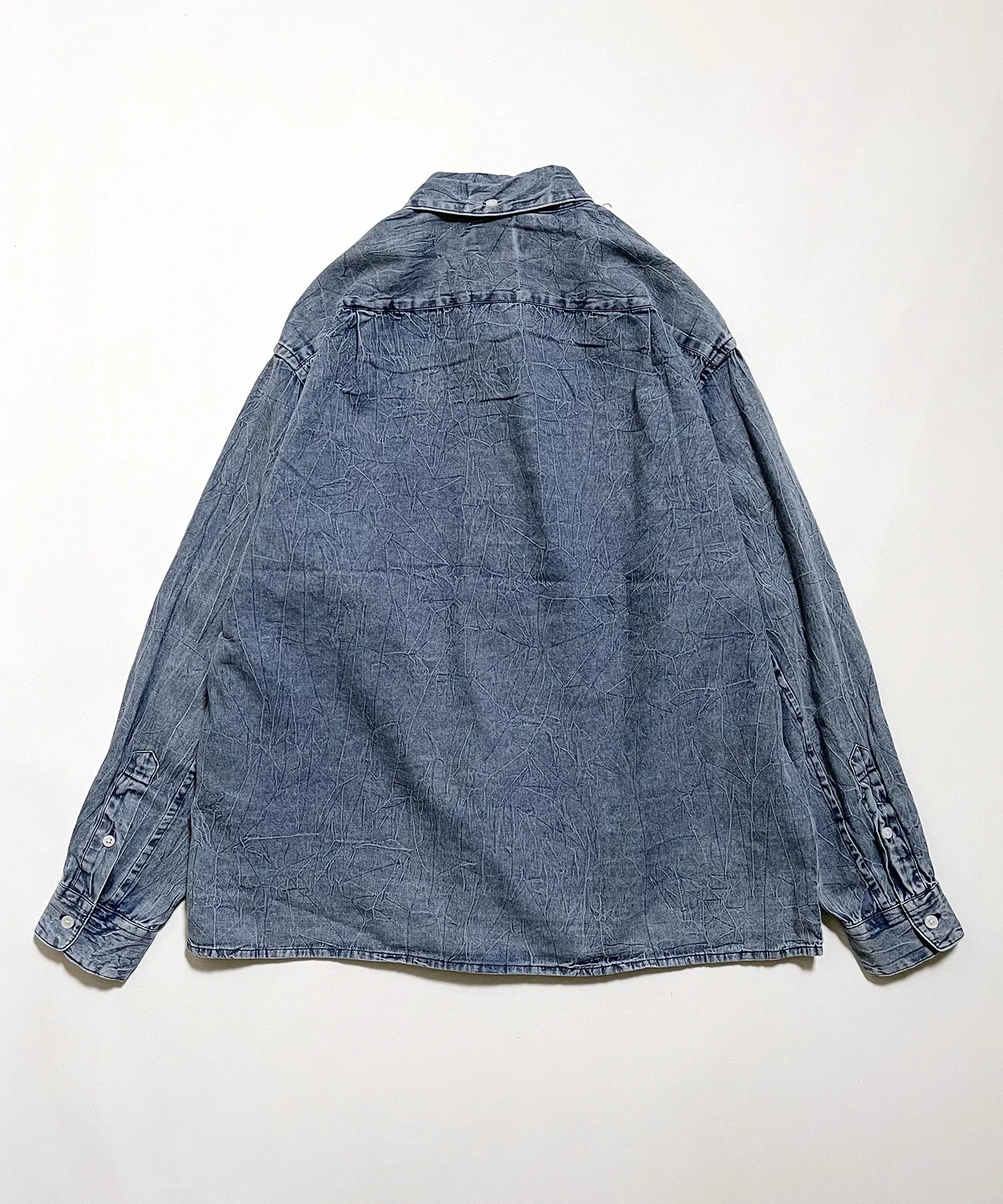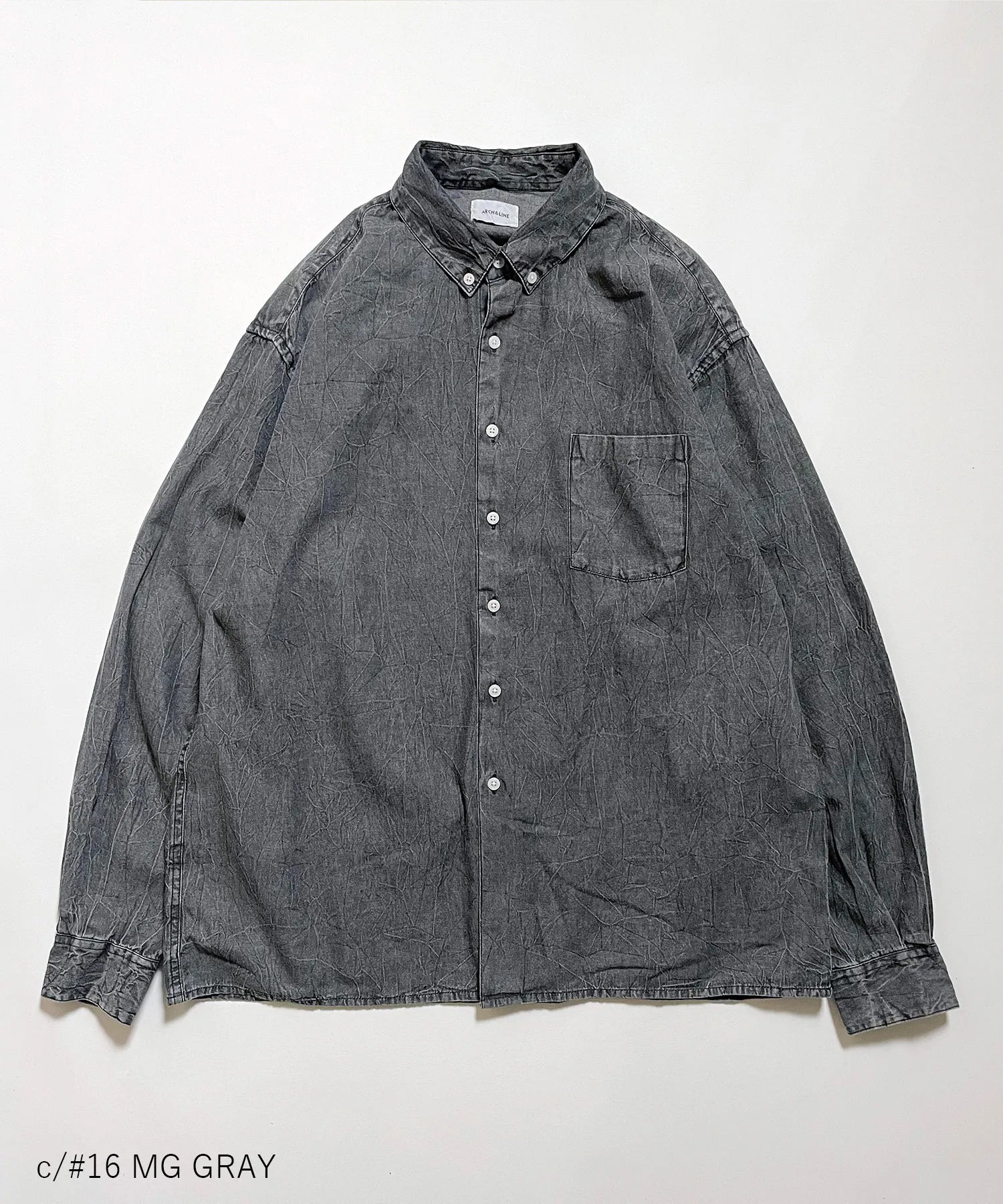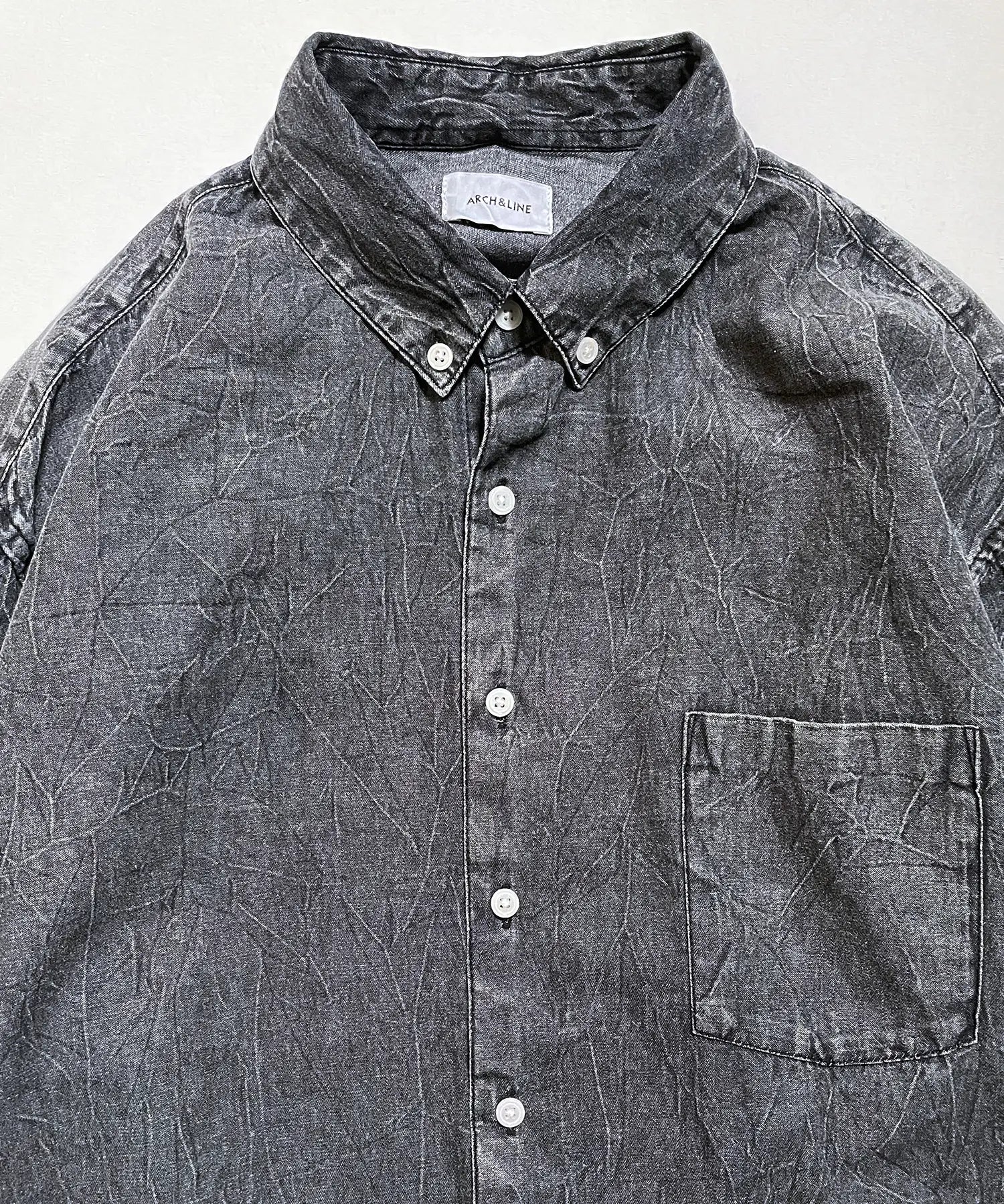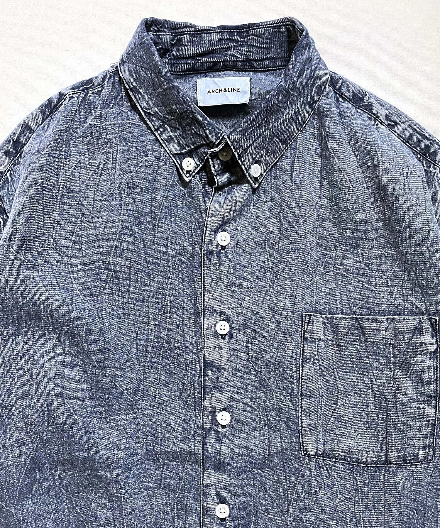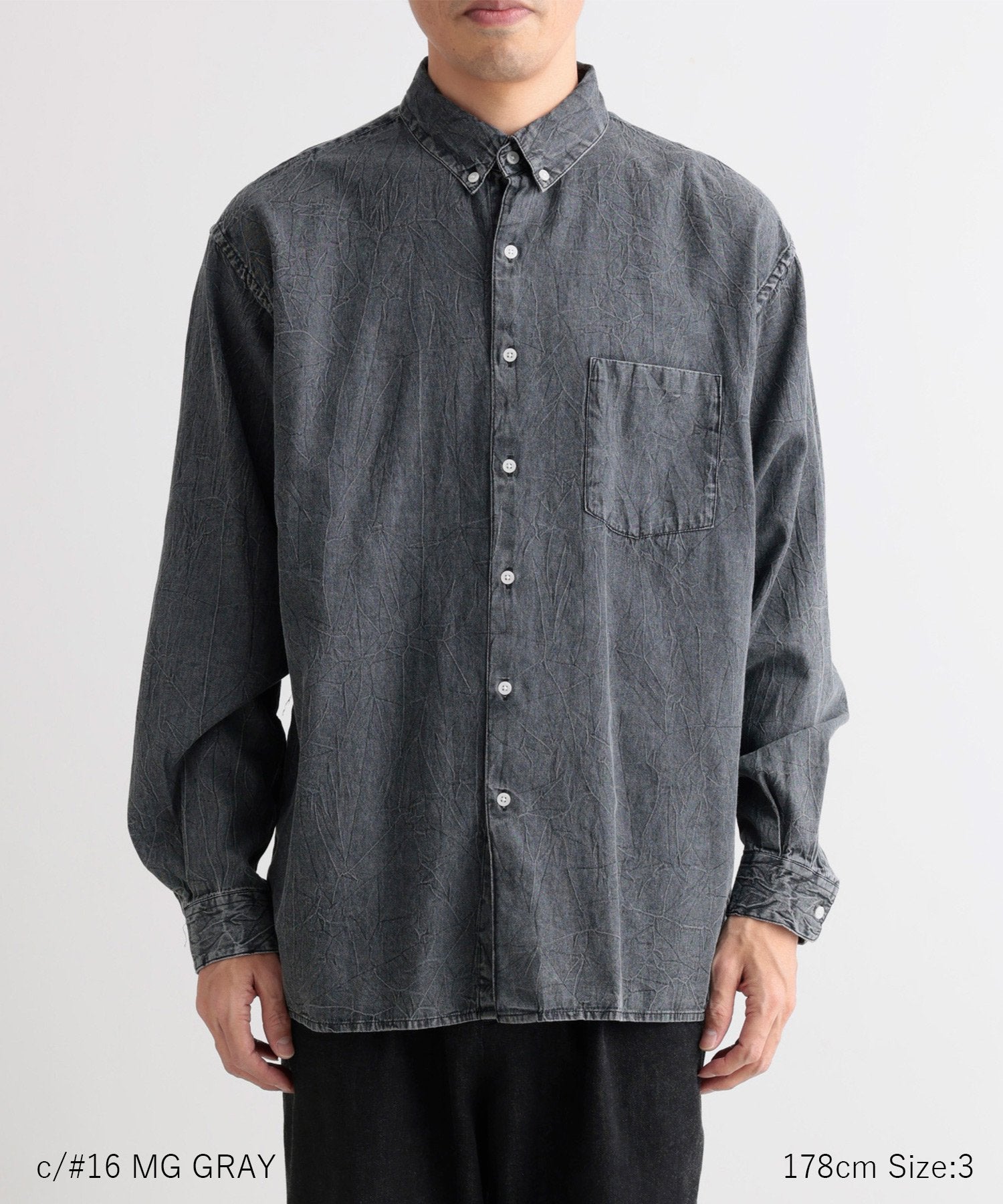 ■ディテール ライトデニムを使用したボタンダウンシャツ。ややワイドなシルエットで裾をストレートに仕上げることでアウターのようにも着られるデザインに仕上がっています。加工によりとても柔らかな仕上がりで、通年お召し頂けます。ママパパにもオススメ。