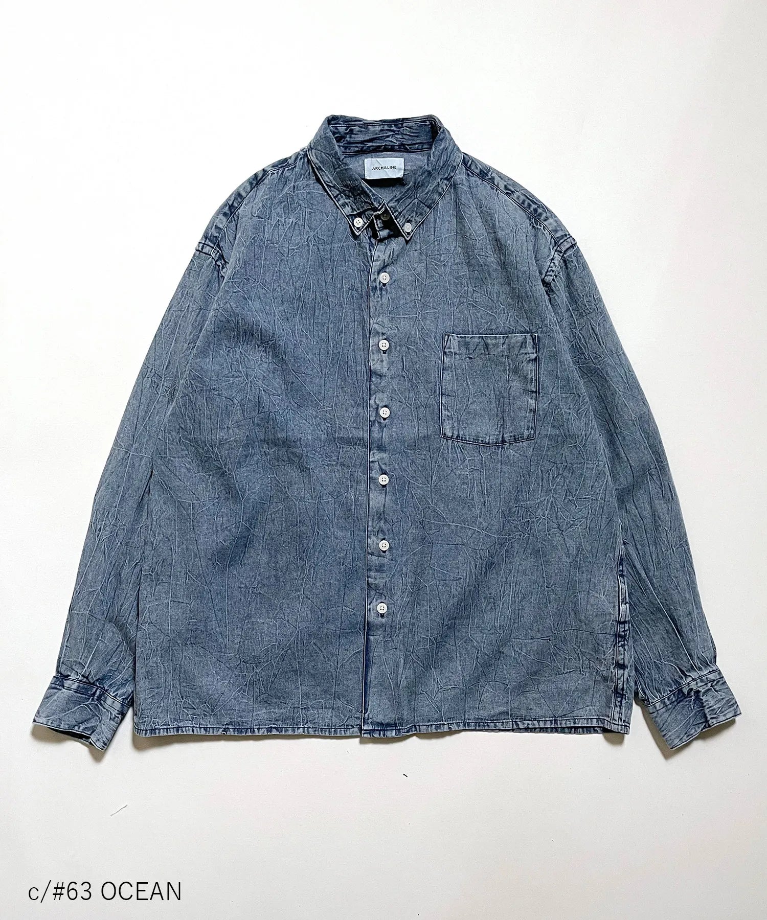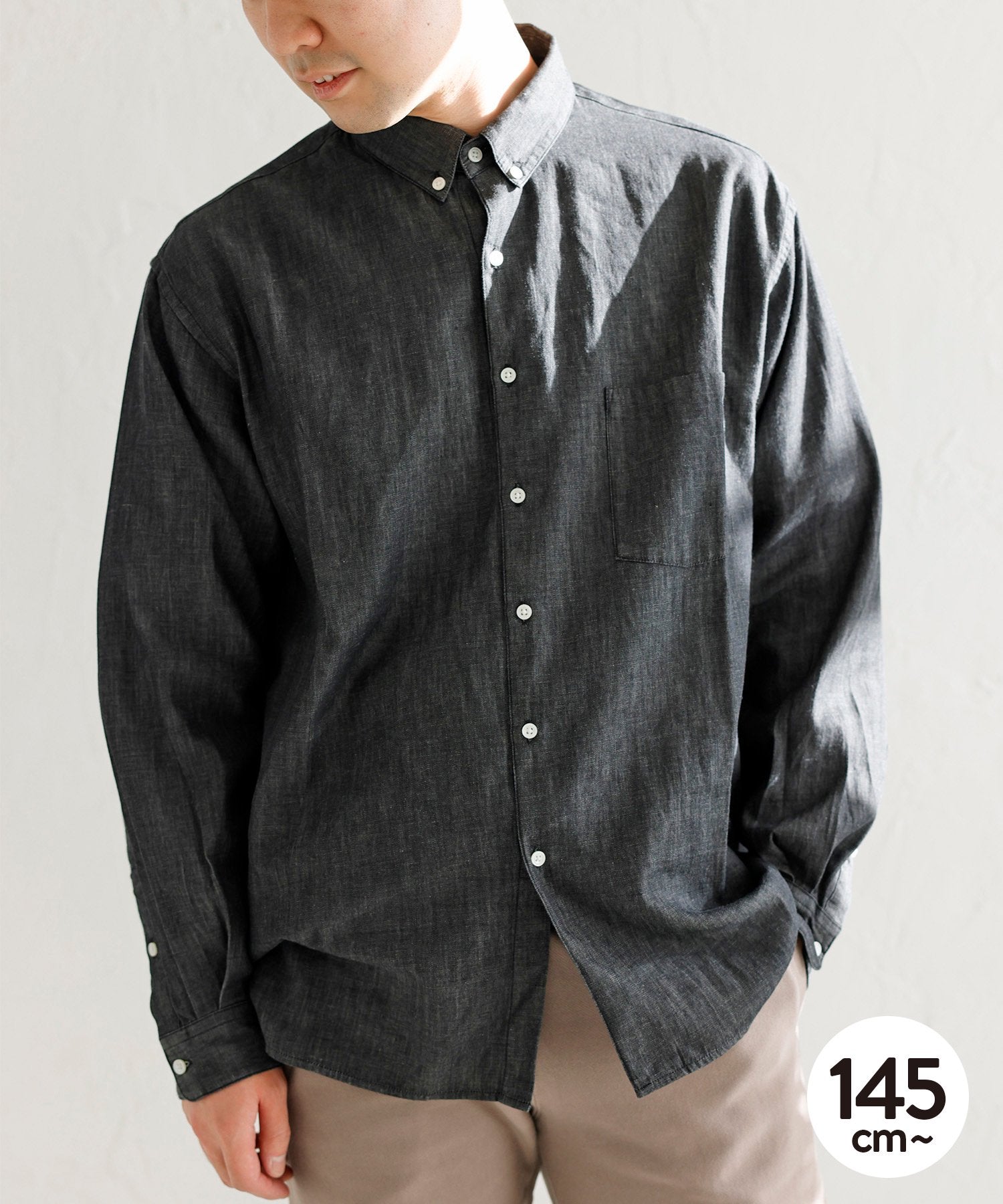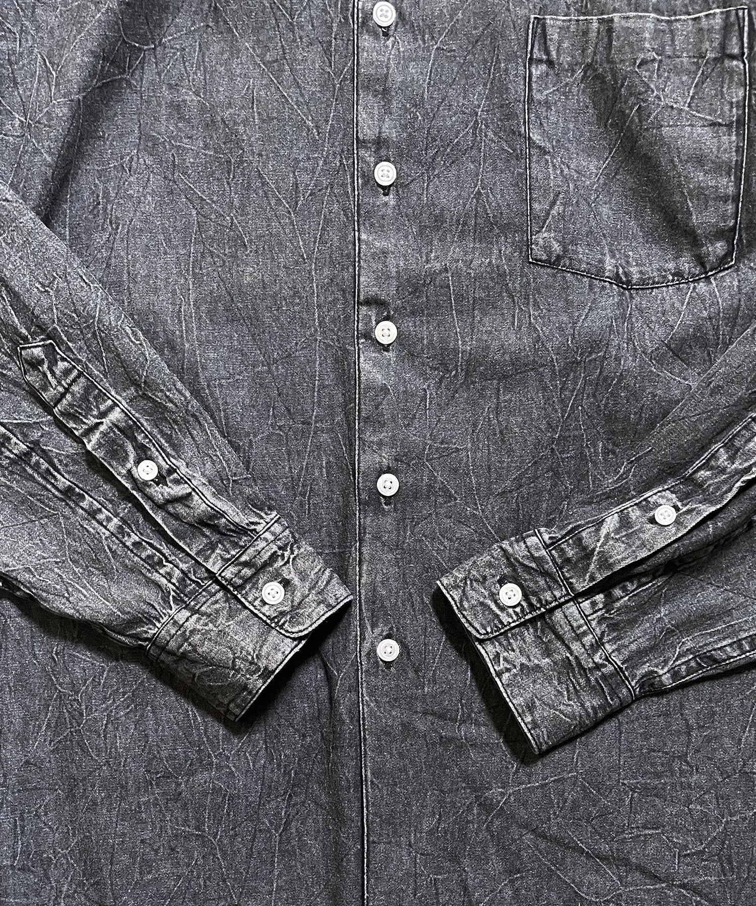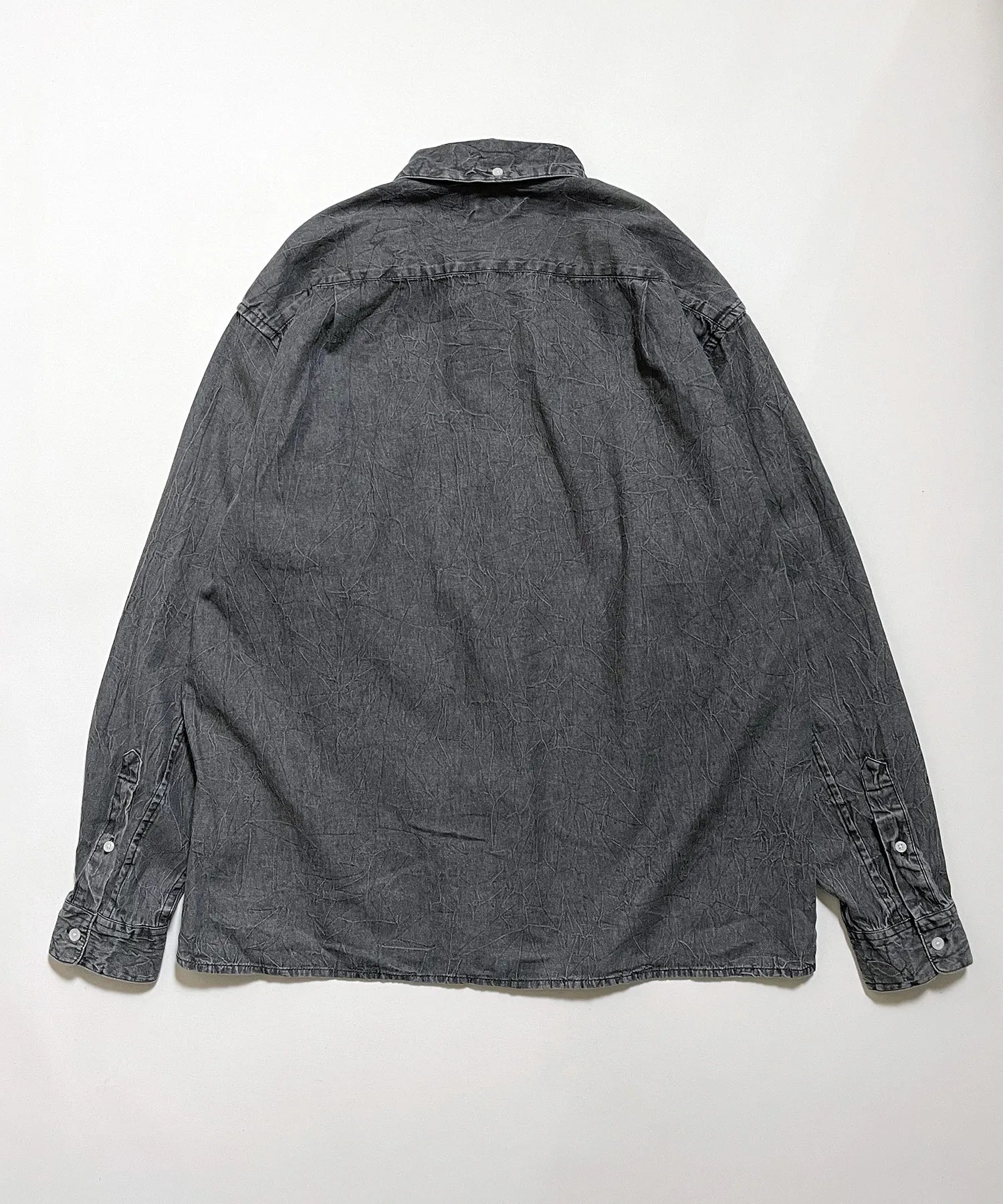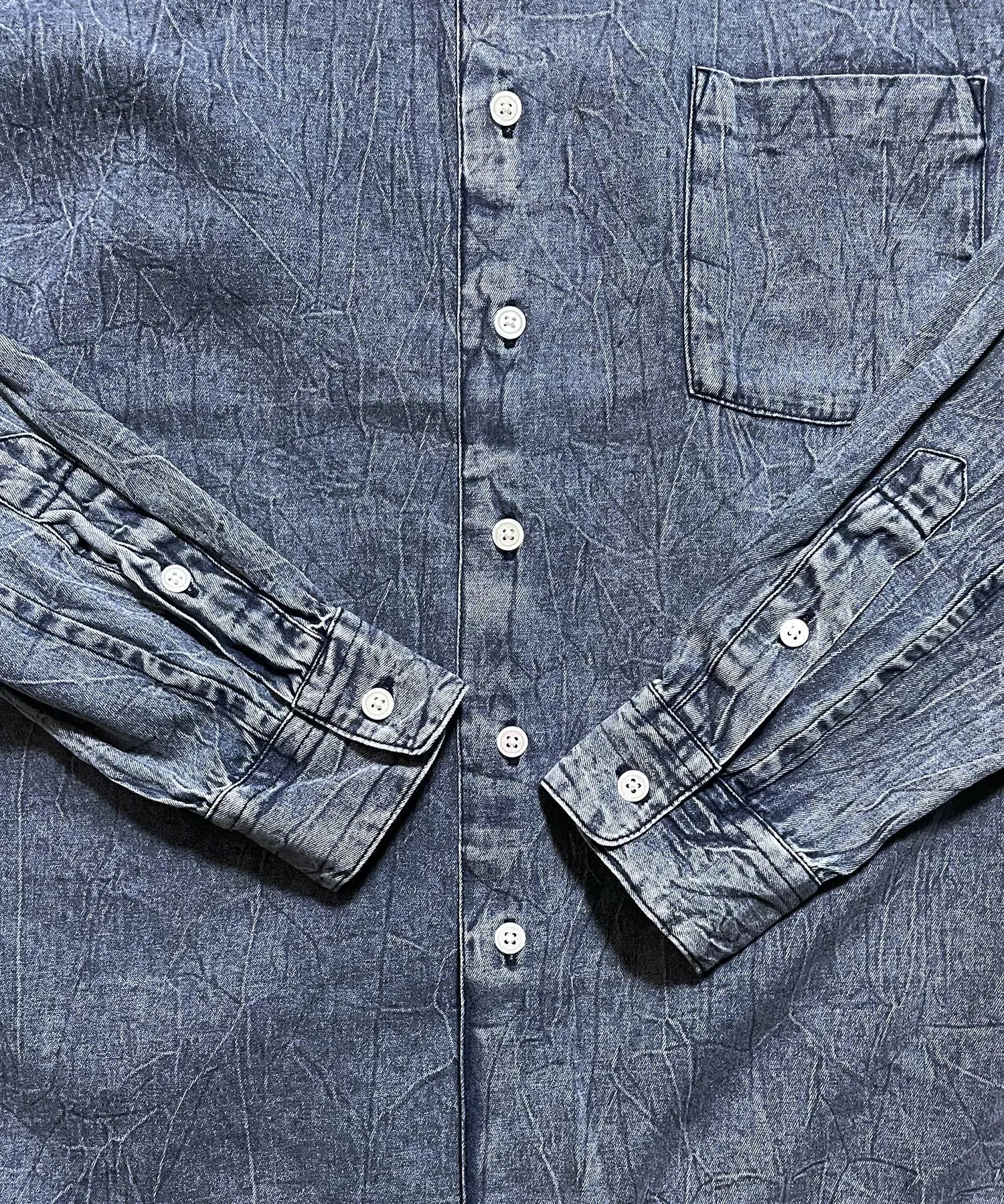 ■ディテール ライトデニムを使用したボタンダウンシャツ。ややワイドなシルエットで裾をストレートに仕上げることでアウターのようにも着られるデザインに仕上がっています。加工によりとても柔らかな仕上がりで、通年お召し頂けます。ママパパにもオススメ。