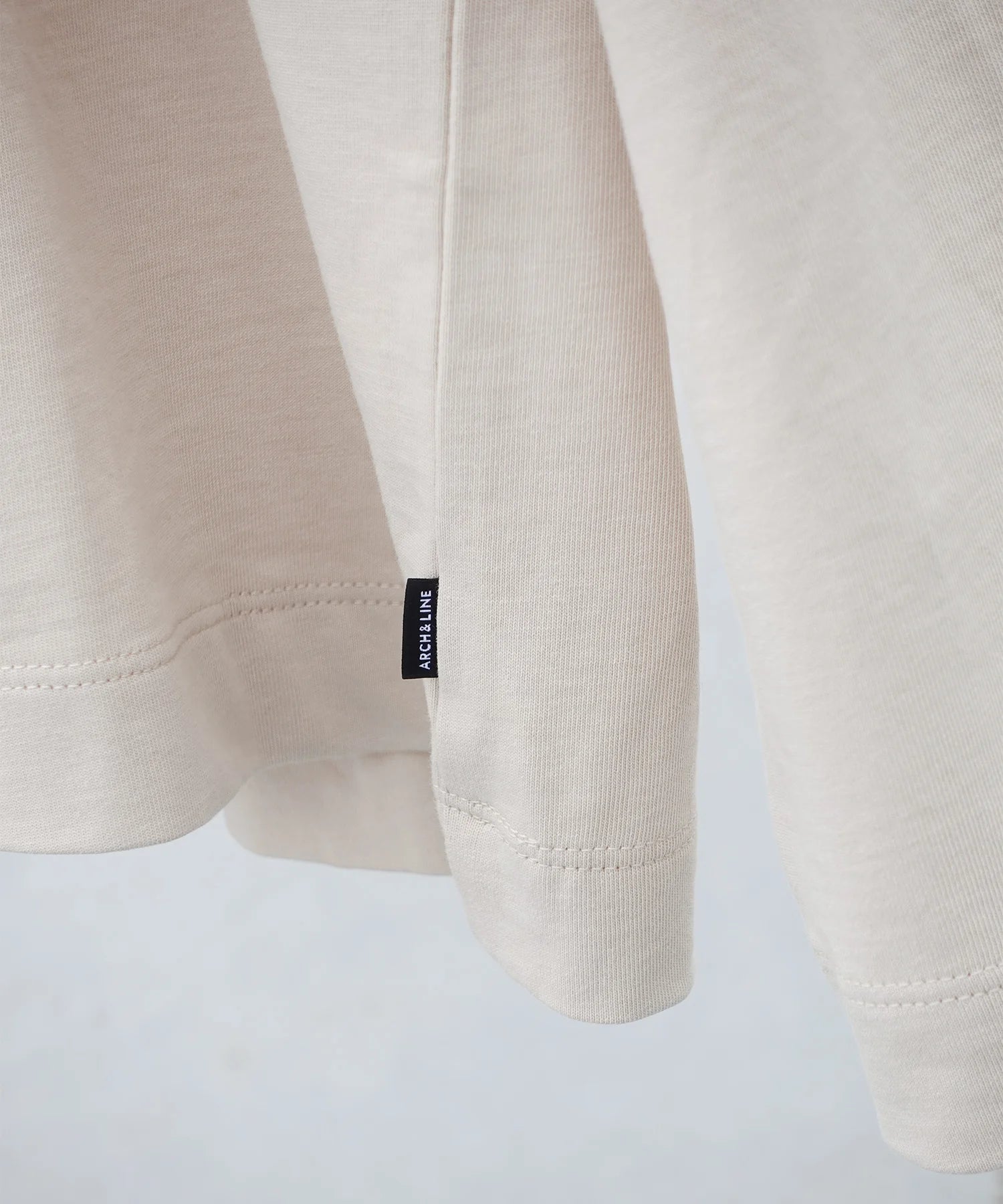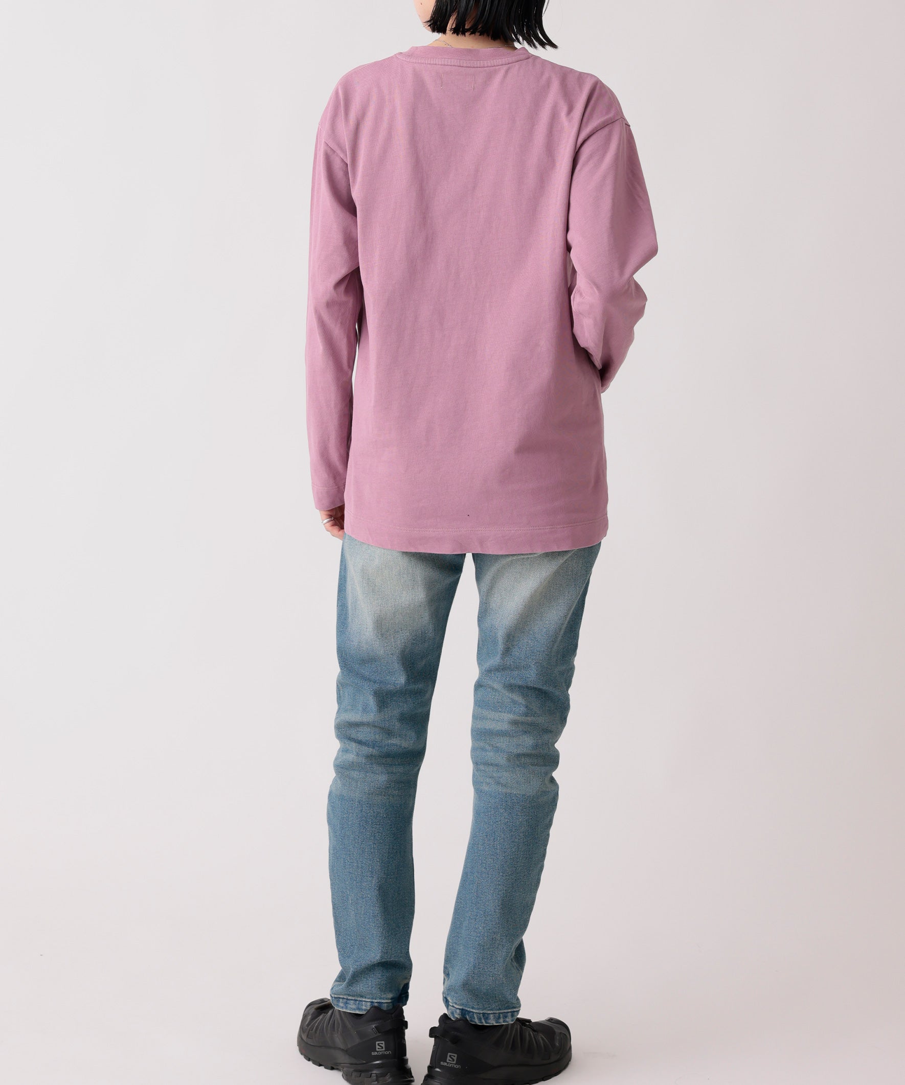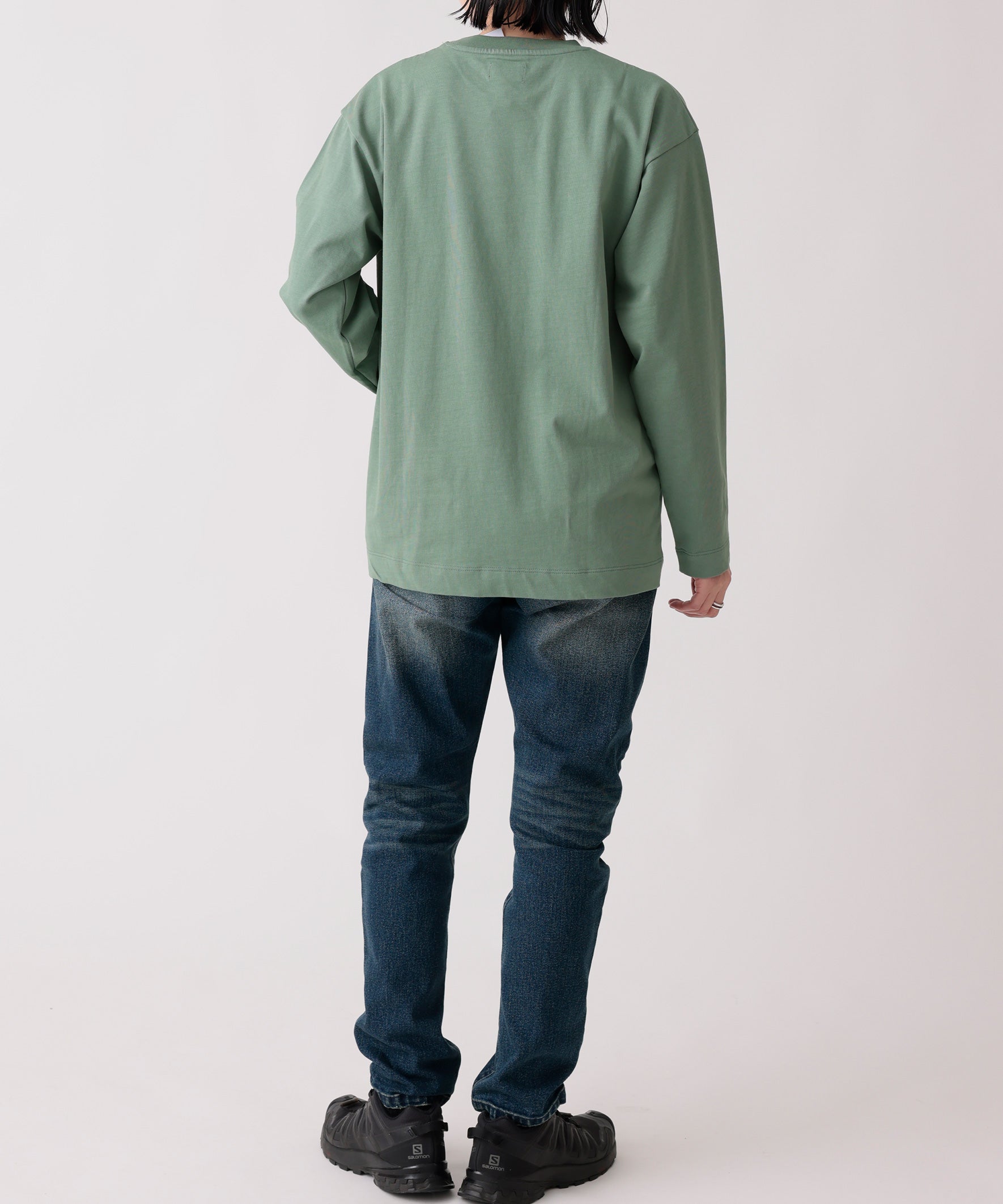 ■ディテール ジャストルーズなサイズ感の長袖TEE。長くご愛用いただけるように、タコバインダー始末(※)にしています。シンプルな中に、衿フライス巾や袖口・裾のステッチ巾を太めにしてあるのがポイント。動きを妨げないよう、アームホールもやや大きめに設定してあります。左裾に付けたピスネームも効いています。環境負荷を考えると、長袖ひとつとっても人の目線を気にして「春用の色」「秋用の色」と買い揃えることに疑問を感じます。一日でも長く着まわしていただけるよう、一年中着やすい色展開に。