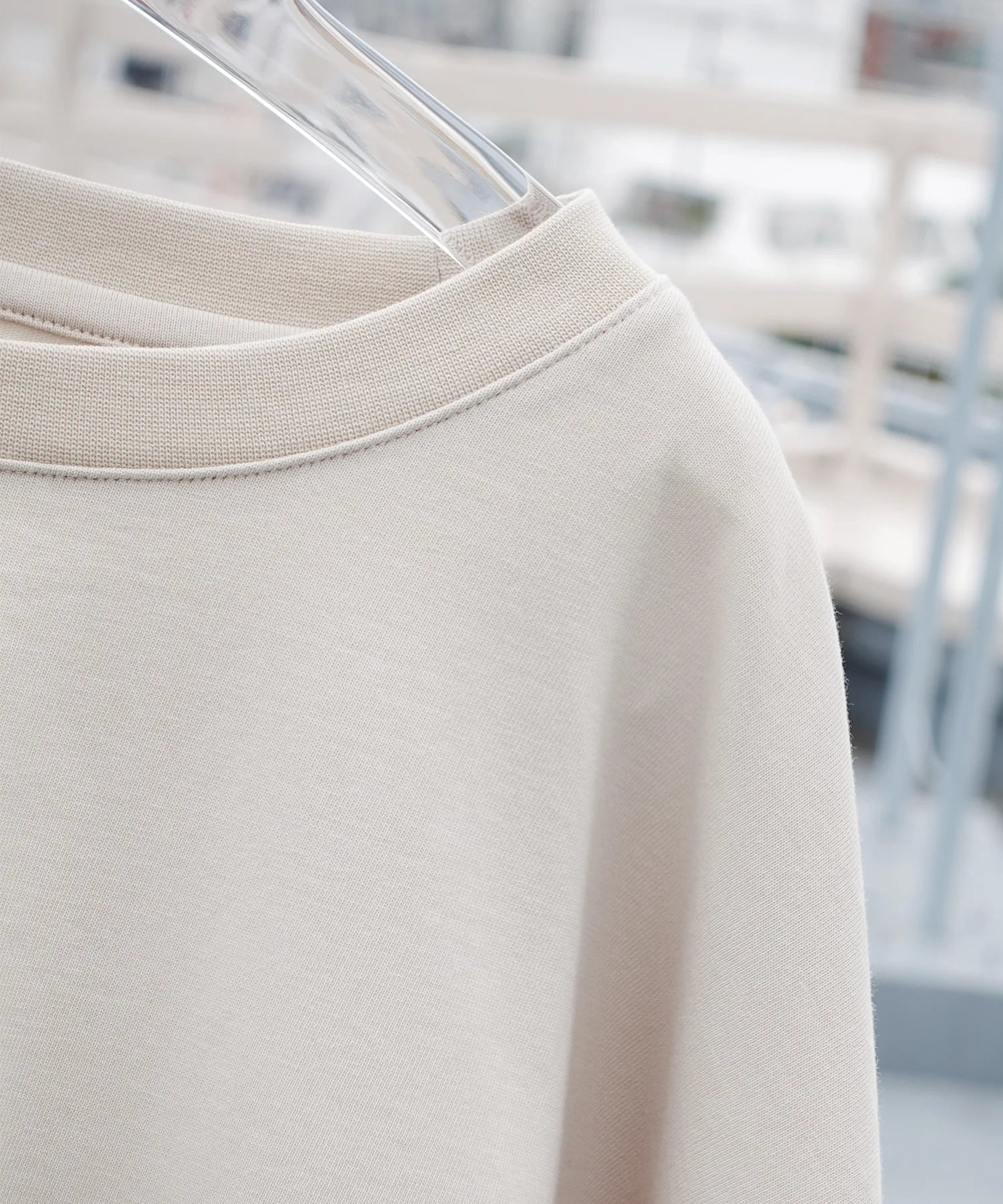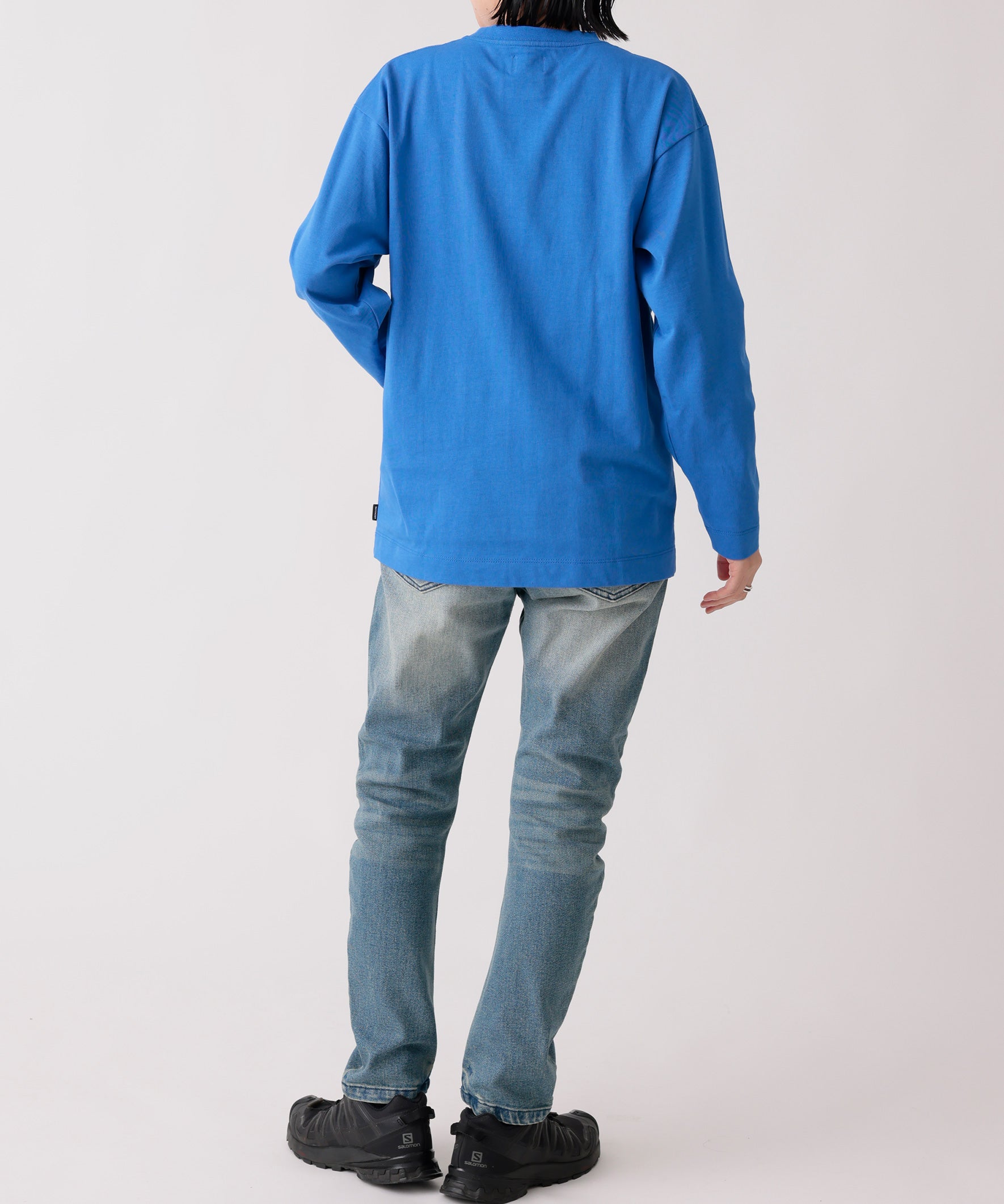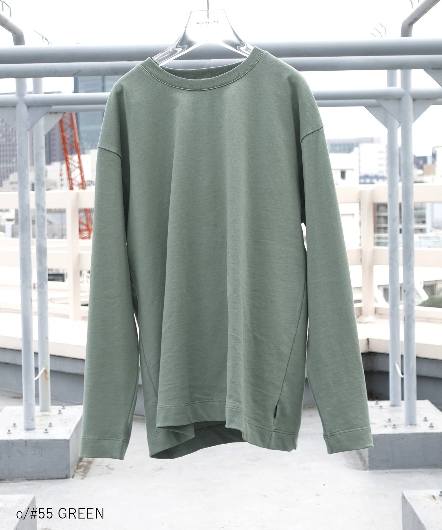 ■ディテール ジャストルーズなサイズ感の長袖TEE。長くご愛用いただけるように、タコバインダー始末(※)にしています。シンプルな中に、衿フライス巾や袖口・裾のステッチ巾を太めにしてあるのがポイント。動きを妨げないよう、アームホールもやや大きめに設定してあります。左裾に付けたピスネームも効いています。環境負荷を考えると、長袖ひとつとっても人の目線を気にして「春用の色」「秋用の色」と買い揃えることに疑問を感じます。一日でも長く着まわしていただけるよう、一年中着やすい色展開に。