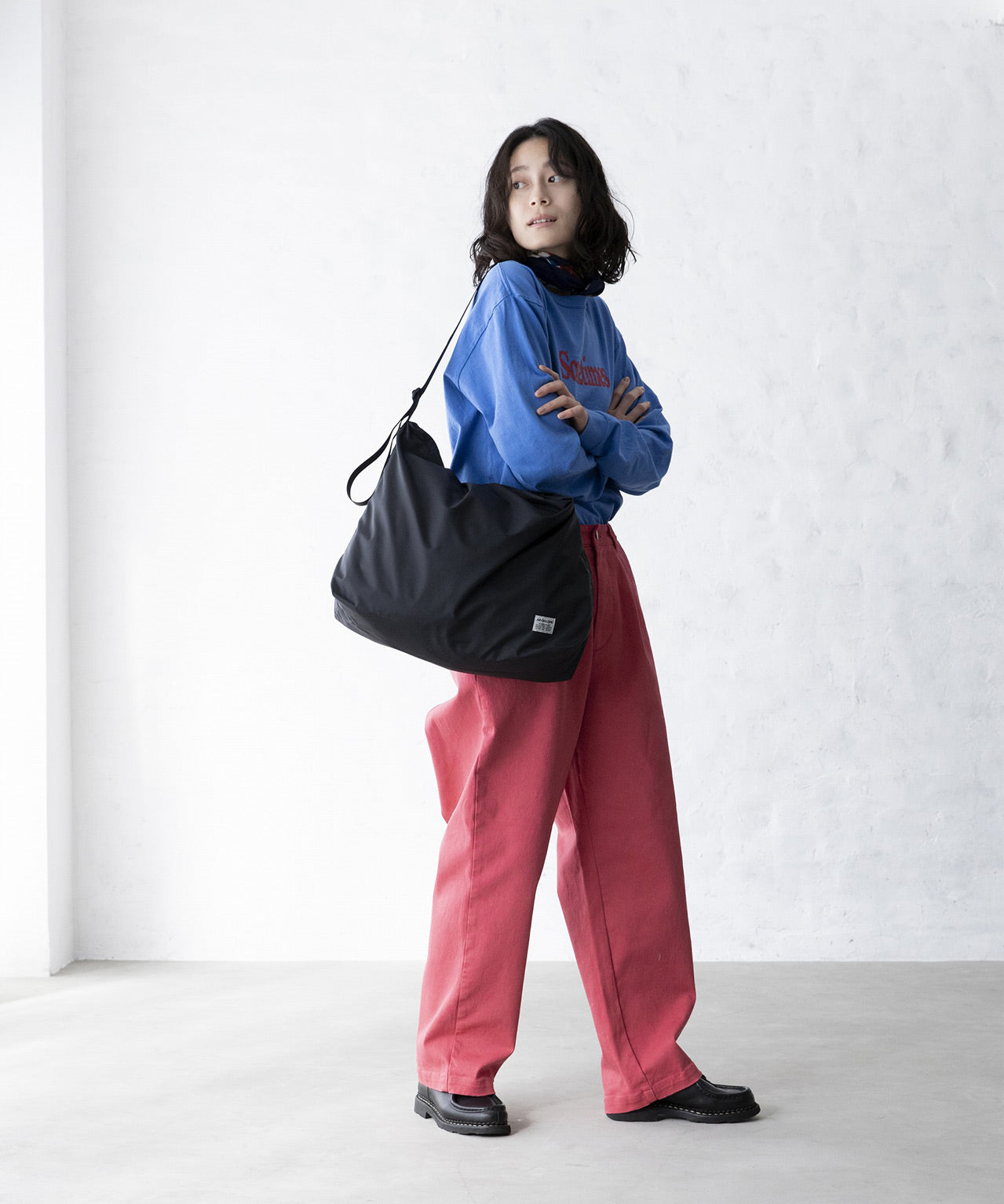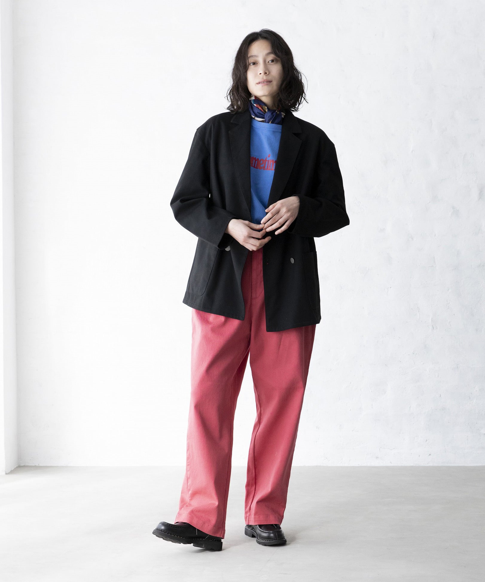 生地が薄過ぎず厚過ぎないフォルムが出やすい厚みなので、ワンサイズ上げて着ていただいてもだらしなしく見えにくいデザインです。お好みに合わせてお選びください。