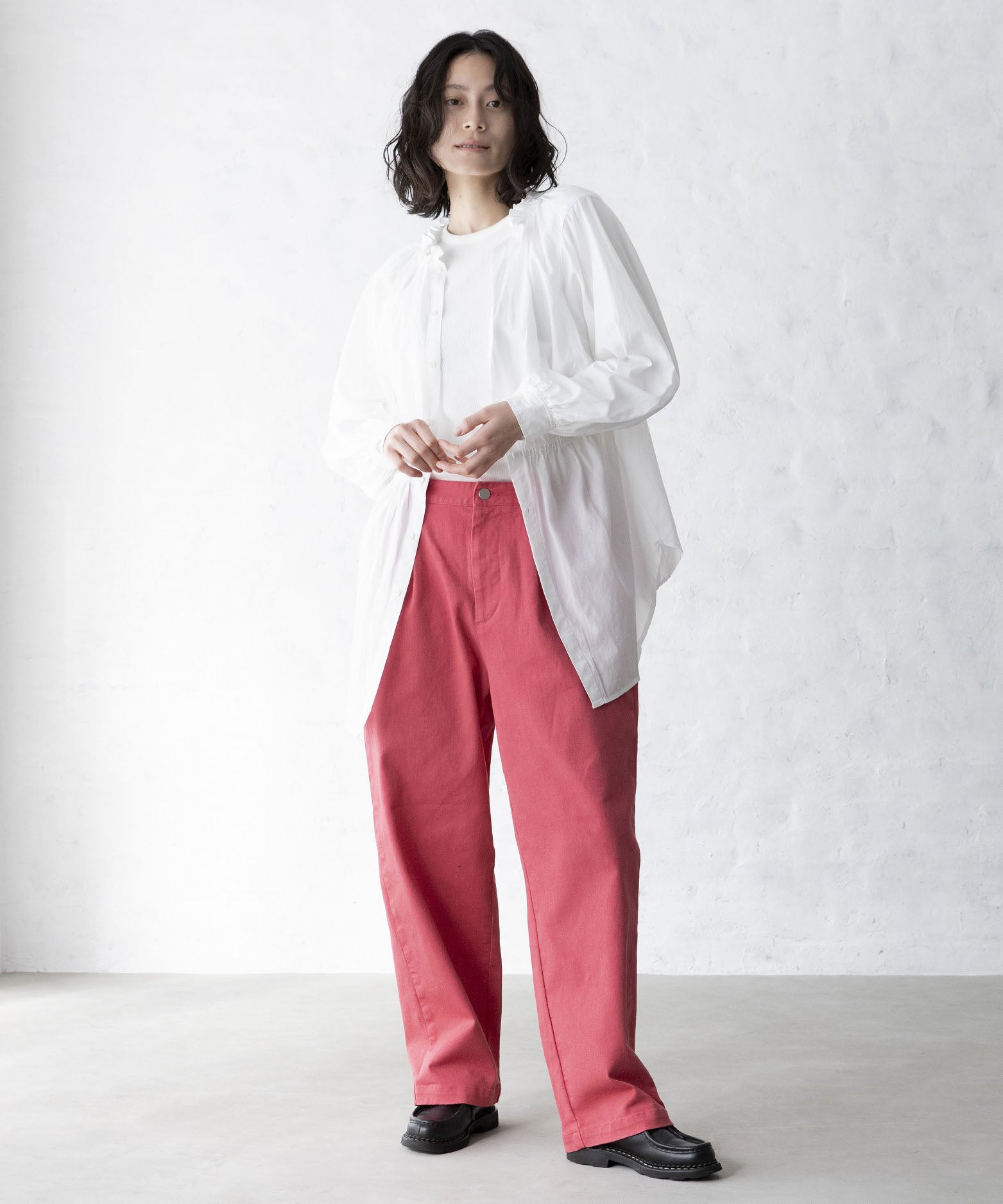 暗くなりがちな冬、カラーパンツはスタイリングの主役になりとても便利。ややワイド気味のシルエットはトレンド感があり、シンプルなTOPSを合わせるだけでお洒落なスタイルの出来上がり。 形がカジュアル過ぎないので、ニットやシャツなどを合わせてキレイ目にまとめるのもおすすめ。