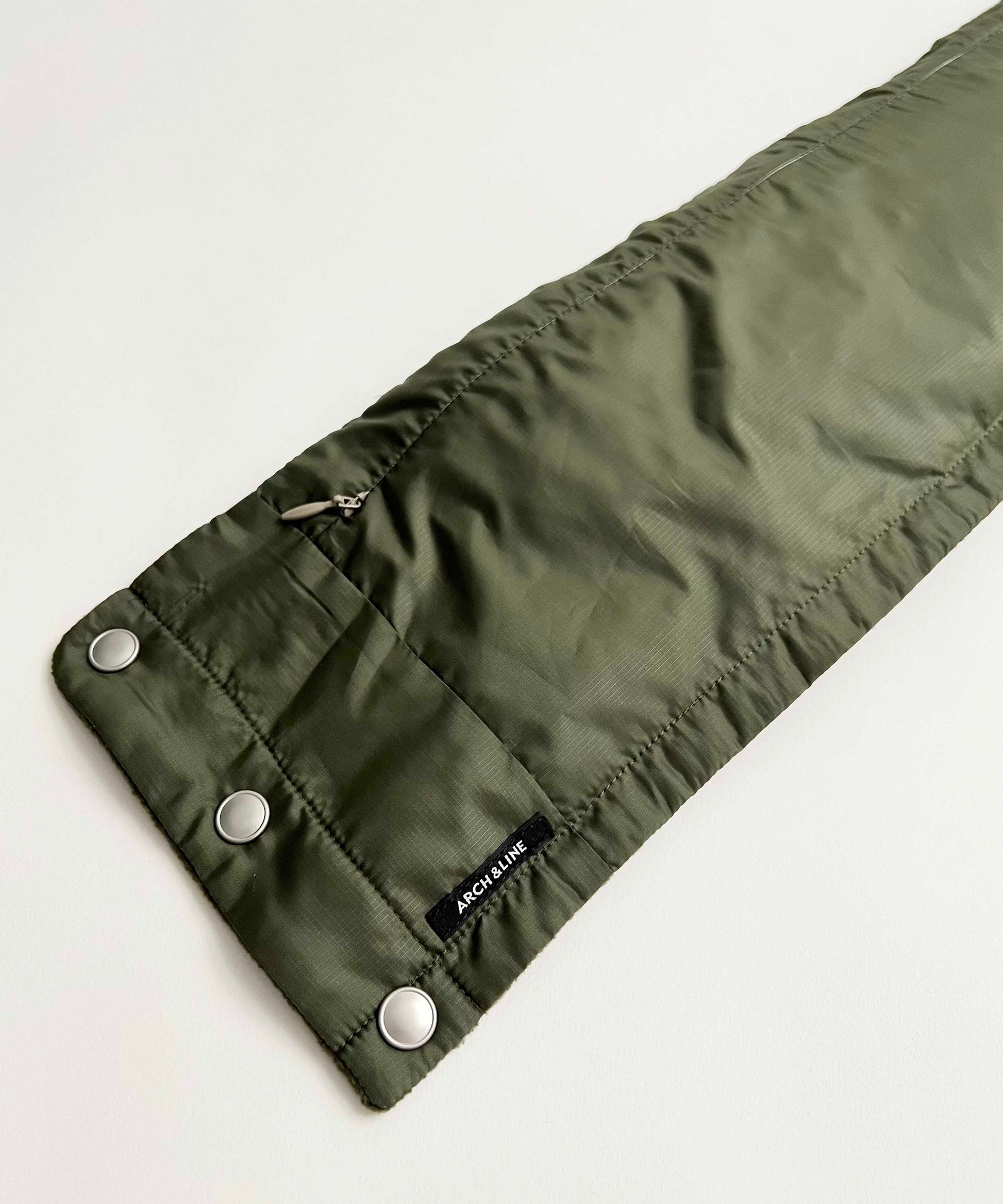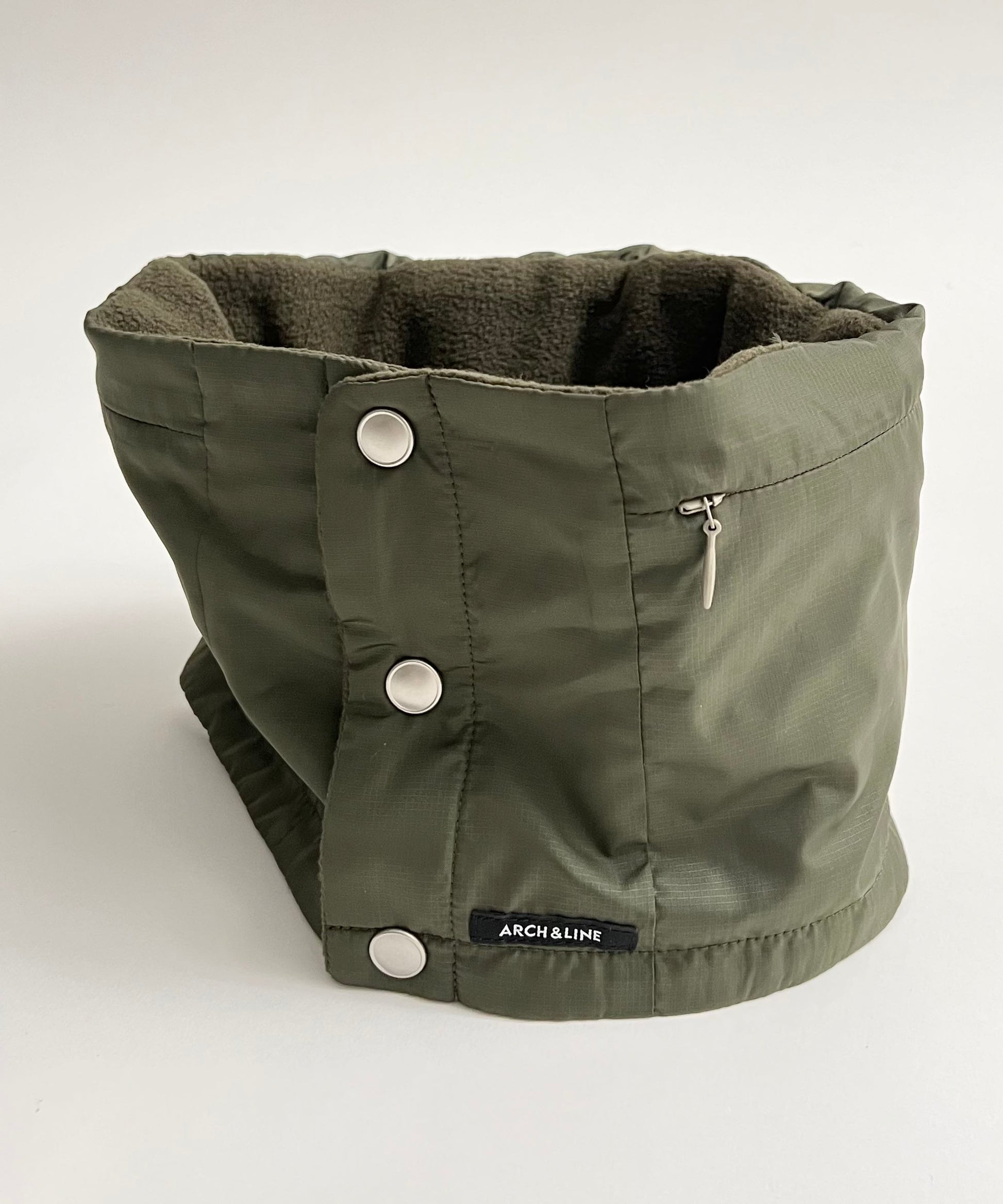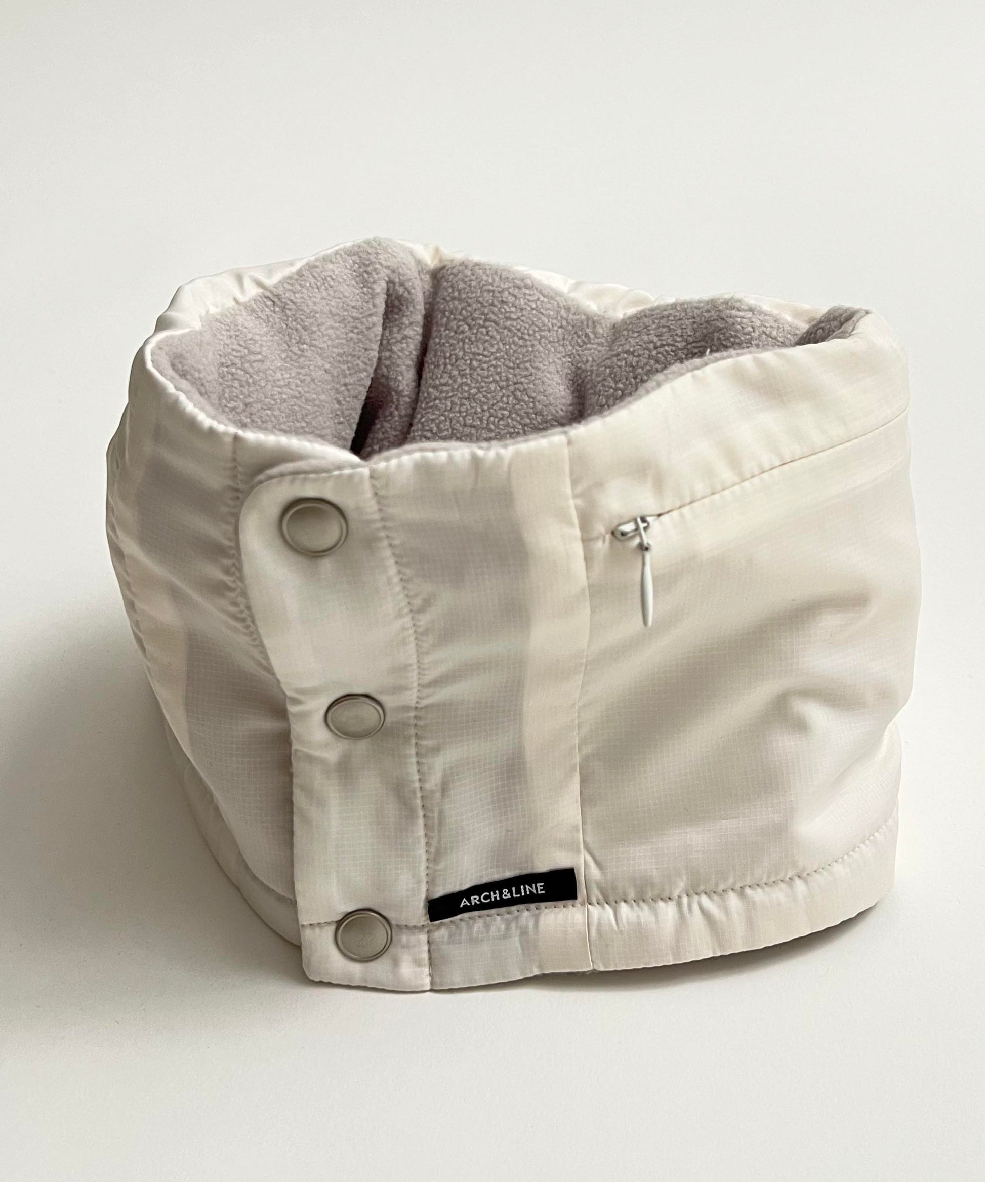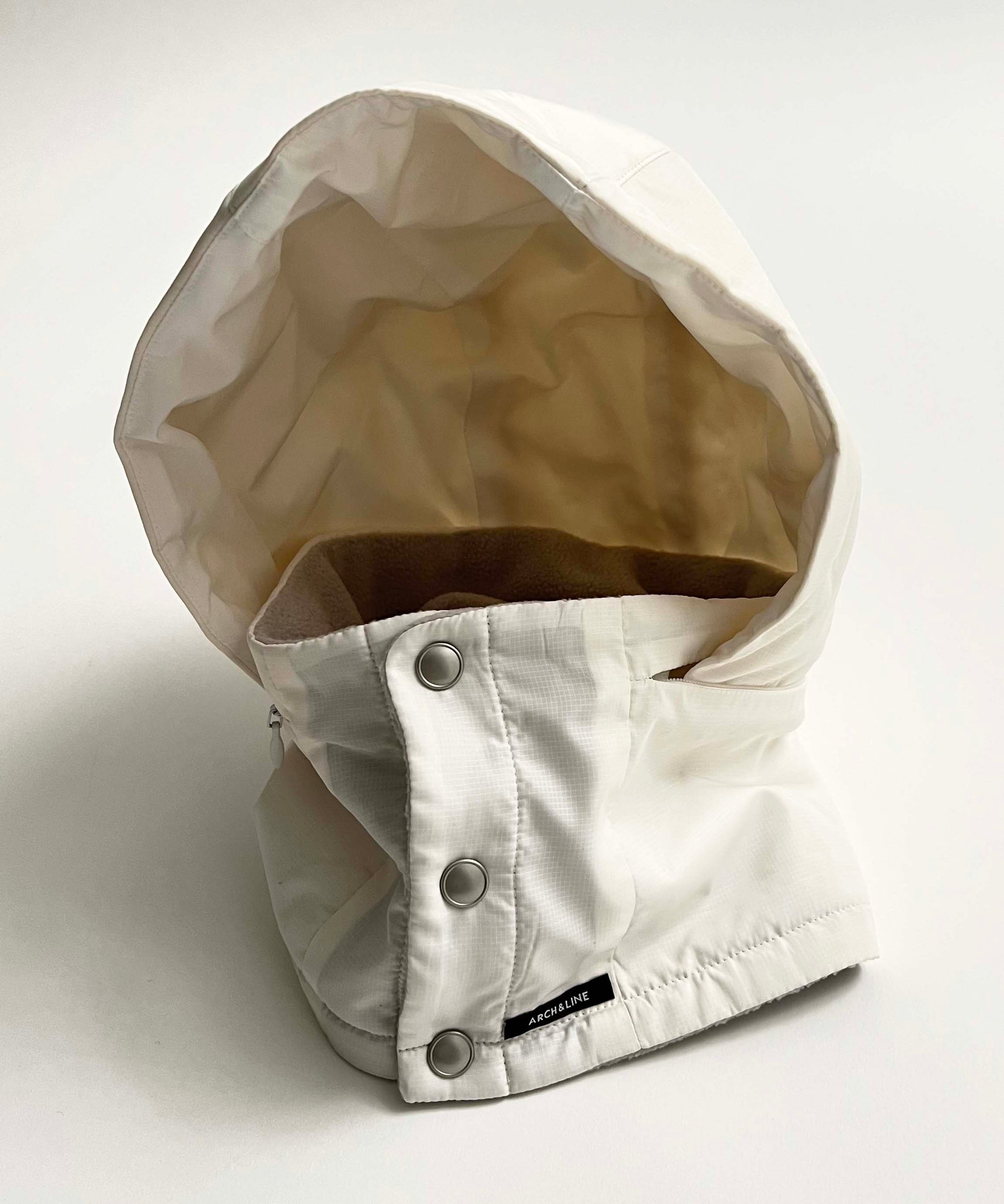 付属で付いてくるスヌーディは、一見スヌードですが中にフードが隠れた2WAY仕様。首の裏面はフリースになっておりあたたか。秋口や春先はスヌーディのみ単品で。真冬やレジャー、自転車に乗る時などの防寒をしっかりしたいシーンではフードを出して耳を覆えば耳当て要らずでホカホカです。