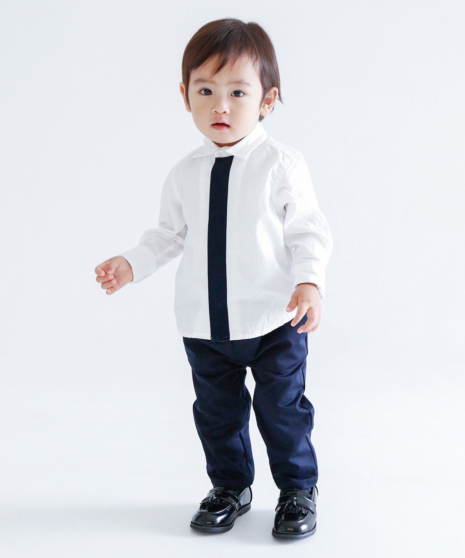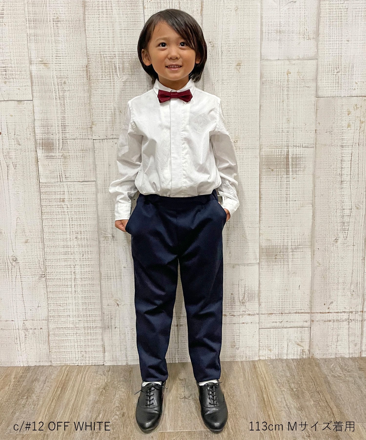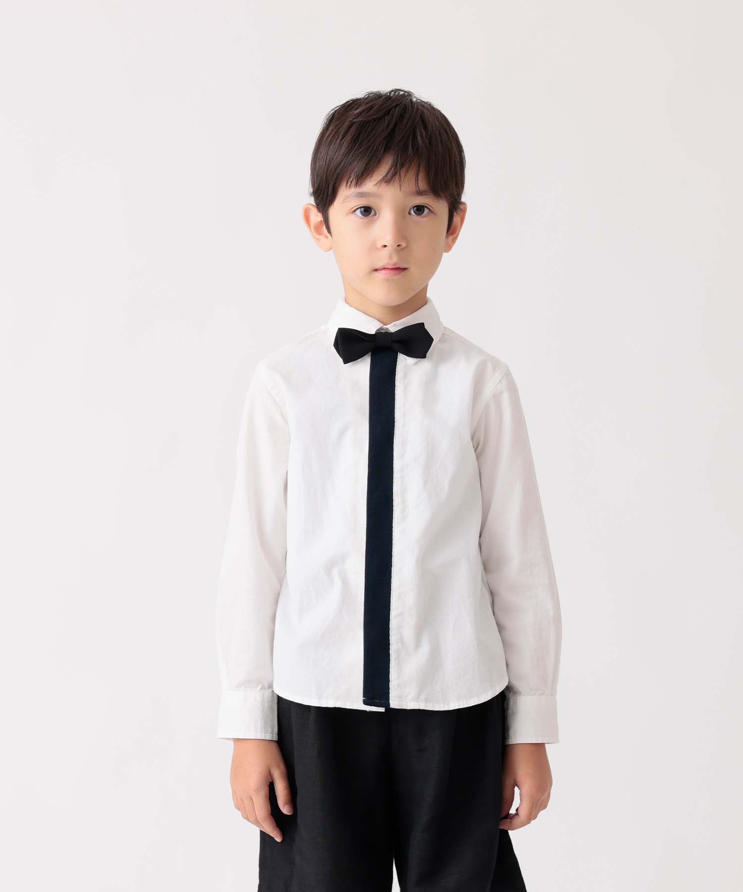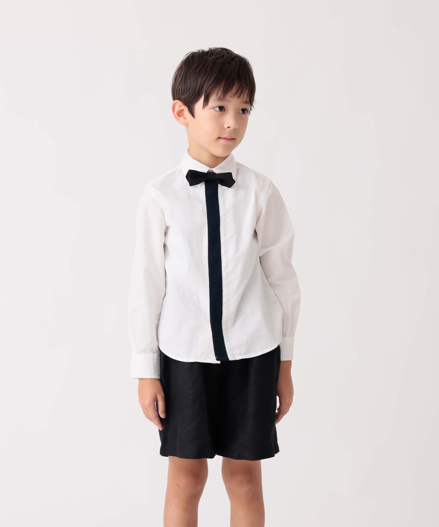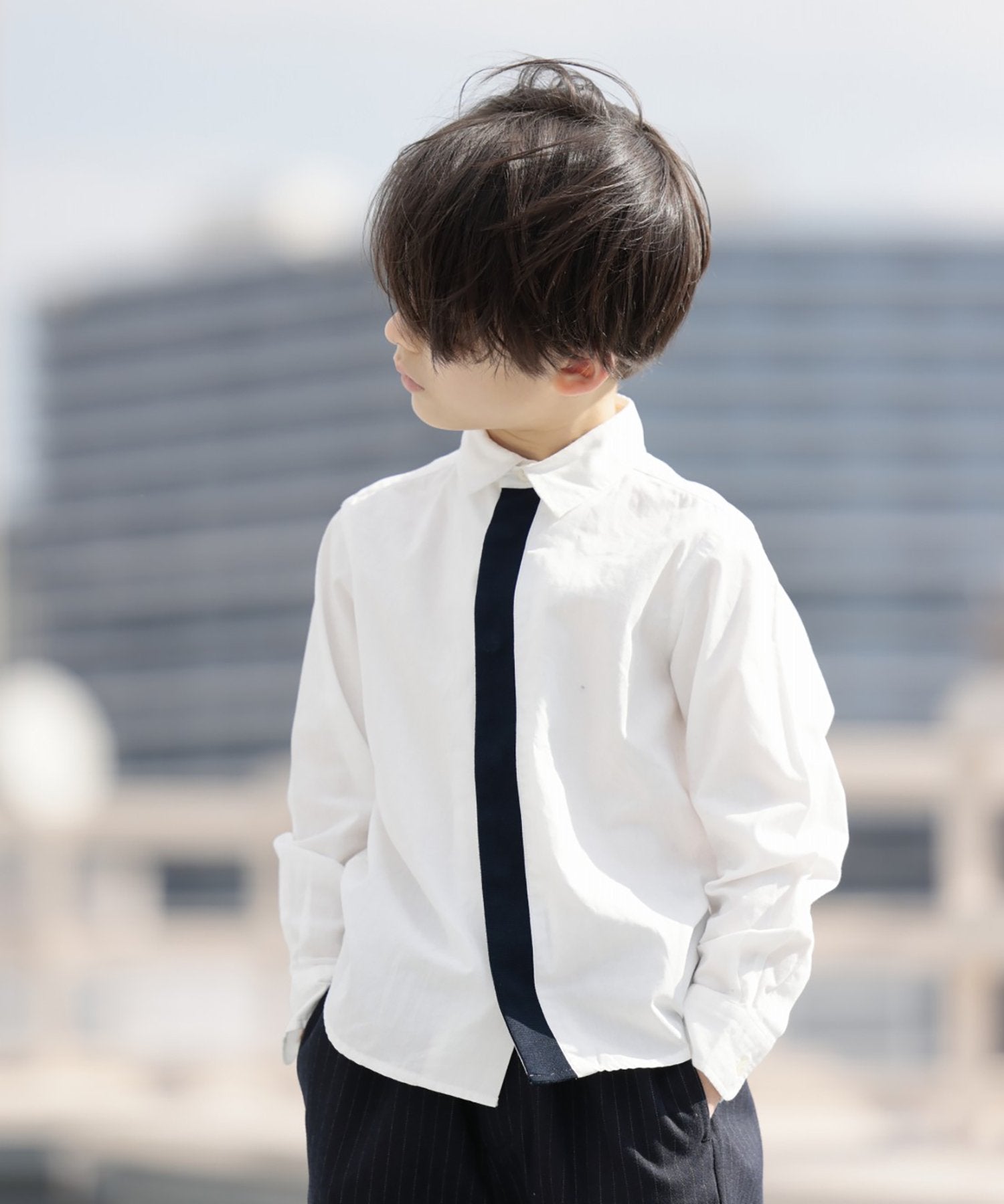 ■細節 門襟部分採用類似針織的材質,單穿起來就像繫了一條針織領帶。第二顆羈扣下方有一個圓點連結,方便孩子穿脫。 (第一顆紐帶和袖口扣環都是四孔紐扣,可以扣在扣眼上。)領子結構緊湊,日常使用也很方便。袖子的底部和兩側都向下折疊,從後面看很漂亮。該設計體現了孩子們體驗襯衫品質的願望。推薦給不喜歡領帶的孩子、不太正式的正式場合以及任何正式款式。