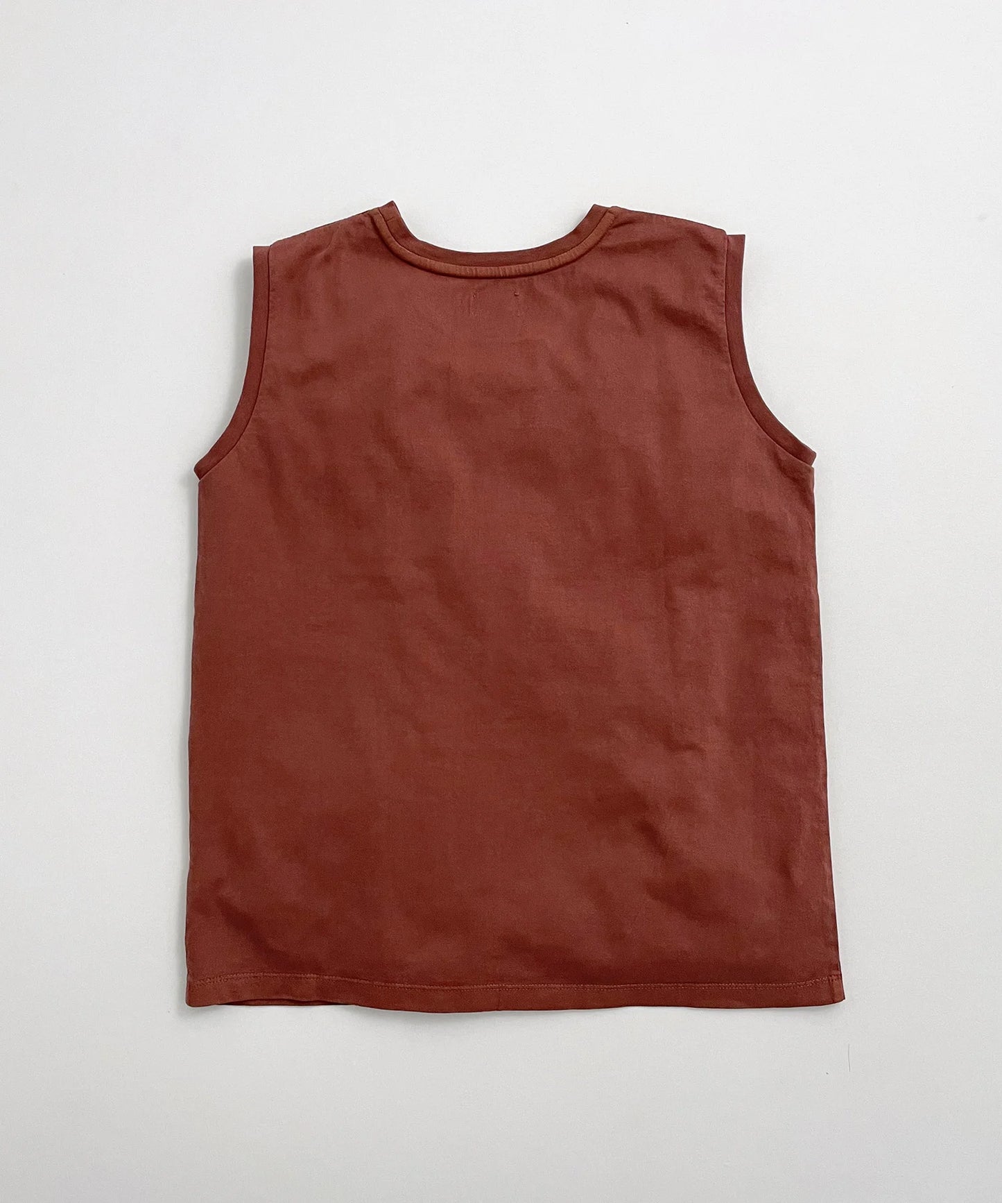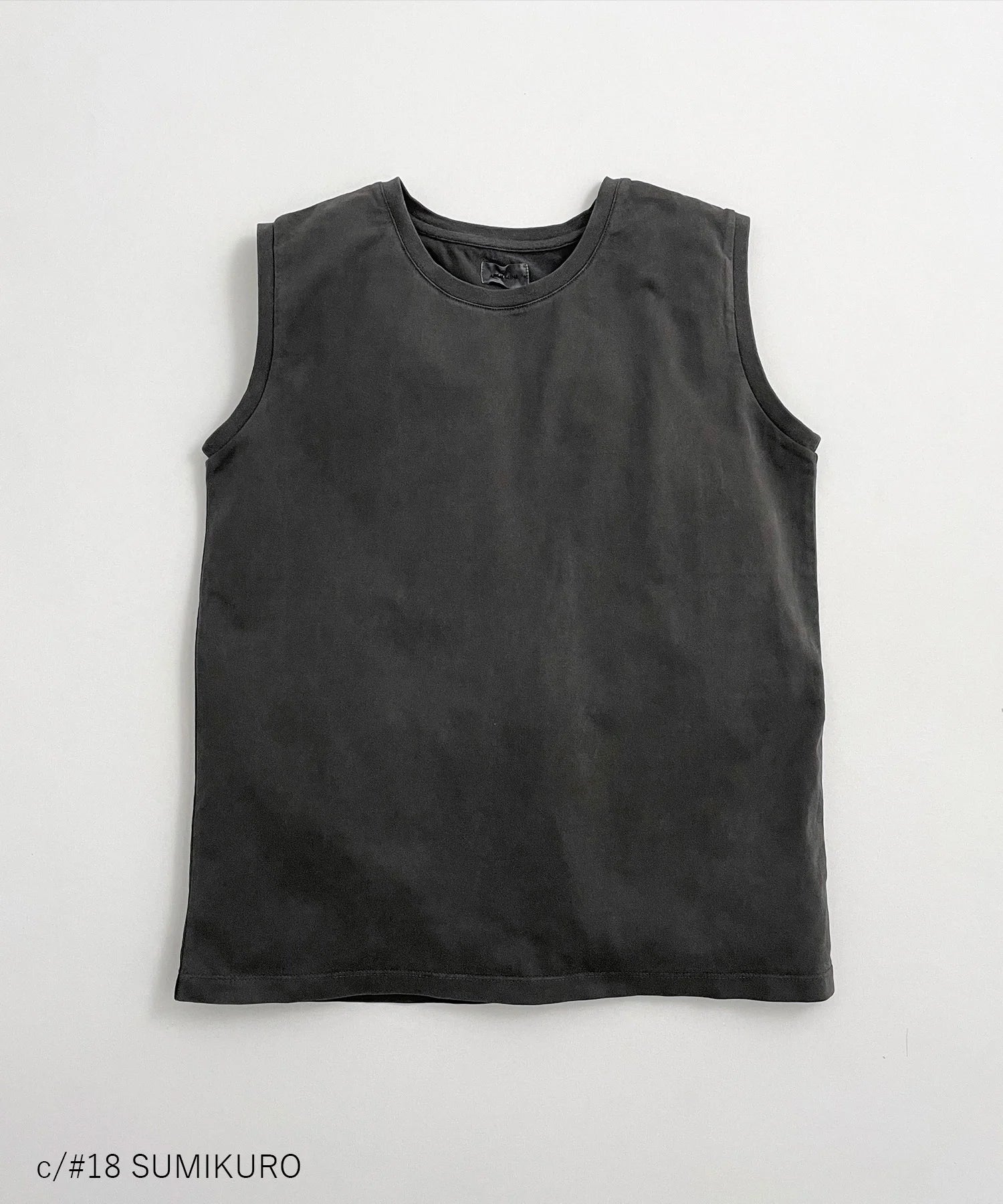 ■細節 有機棉製成的素色背心,充分發揮產品染色的質感和材質的品質,寬鬆的版型,感覺舒適,貼合身體,領子和AH的銑削寬度已縮小至看起來很漂亮。袖孔做得很緊,很難看到內衣。顏料染色(白色除外)有獨特的凹凸感,可以享受二手衣服的氛圍。反复洗滌時會出現這種情況衰老過程也是一個有趣的點。