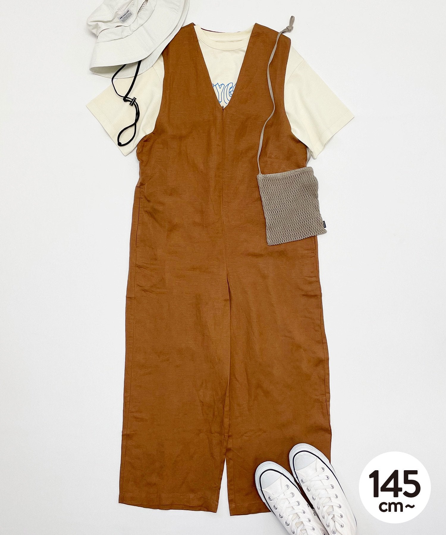 《環保材質》亞麻/人造絲 V/N 背帶褲 涼爽觸感 開/關使用 設定相容 [145-165cm]