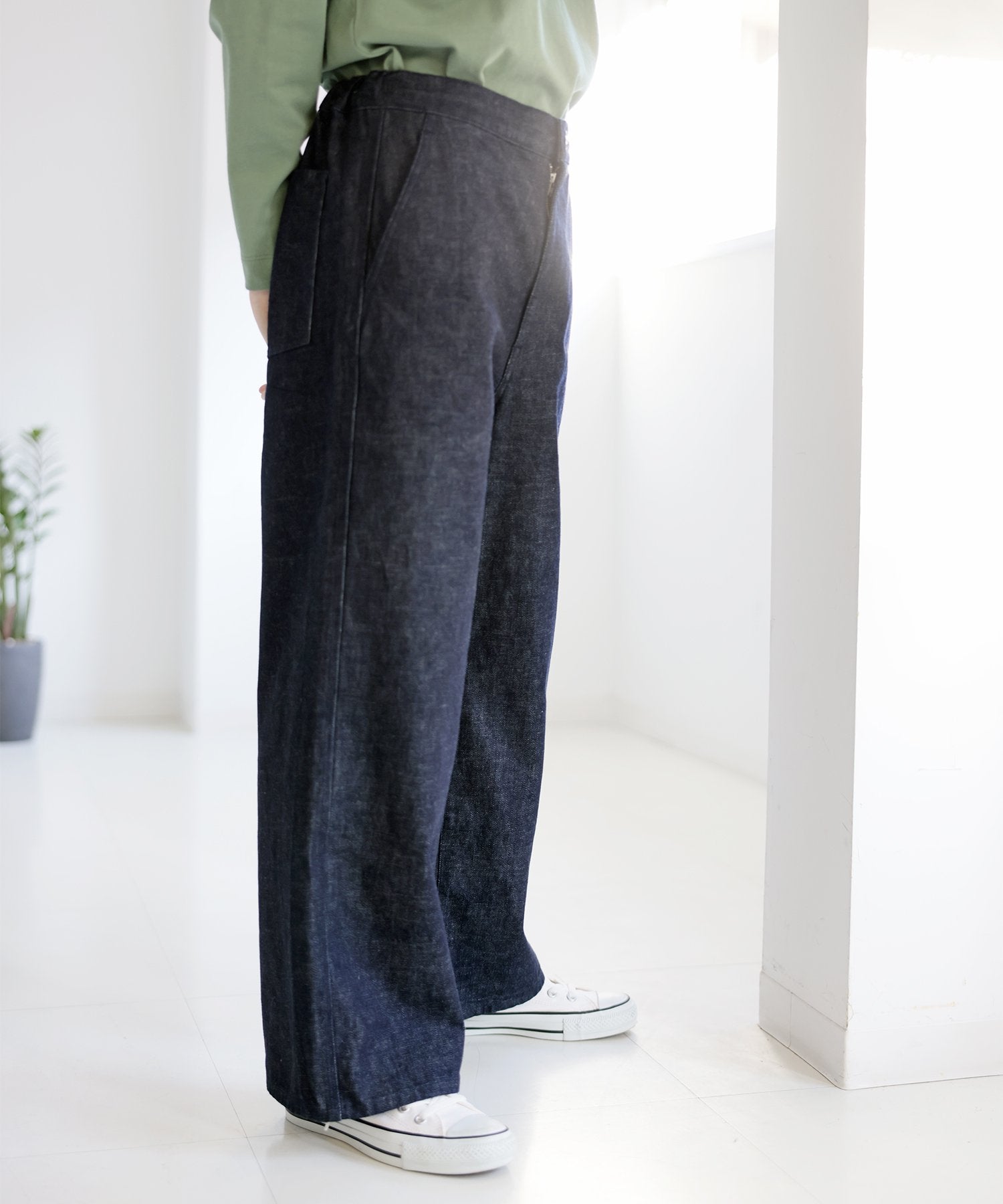 ■細節 再生棉混紡牛仔褲。輪廓略寬。我們將畫家褲安排得易於日常穿著。側面的三重縫線和大口袋是微妙的設計點,S到1碼的左側有一個鬆緊開口,可以根據自己的喜好和成長,透過更換鬆緊來調整。2,3腰部尺寸可透過拉鍊和扣安裝和拆卸。腰部有一條繩子,可依您的喜好稍微調整。c/#63 淺藍色 c/#67 靛藍一洗