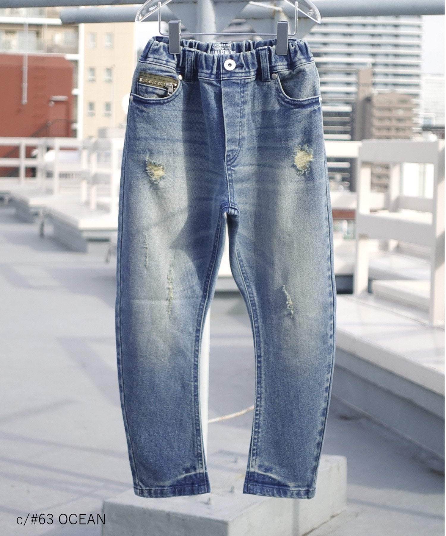 c/#63 淡色ブリーチ加工+穴あき加工(裏側に当て布あり)
