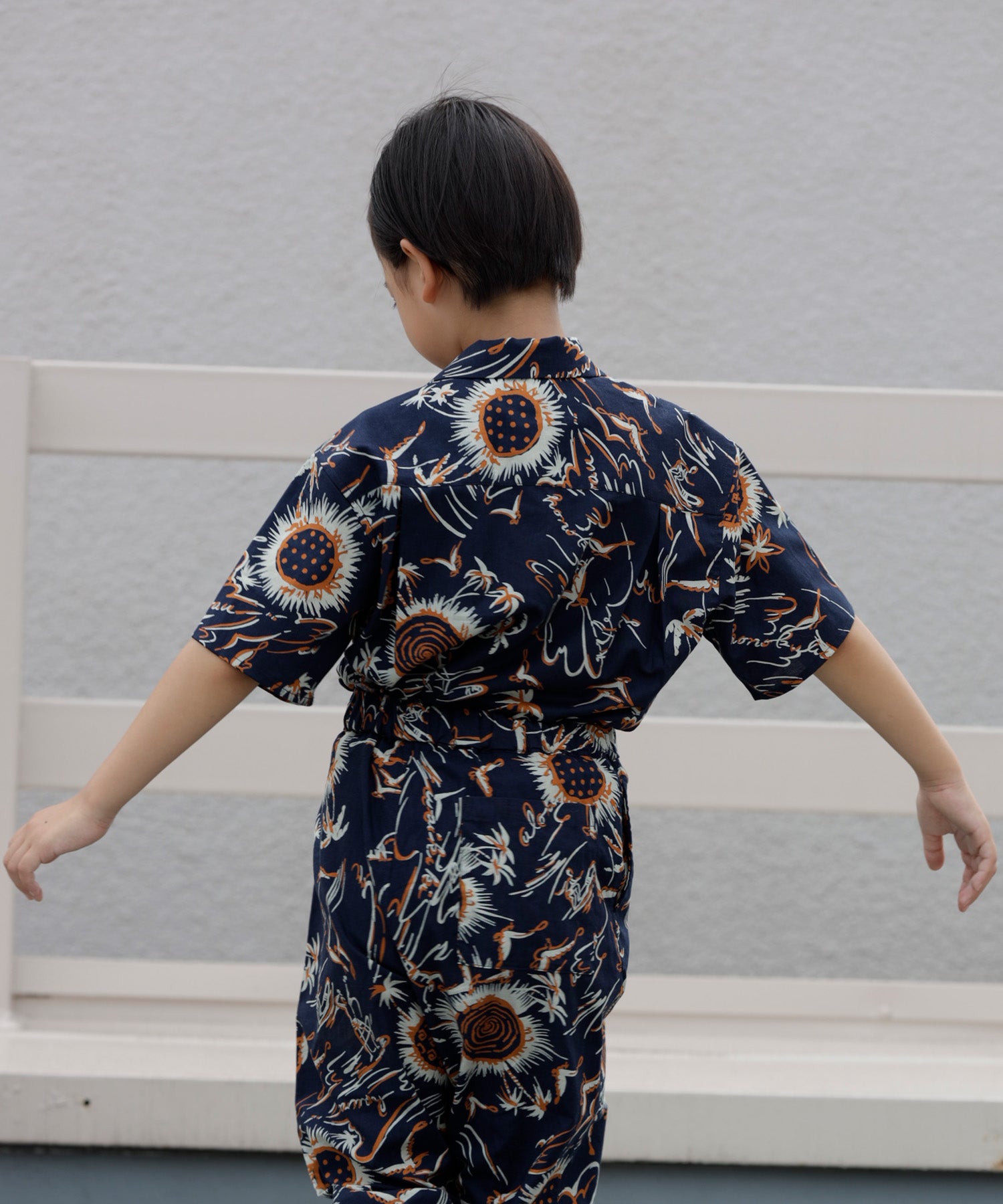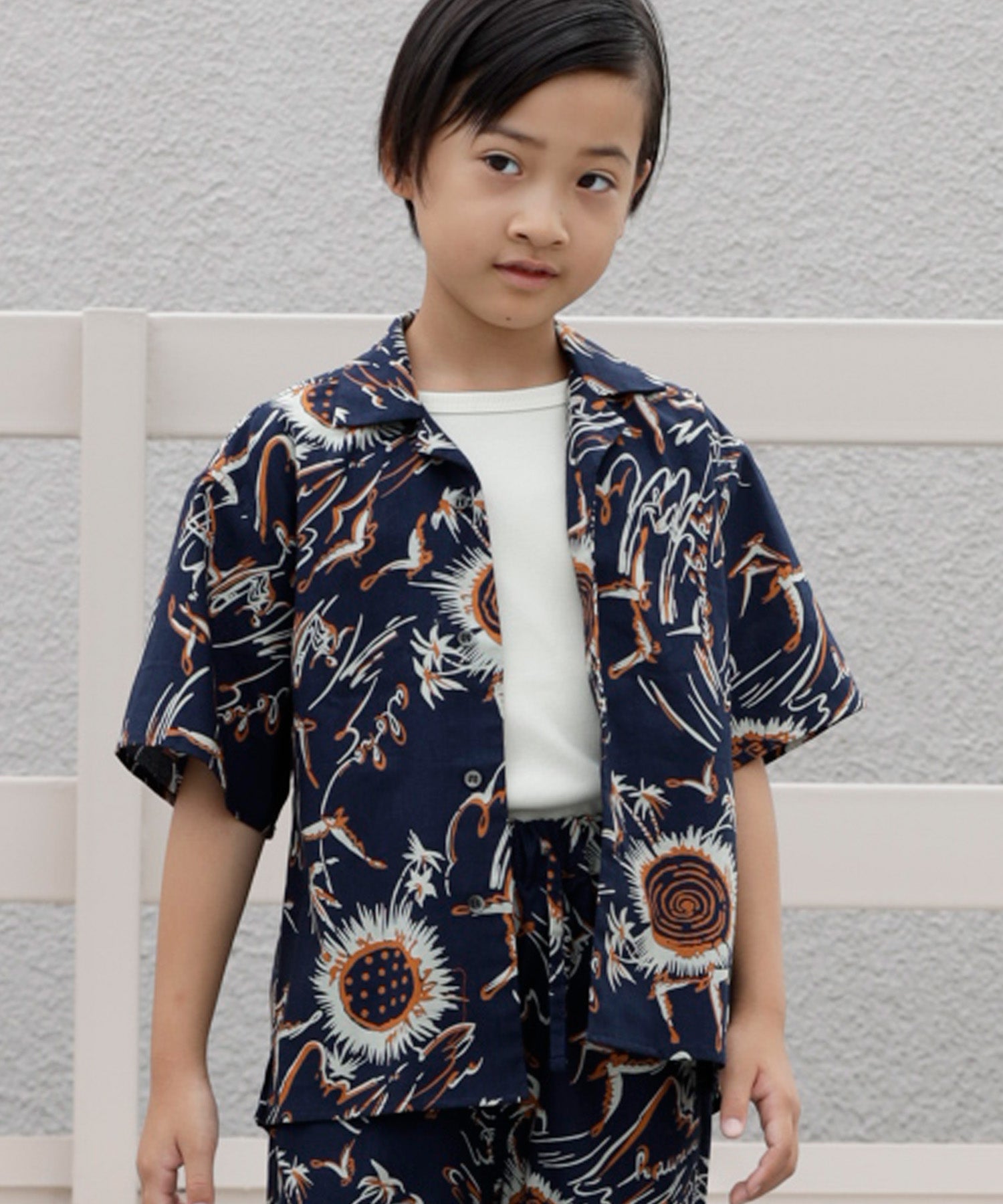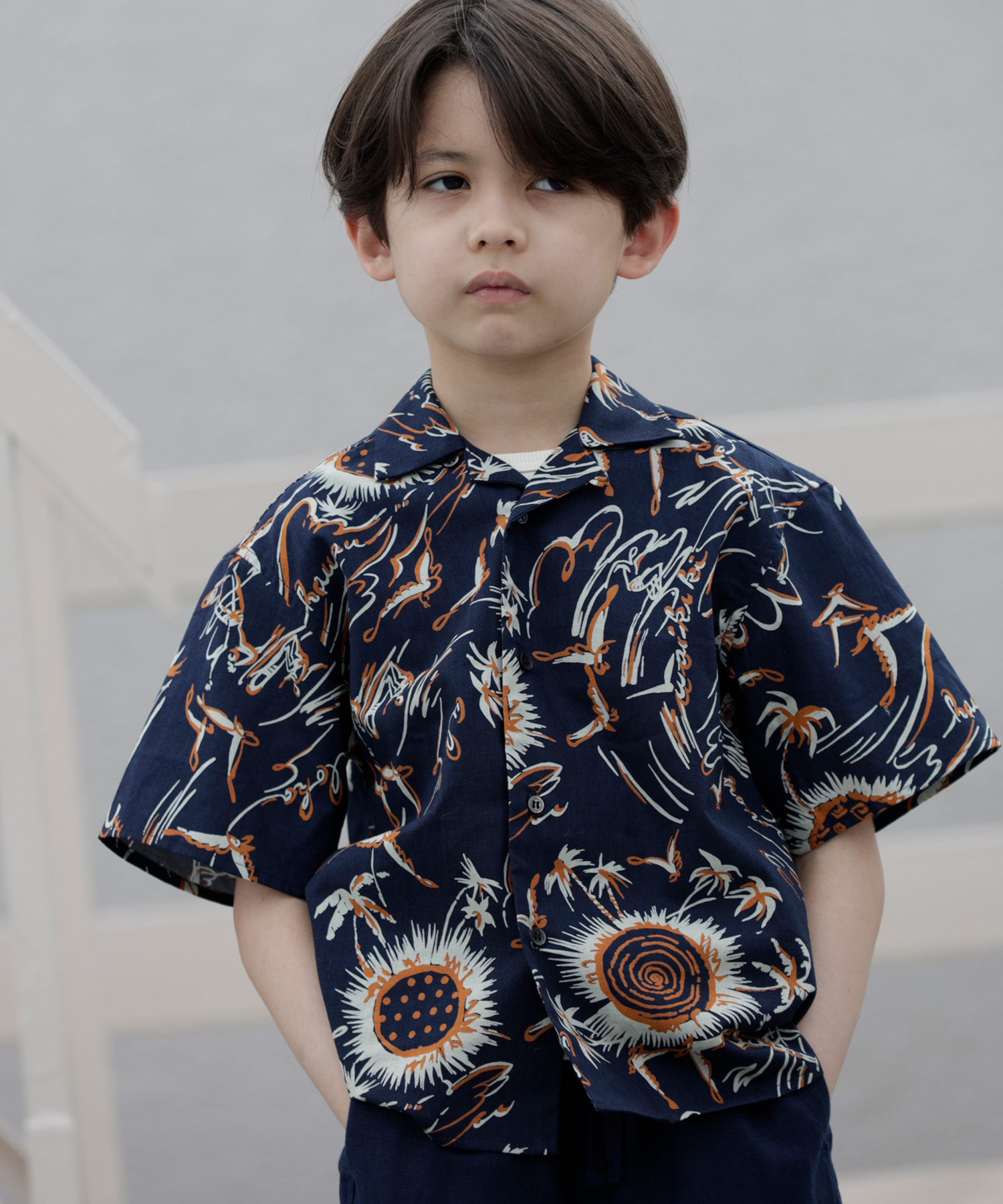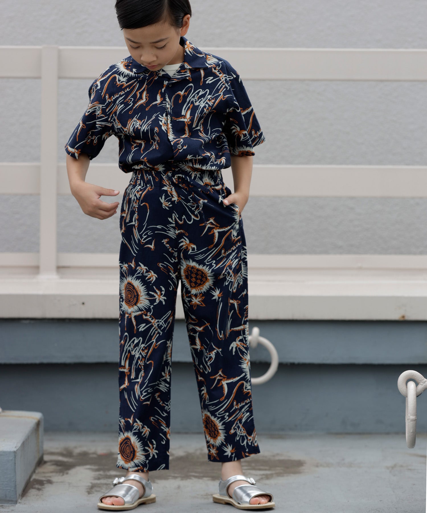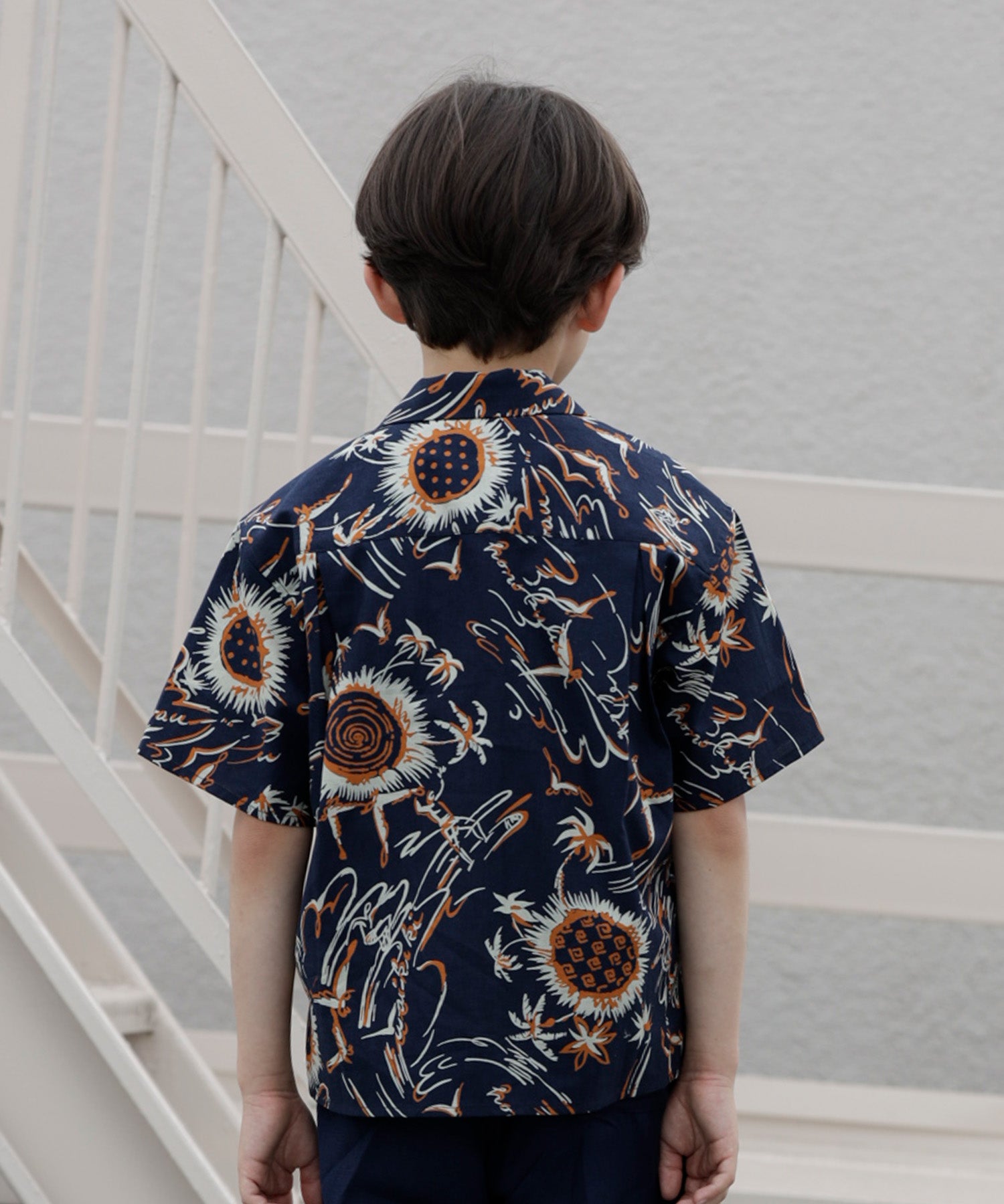 プリント柄は太陽にもヒマワリにも見える物体とヤシの木など、抽象的な手書きモチーフで大人も着やすいデザイン。