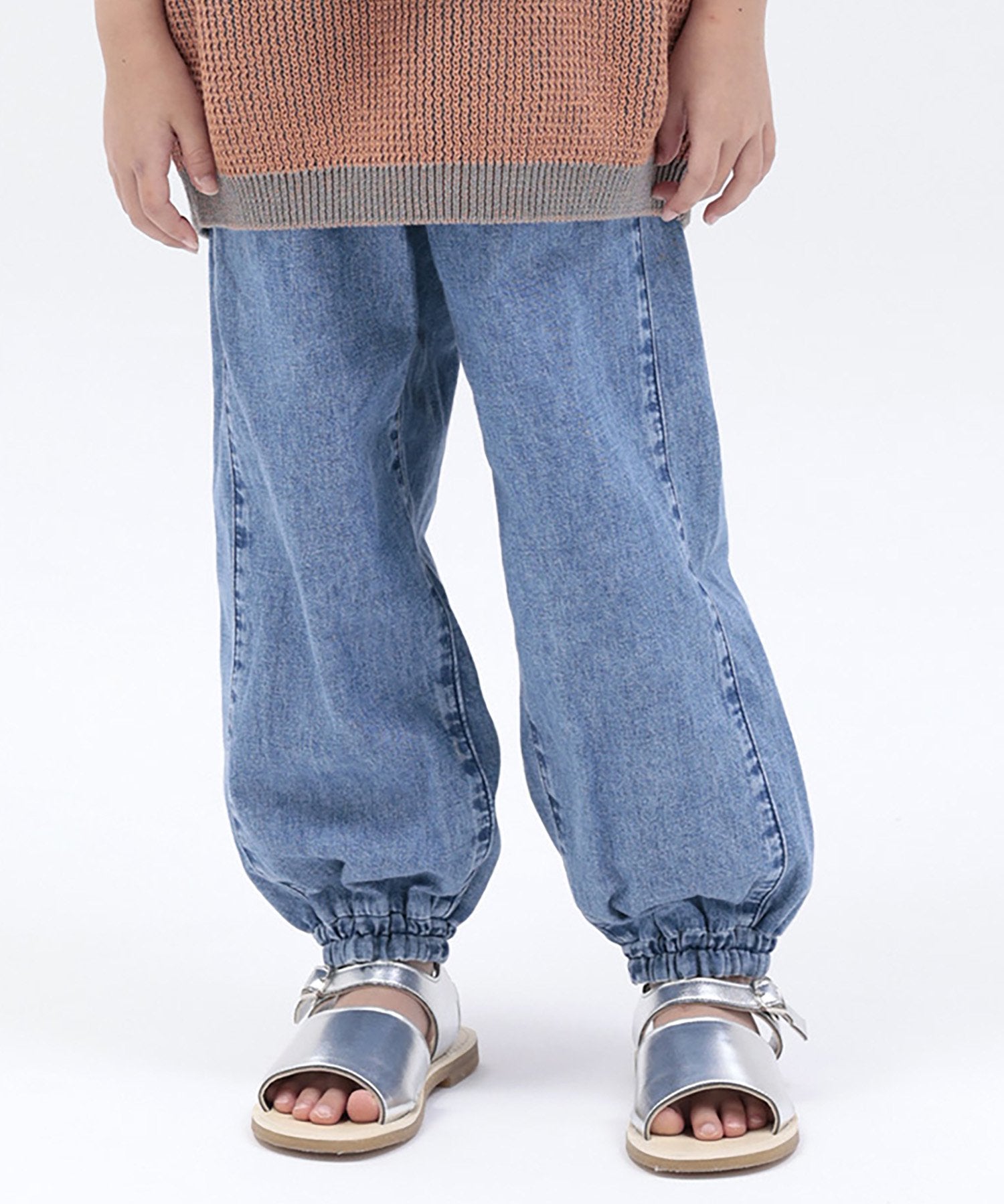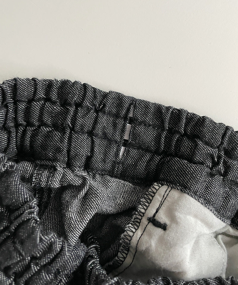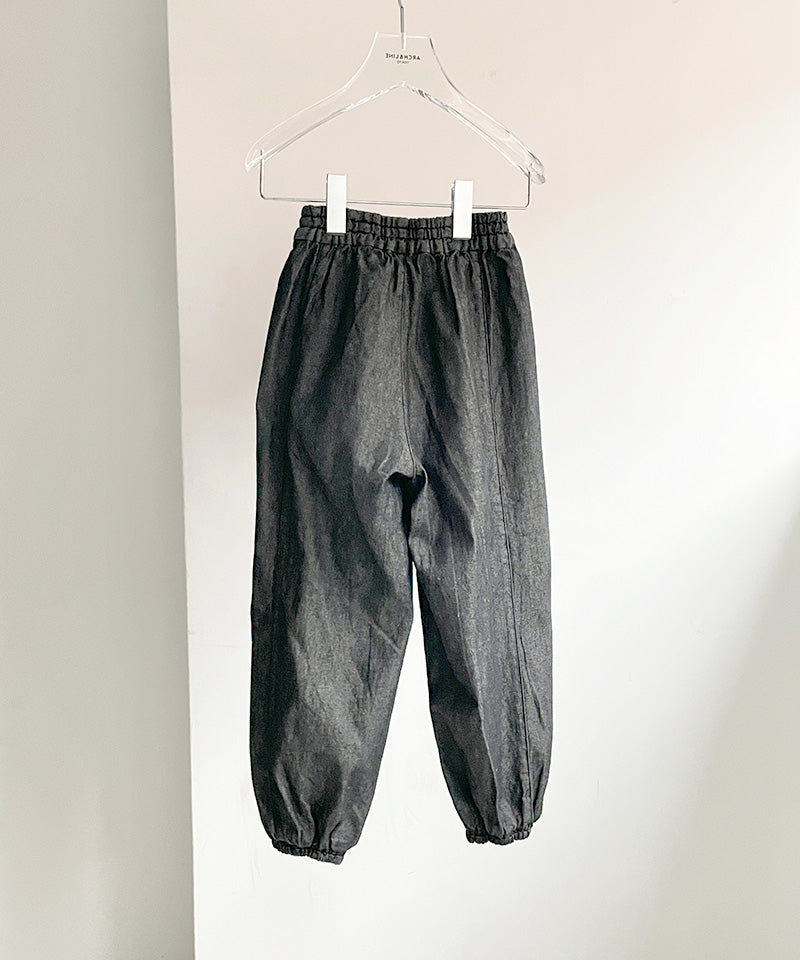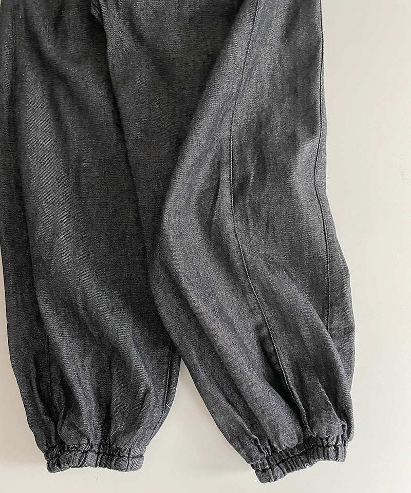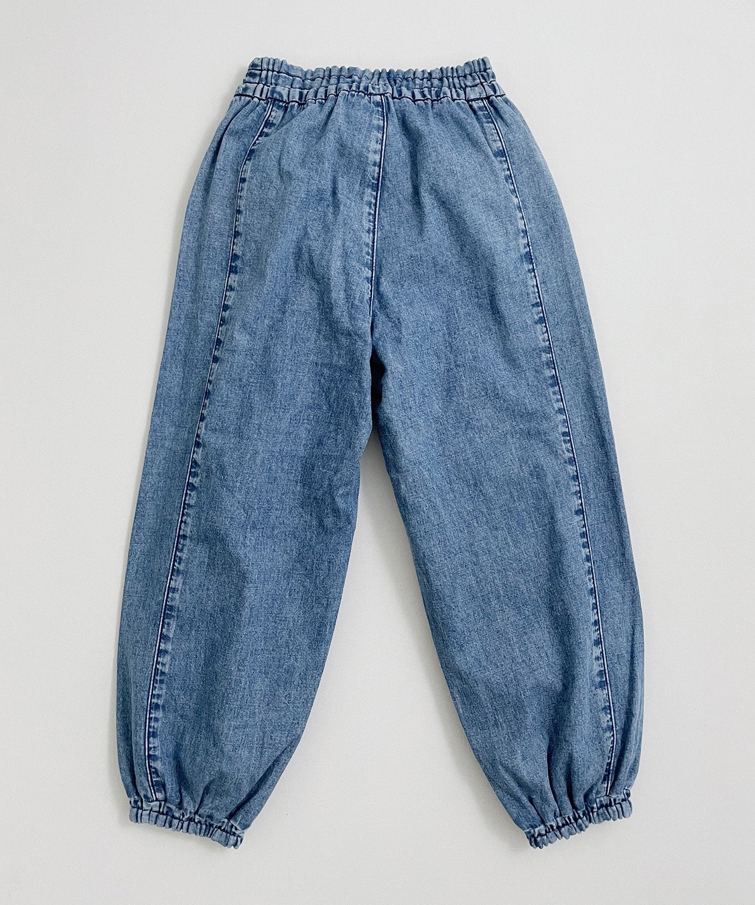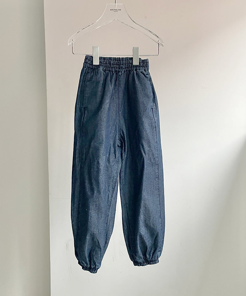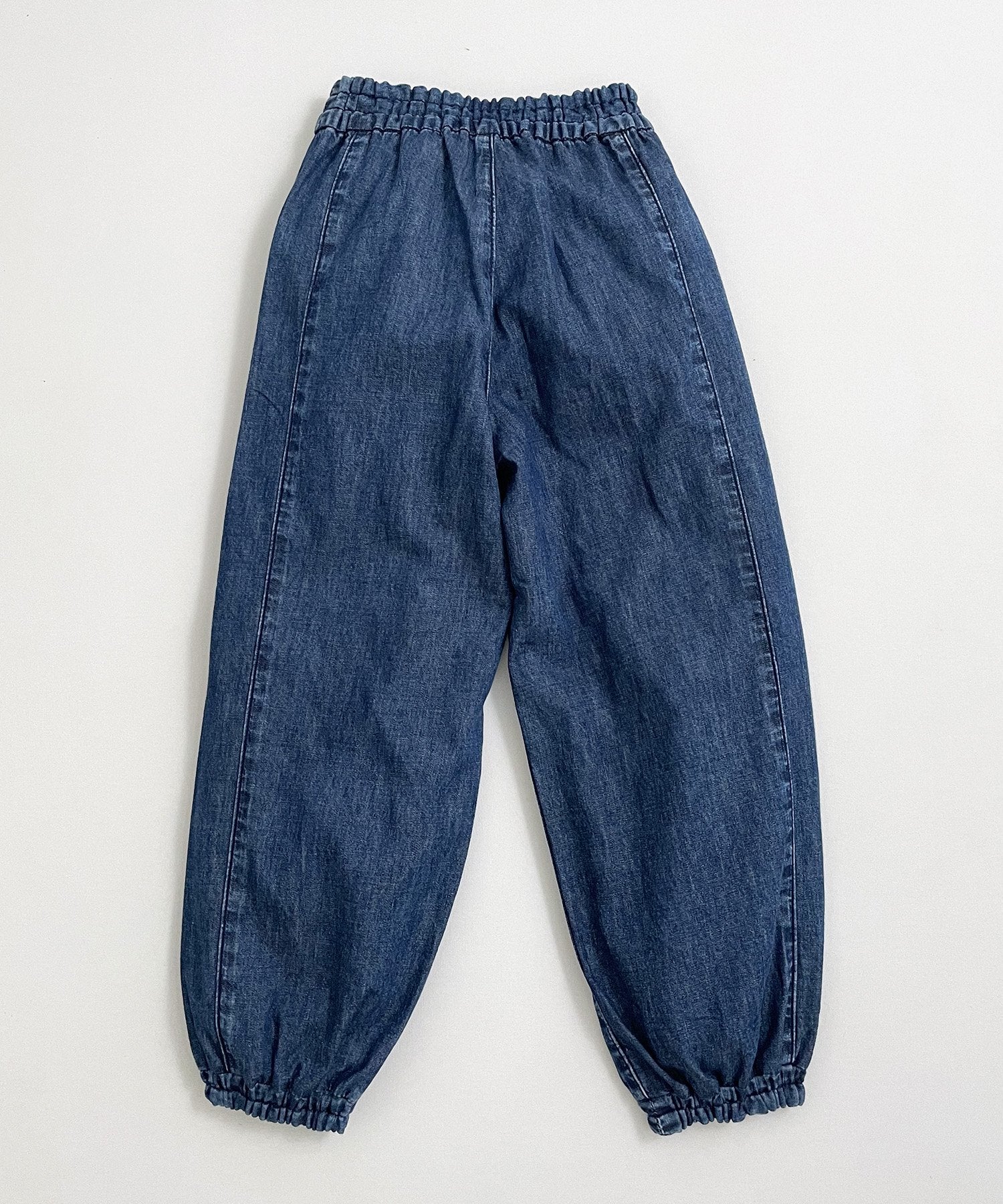 人気のアラジンパンツがデニム素材で登場。アラジンが履いているパンツに似ていることが名前の由来。脇の切り替えがポイント。裾にゴムを入れることで自転車にも乗りやすい作りになっています。ウエストゴムは、通常1本のところを細いゴムを3本通すことで肌当たりが柔らかくなるよう仕上げています。また、パターンを工夫することで足を上げやすくなっています。おうちでリラックスする時にも便利な一着です。