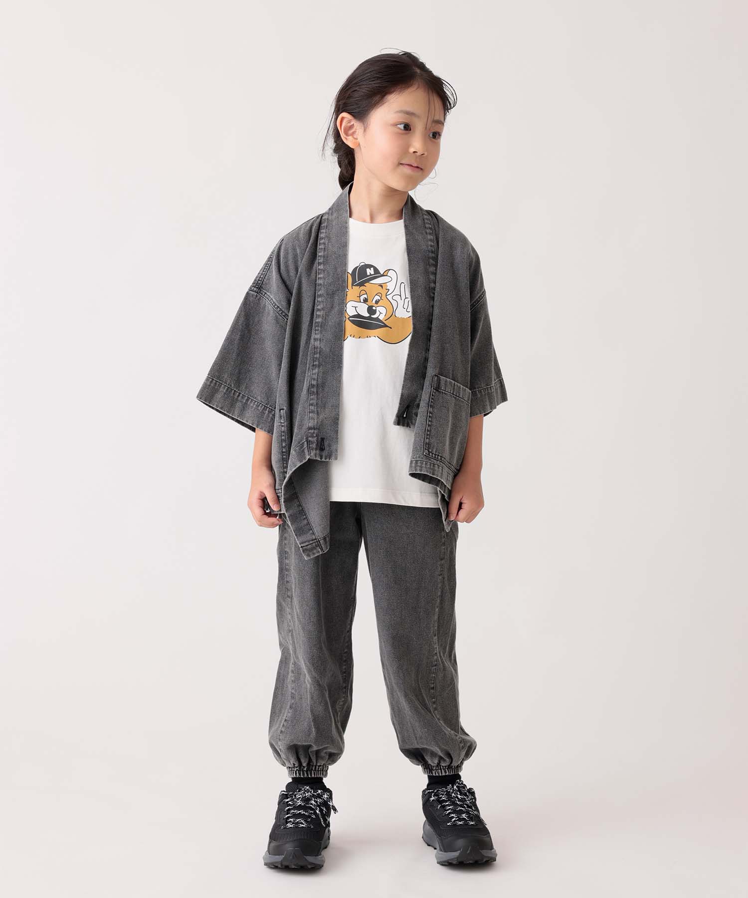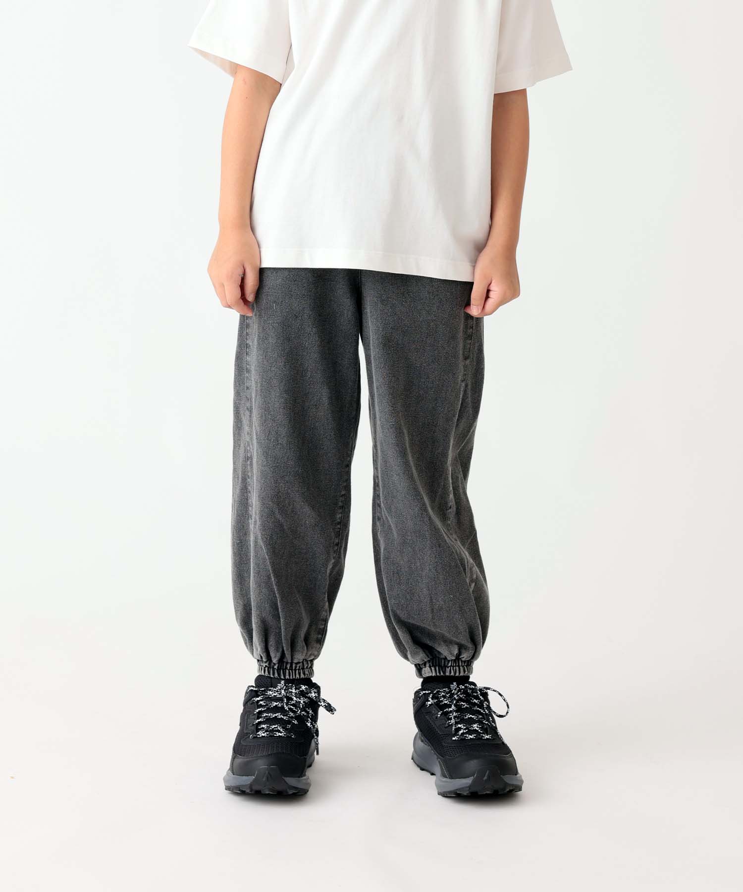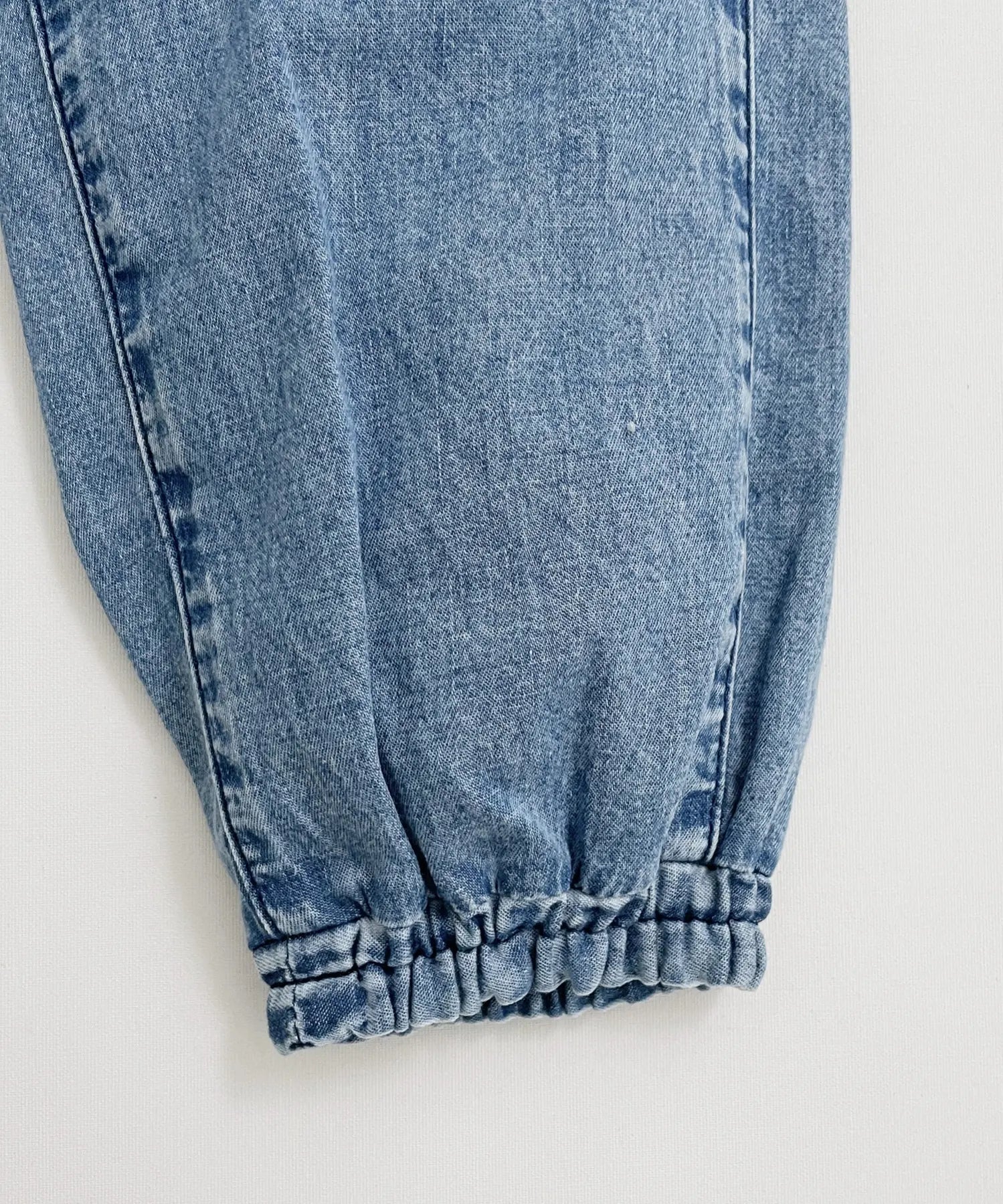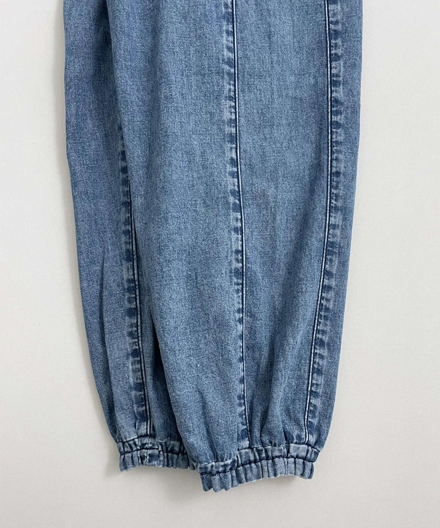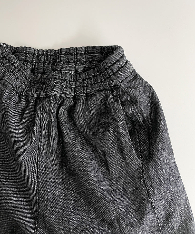 人気のアラジンパンツがデニム素材で登場。アラジンが履いているパンツに似ていることが名前の由来。脇の切り替えがポイント。裾にゴムを入れることで自転車にも乗りやすい作りになっています。ウエストゴムは、通常1本のところを細いゴムを3本通すことで肌当たりが柔らかくなるよう仕上げています。また、パターンを工夫することで足を上げやすくなっています。おうちでリラックスする時にも便利な一着です。