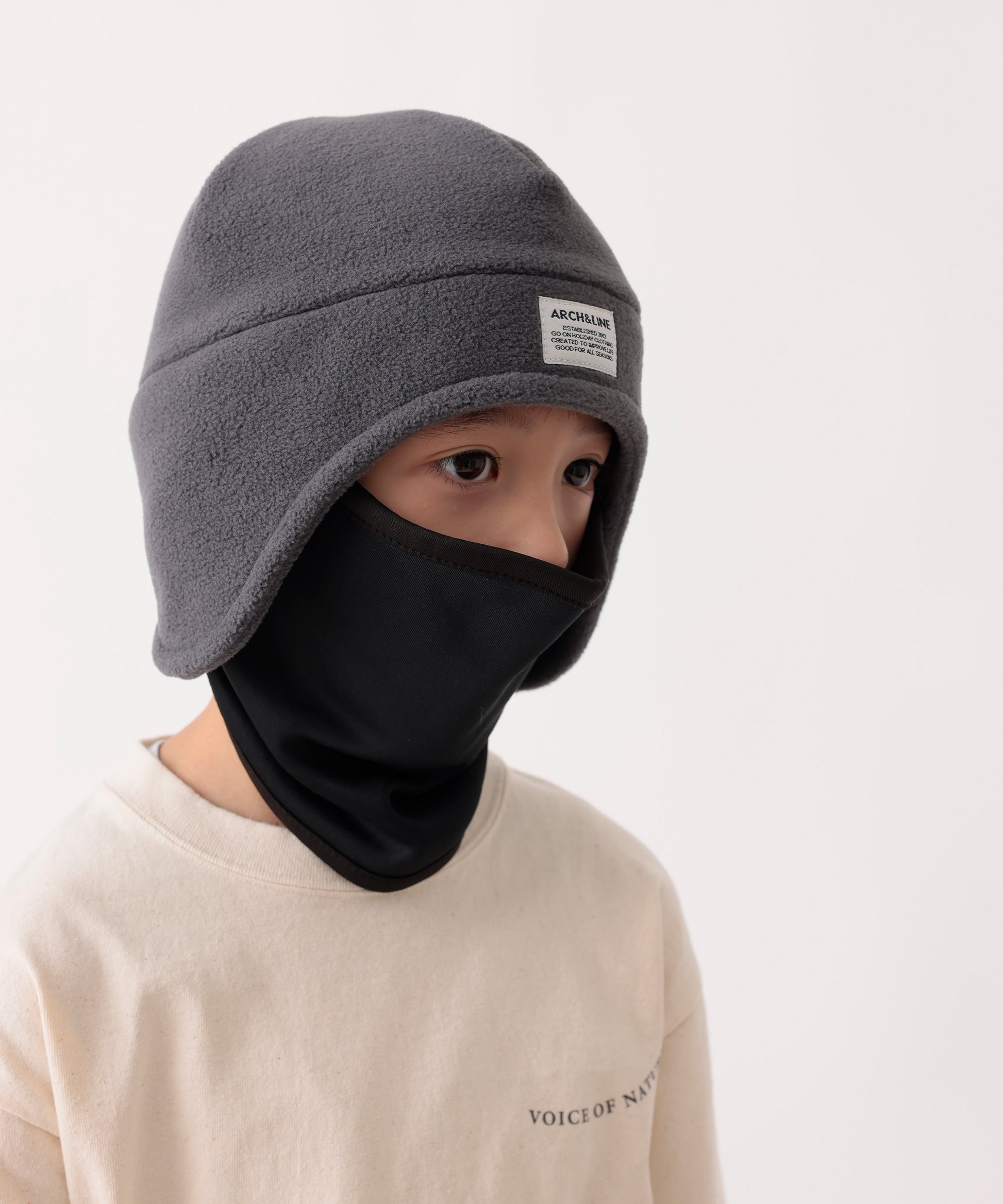 頭部にGRS認証リサイクルフリースを使用した、新型の2WAYキャップ。生地は両面起毛されており、耳から頬まで覆うことができあたたか。本気の寒い日や自転車に乗る時などは、内蔵されたフェイスガードで鼻から顎を覆えば最強です。フェイスガードが不要な日は頭部にしまってかぶることも出来ます。同素材のフリースパーカーと合わせれば、冬の準備は万端。