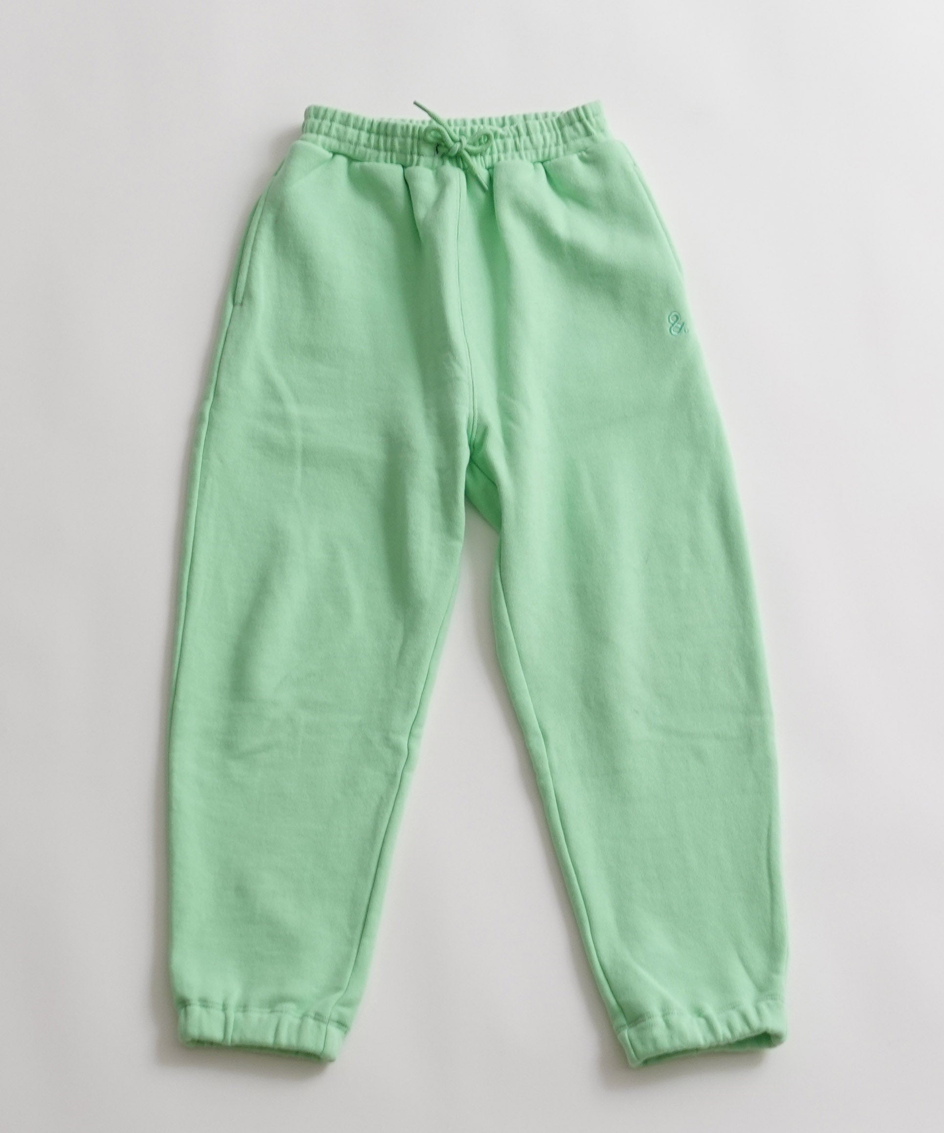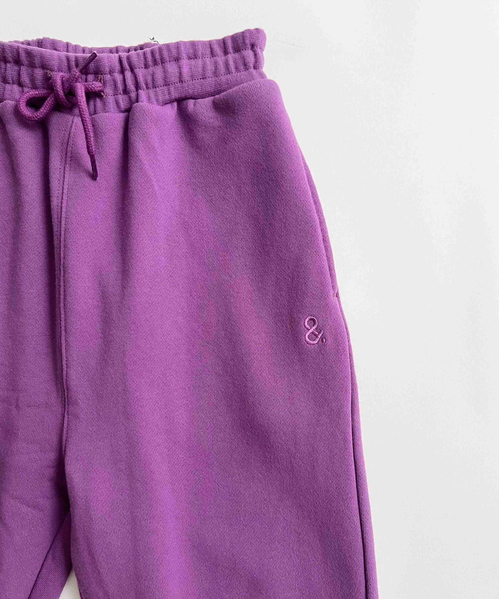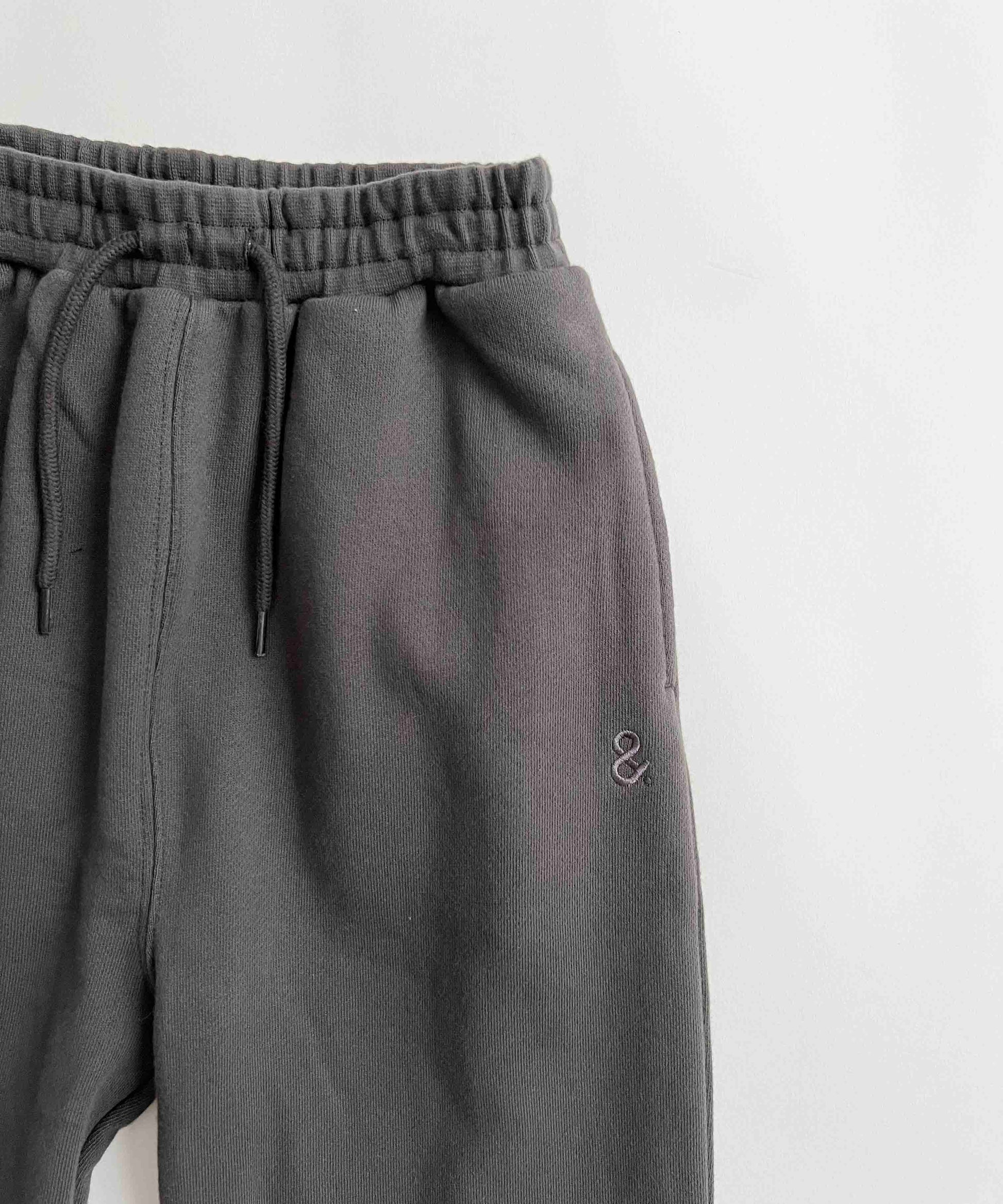 デイリー使いにぴったりな裏毛パンツ。裾にゴムを入れてややすぼませたジョガー型。ポケット下に入れた&の刺繍も効いています。左脇にはゴム通し口があり、お好みや成長に合わせてゴムの入れ替えで調整していただけます。