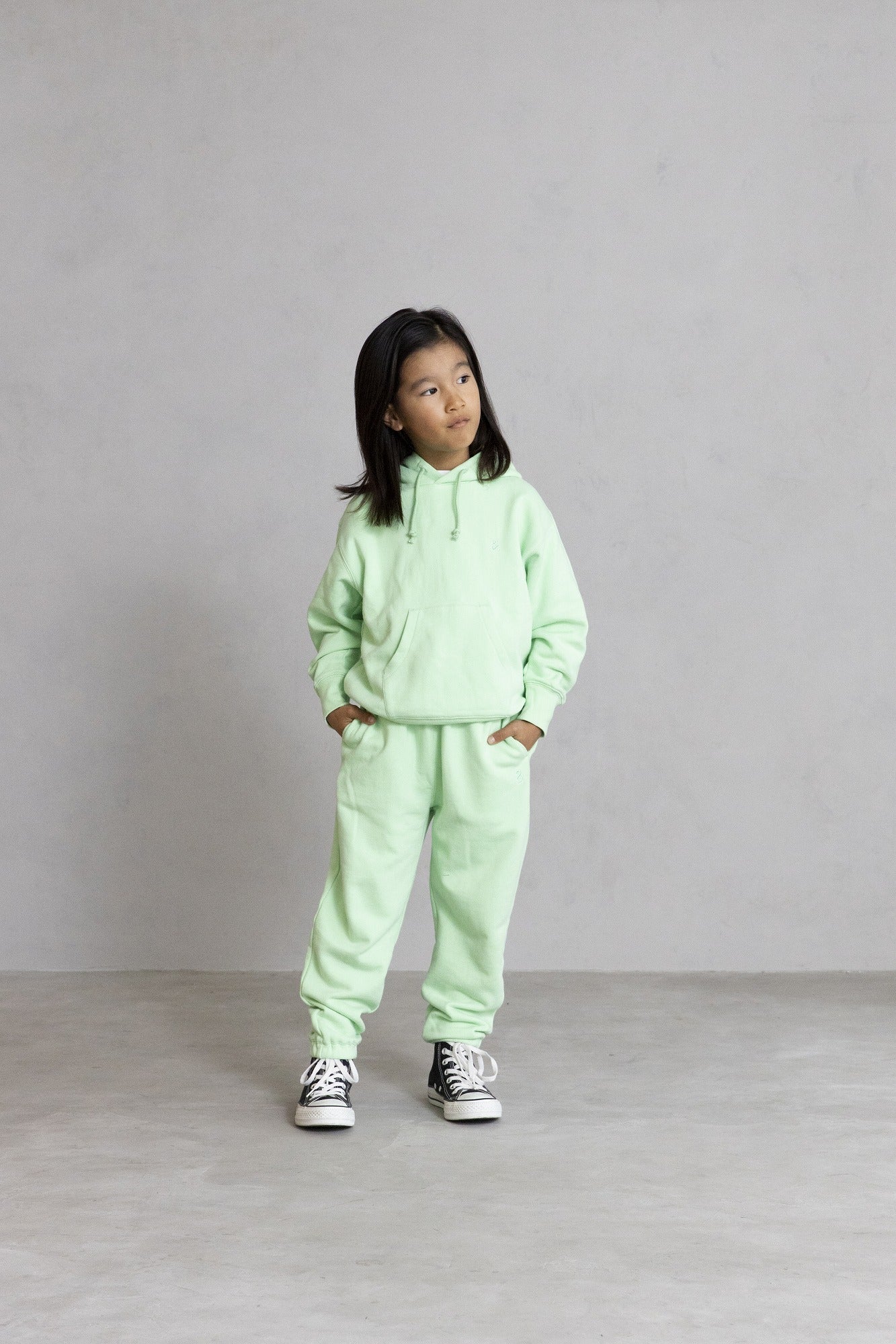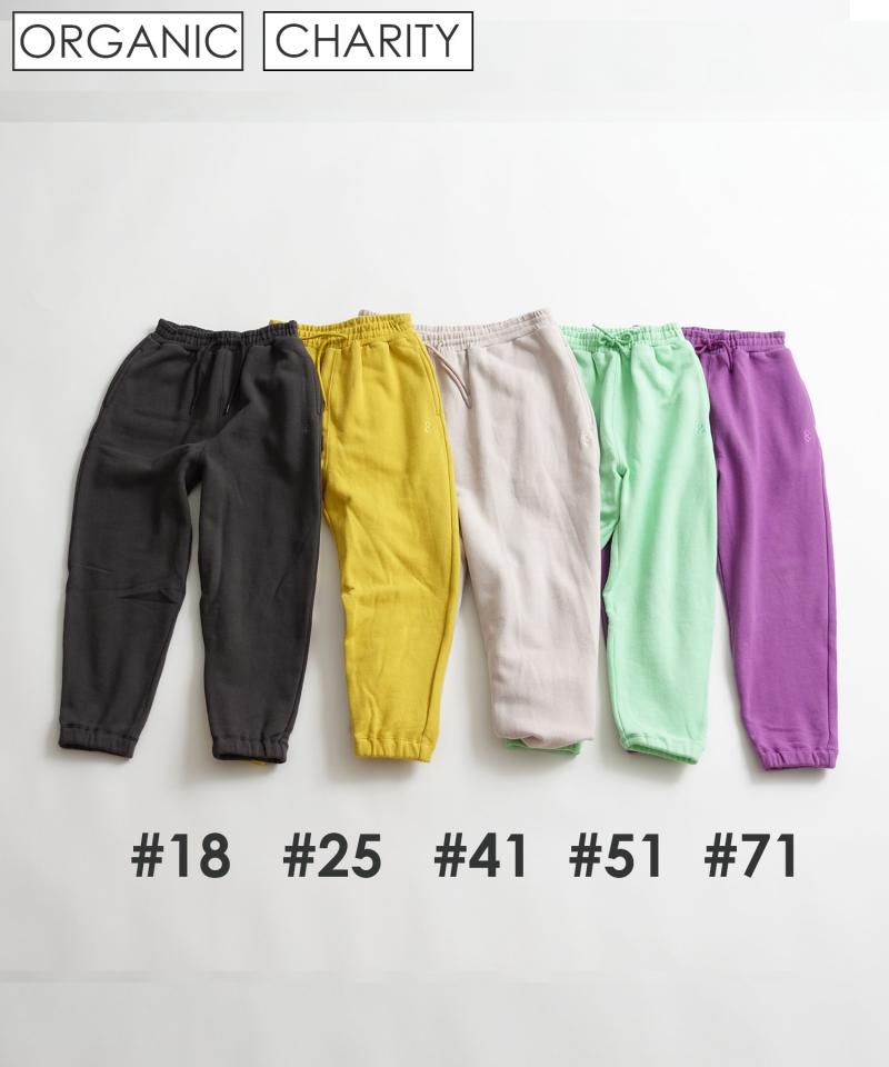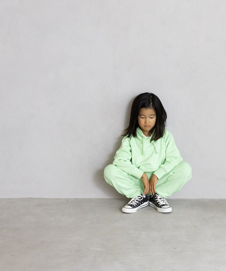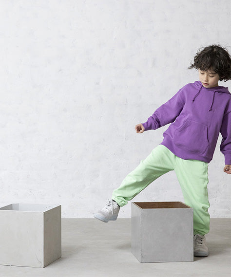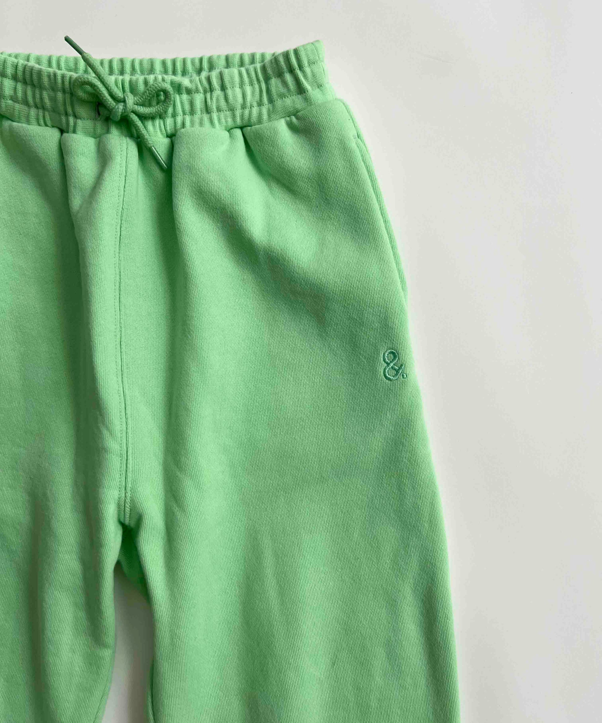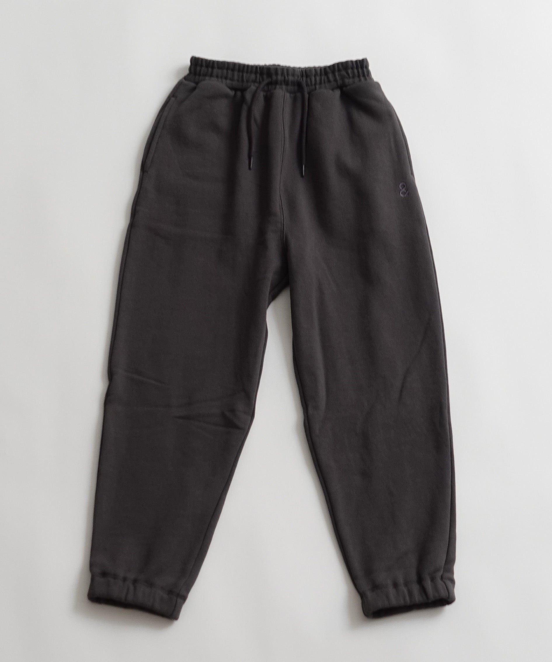 デイリー使いにぴったりな裏毛パンツ。裾にゴムを入れてややすぼませたジョガー型。ポケット下に入れた&の刺繍も効いています。左脇にはゴム通し口があり、お好みや成長に合わせてゴムの入れ替えで調整していただけます。