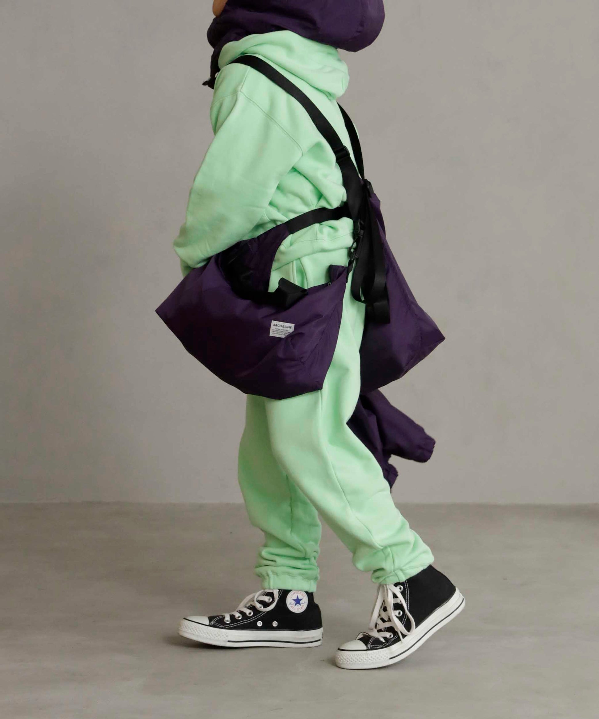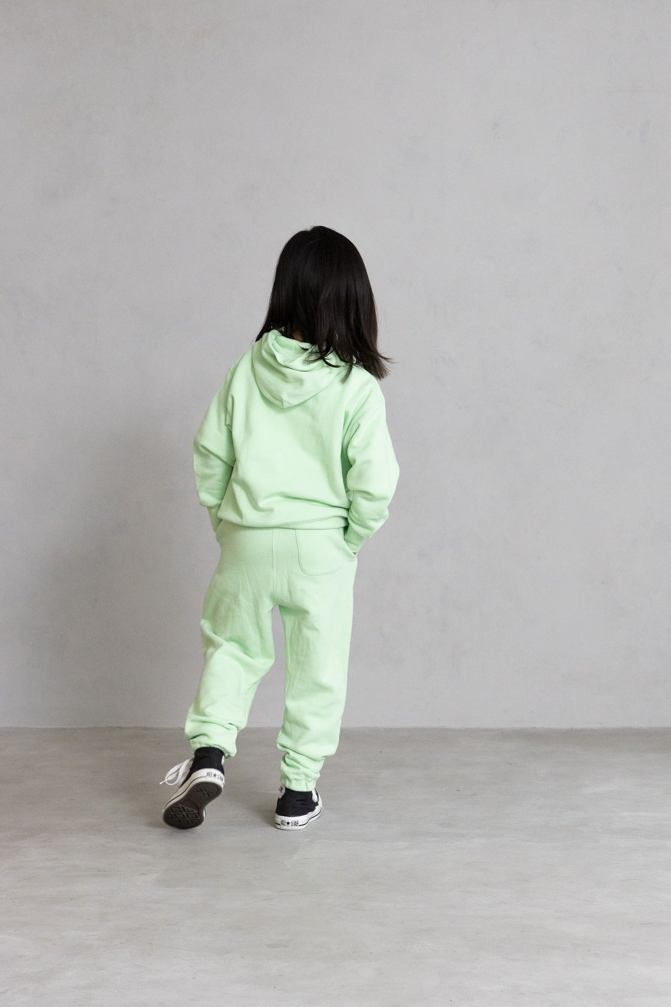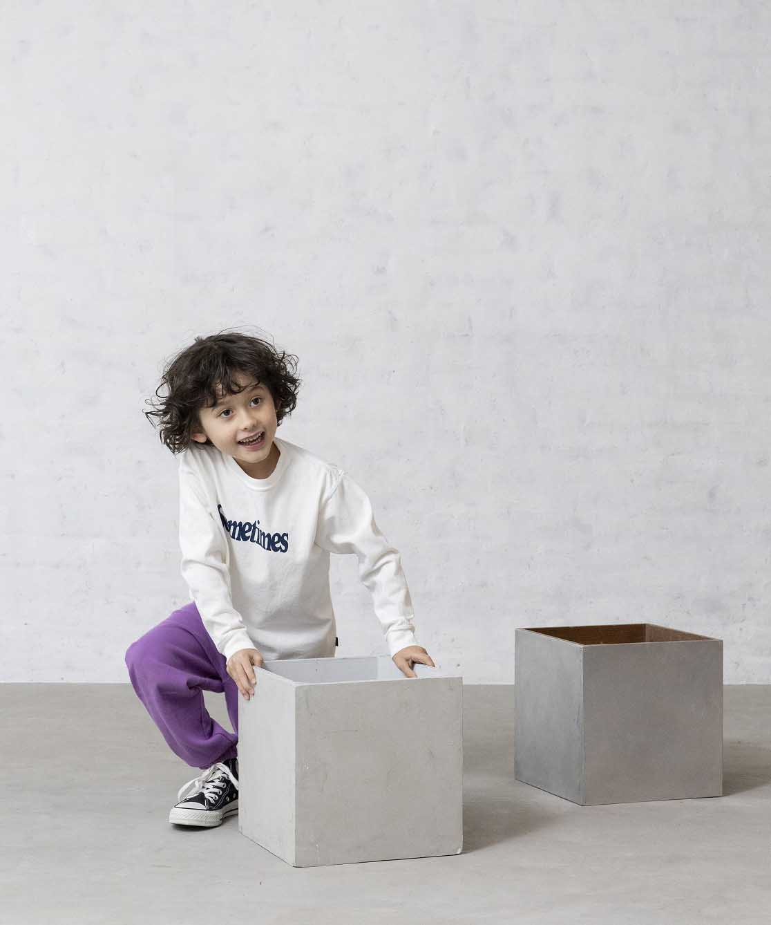 デイリー使いにぴったりな裏毛パンツ。裾にゴムを入れてややすぼませたジョガー型。ポケット下に入れた&の刺繍も効いています。左脇にはゴム通し口があり、お好みや成長に合わせてゴムの入れ替えで調整していただけます。