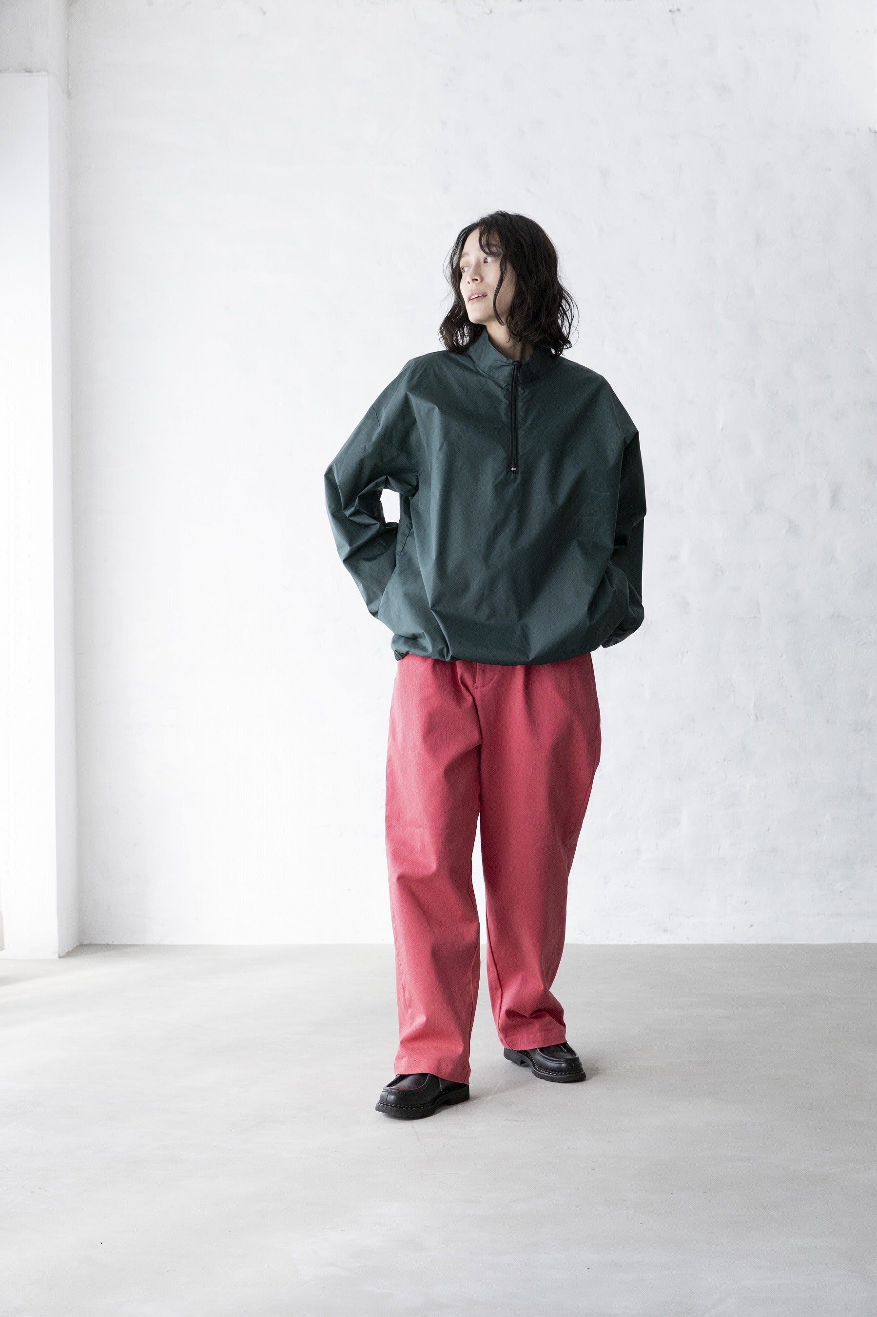リサイクルナイロンを使用したハーフジッププルオーバー。裏毛やニットより軽くて持ち運びもしやすく、案外保温もしてくれるので注目しているアイテムの一つです。両脇にポケット付き。