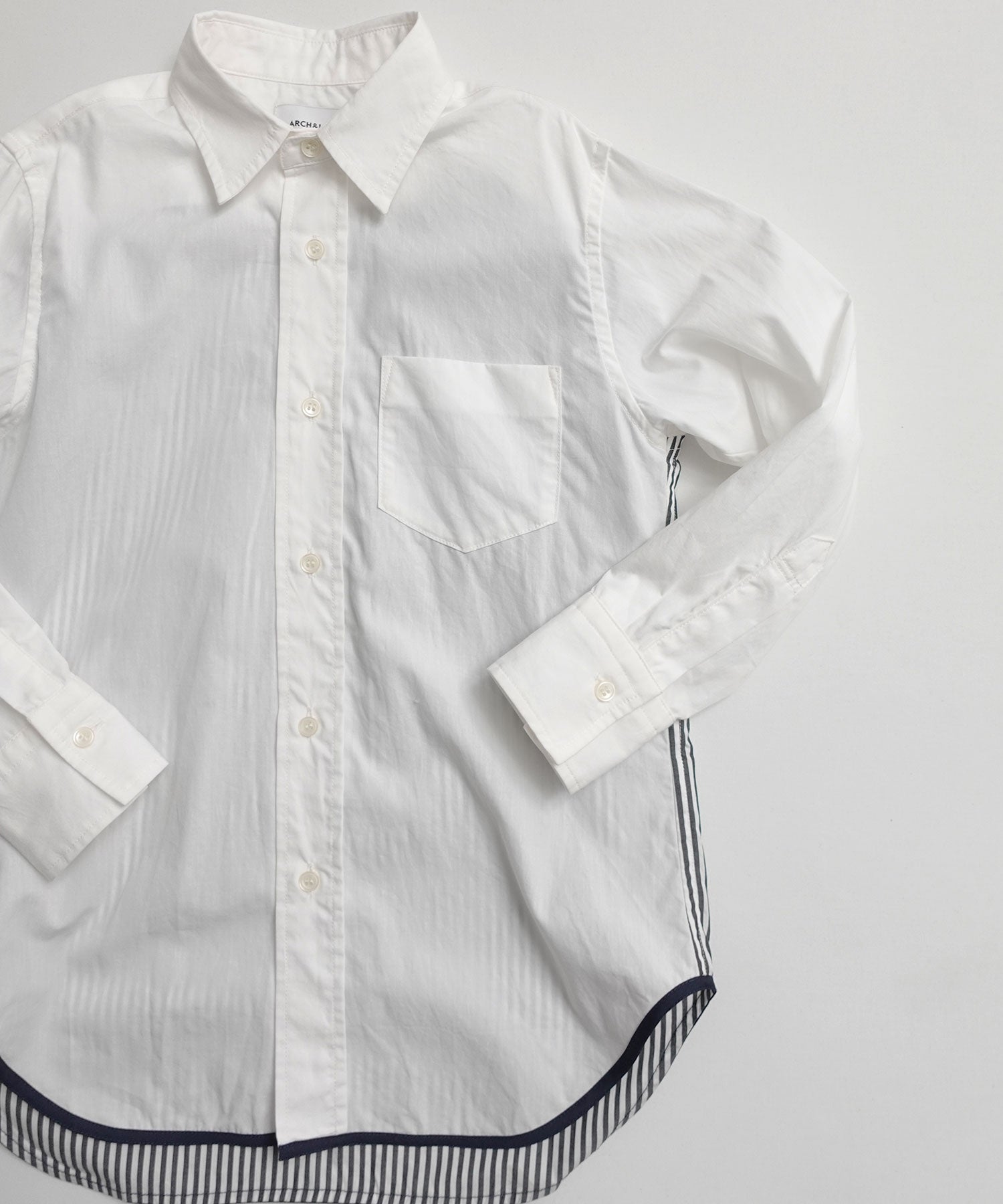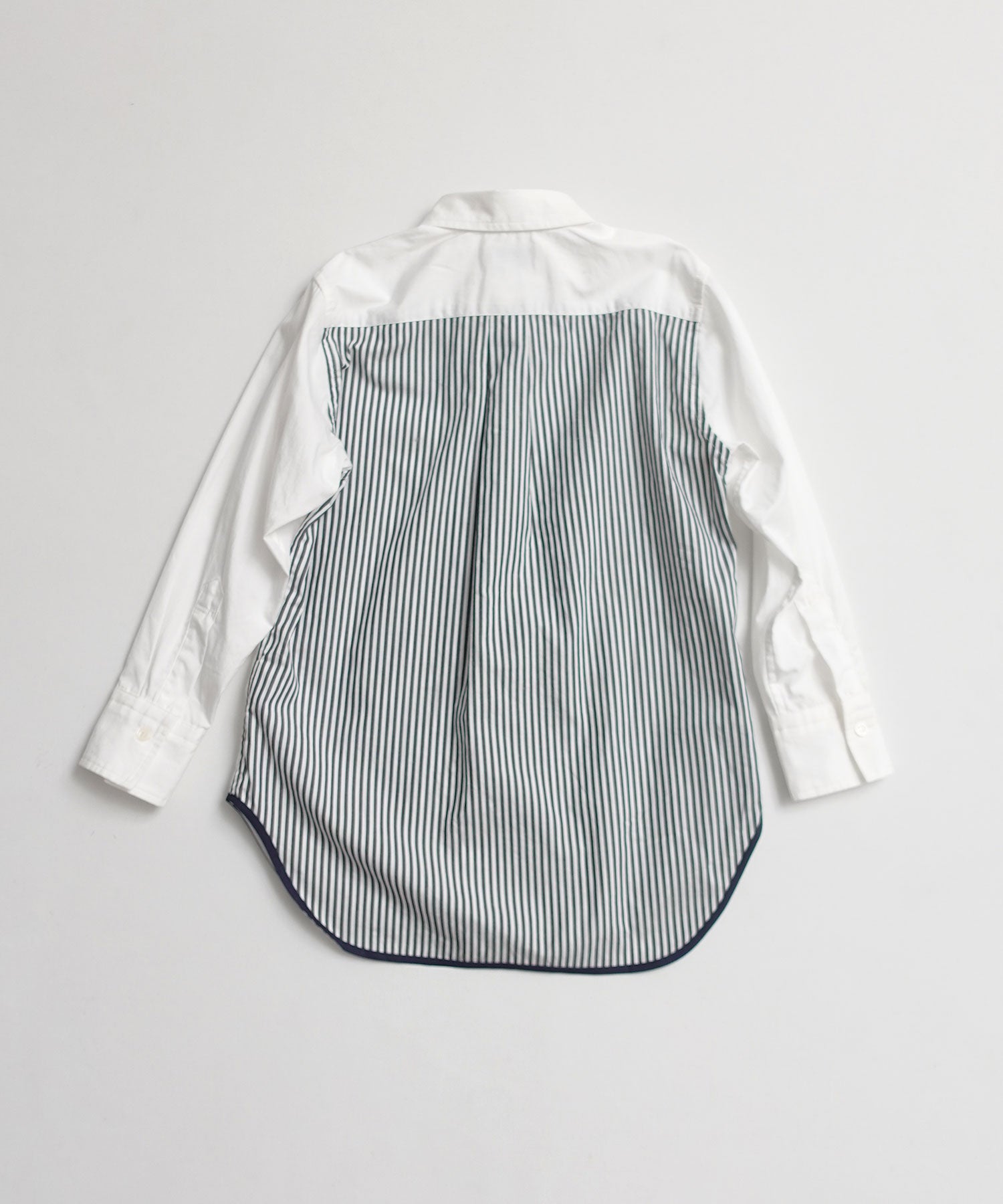 前身頃と袖がホワイト、後ろ身頃をストライプで切り替えたクレイジーシャツ。裾にネイビーのパイピングを施し、どこから見ても可愛いデザインに。長めのカフス、長めの着丈で差をつけて。