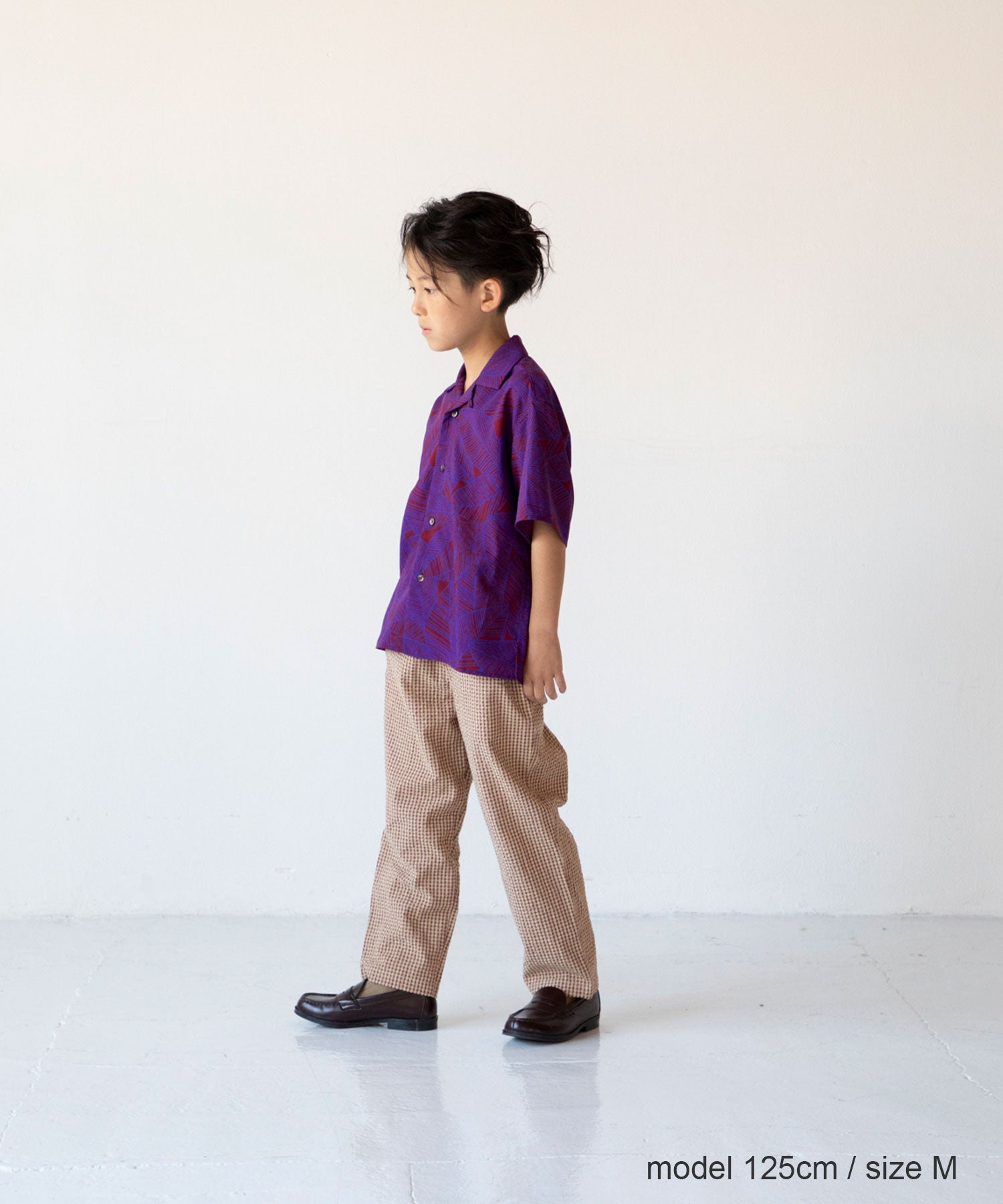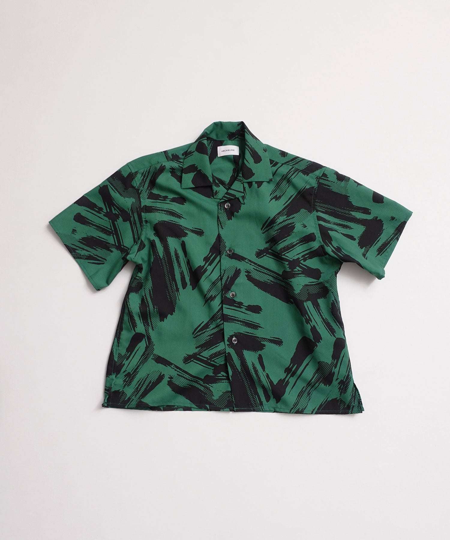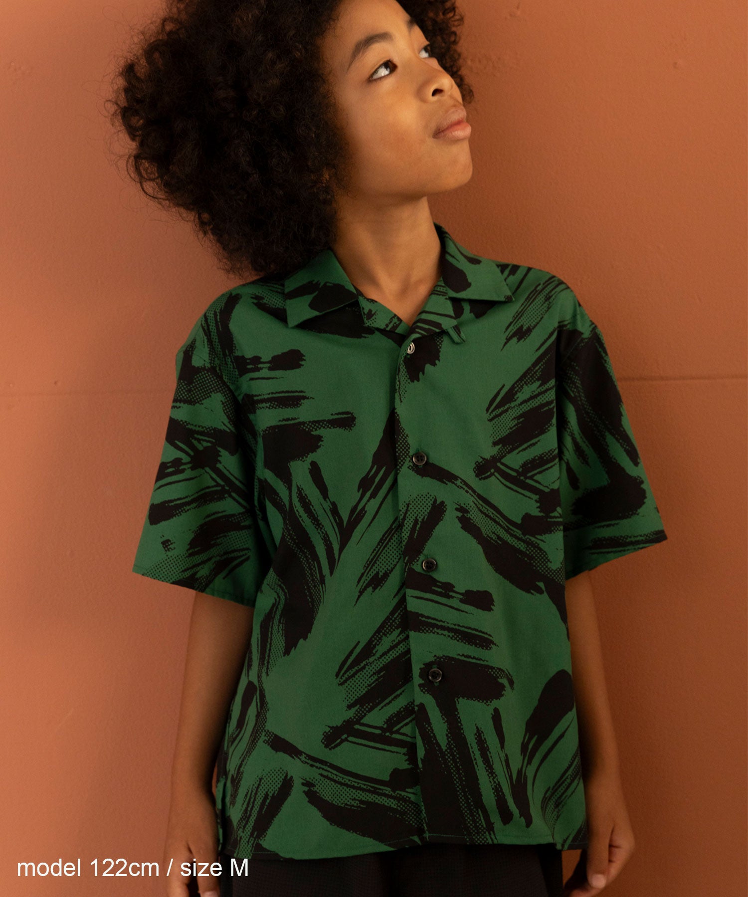 コットンライクなプリント生地を使用した開襟シャツ。セミワイドでミニマルな仕上がりで、もちろんジェンダーを問いません。