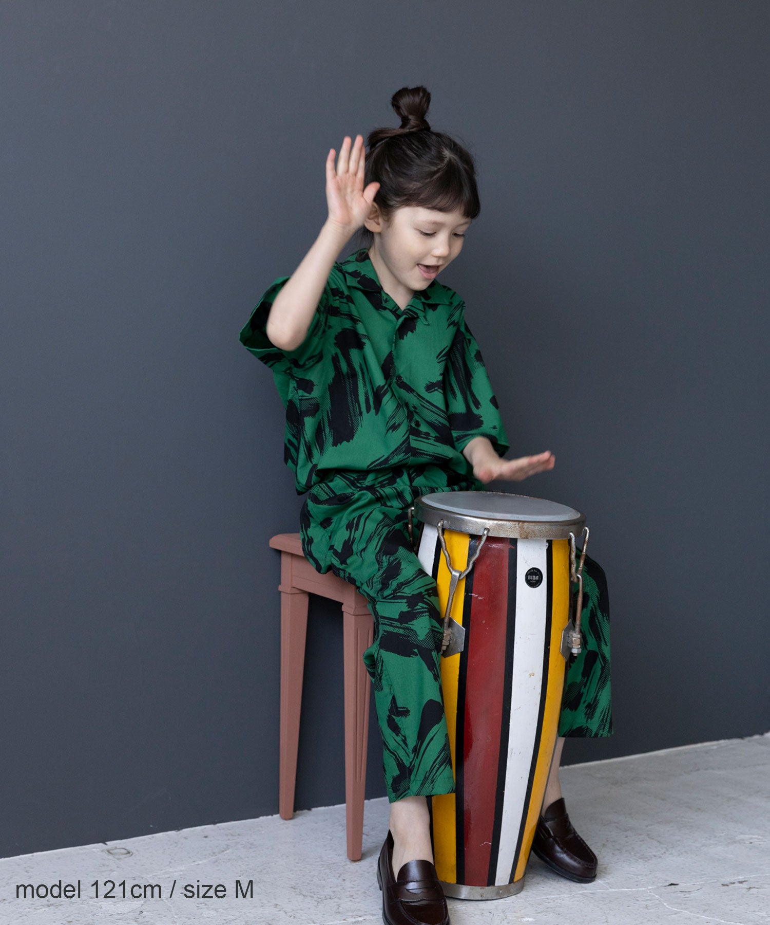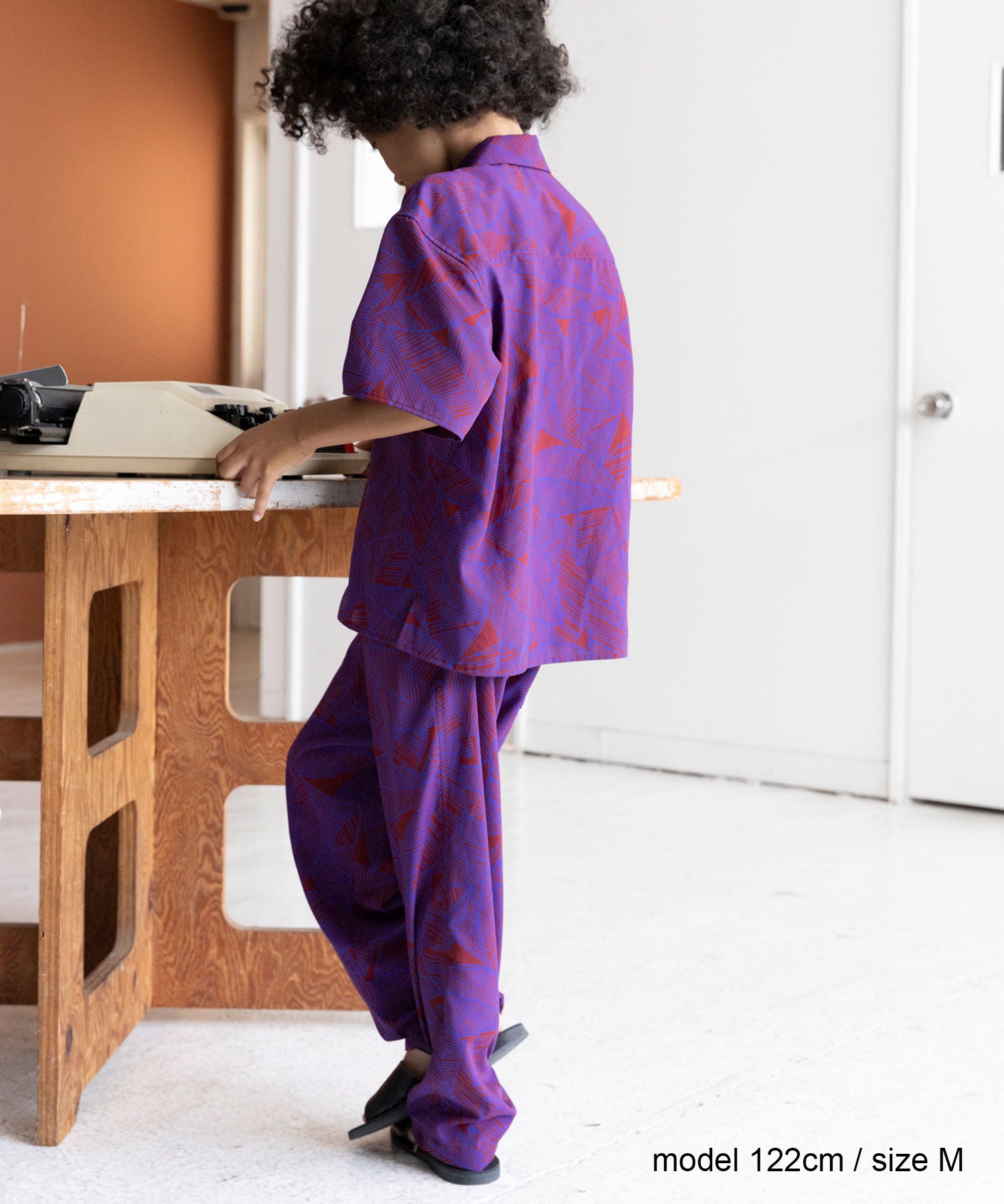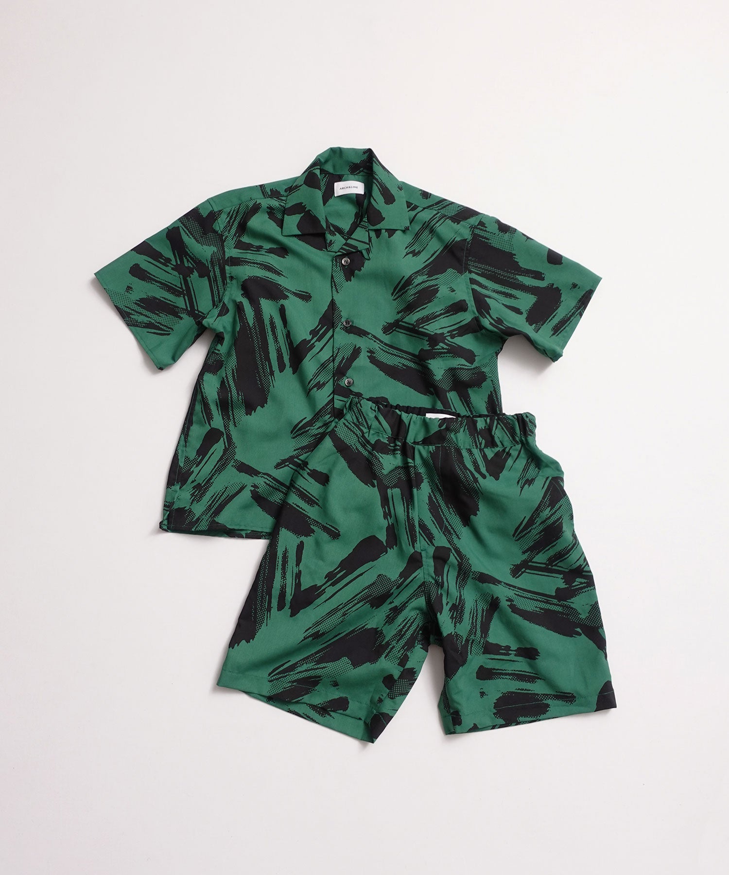 コットンライクなプリント生地を使用した開襟シャツ。セミワイドでミニマルな仕上がりで、もちろんジェンダーを問いません。