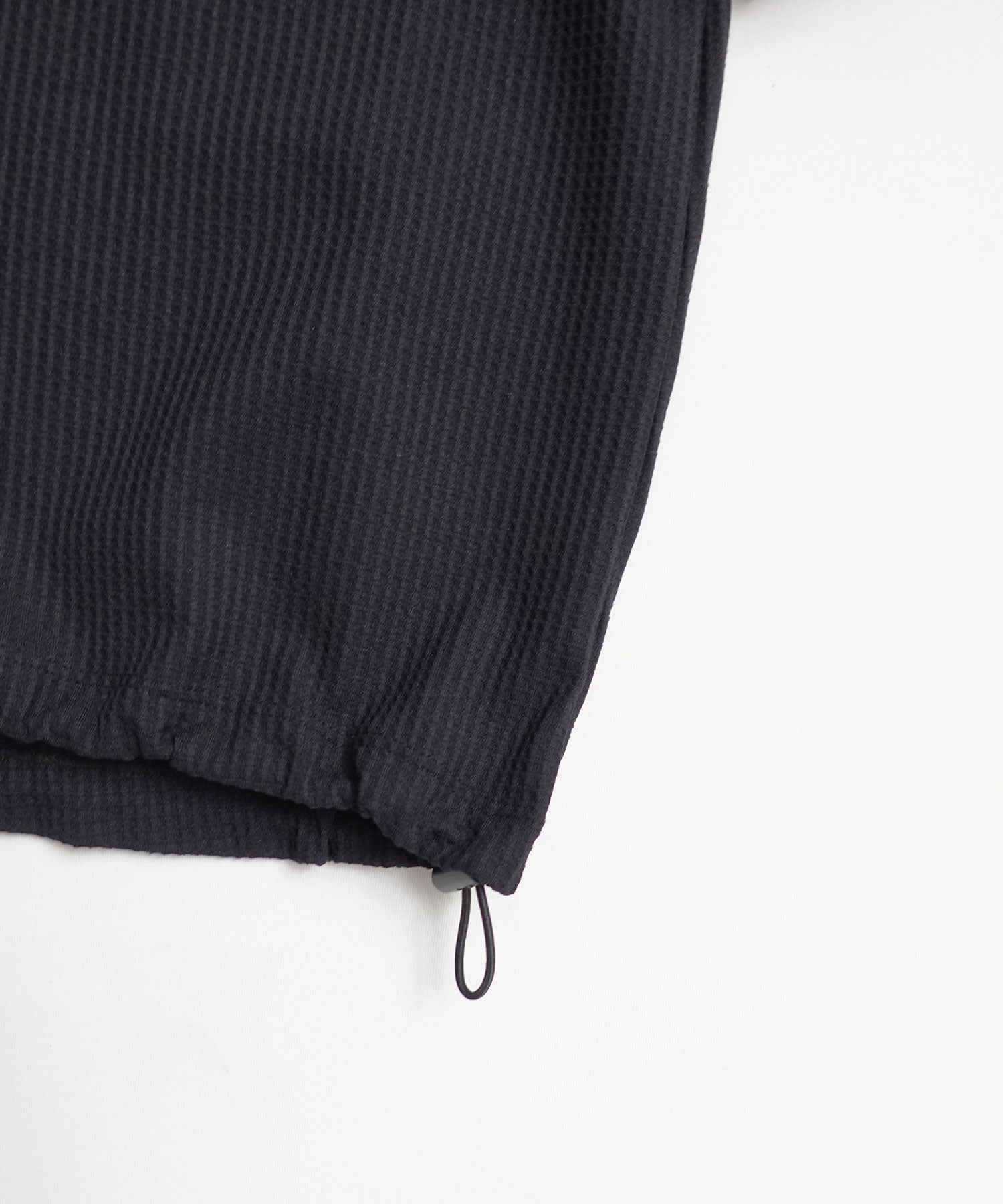 水陸両用素材のワッフルを使用した半袖プルオーバー。暑い時はフロントのプランサーを外せば体温調節可能。裾には丸ゴム入りで、お好きな形にブラウジング出来ます。水着の上に着用するのにもぴったり。