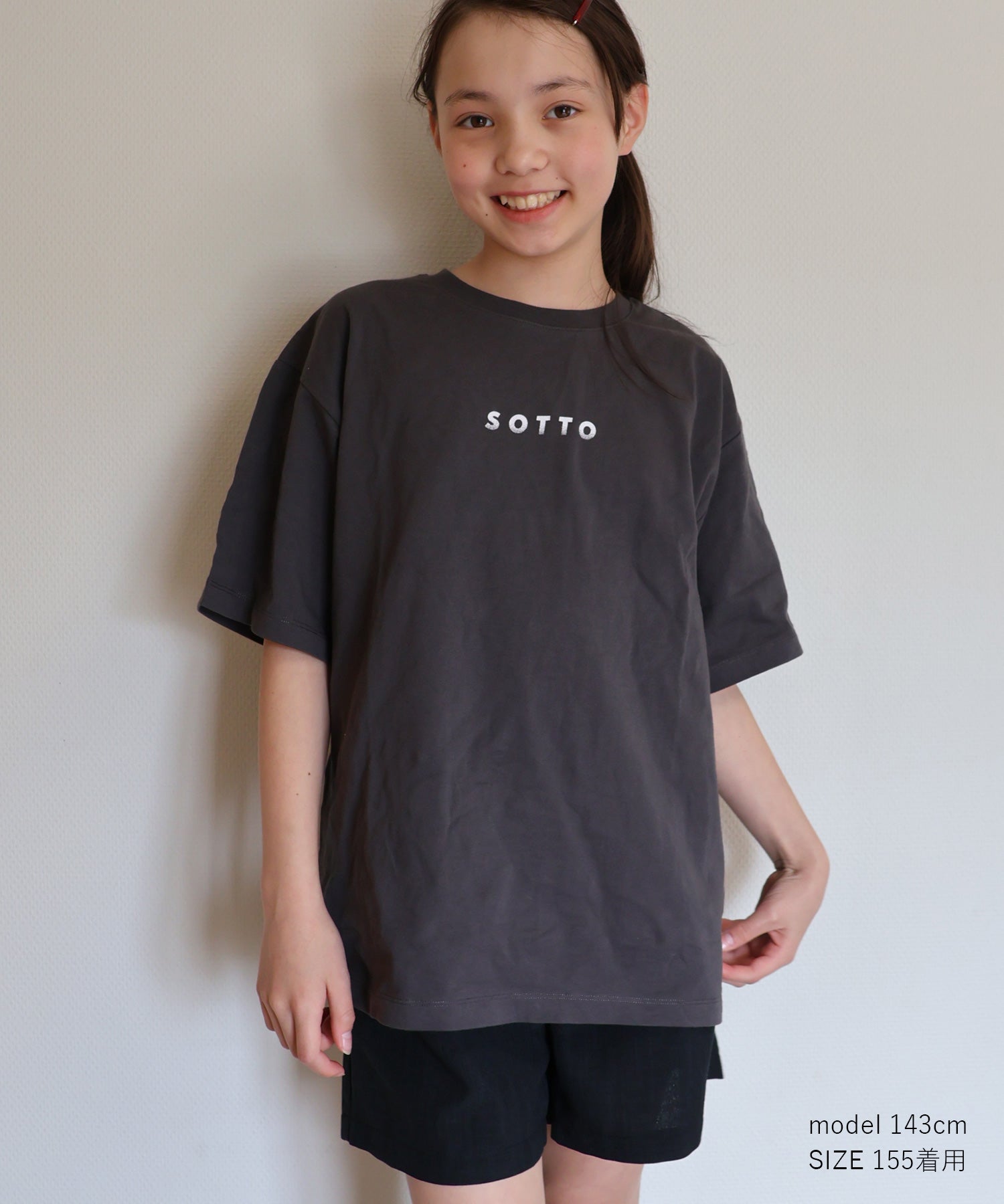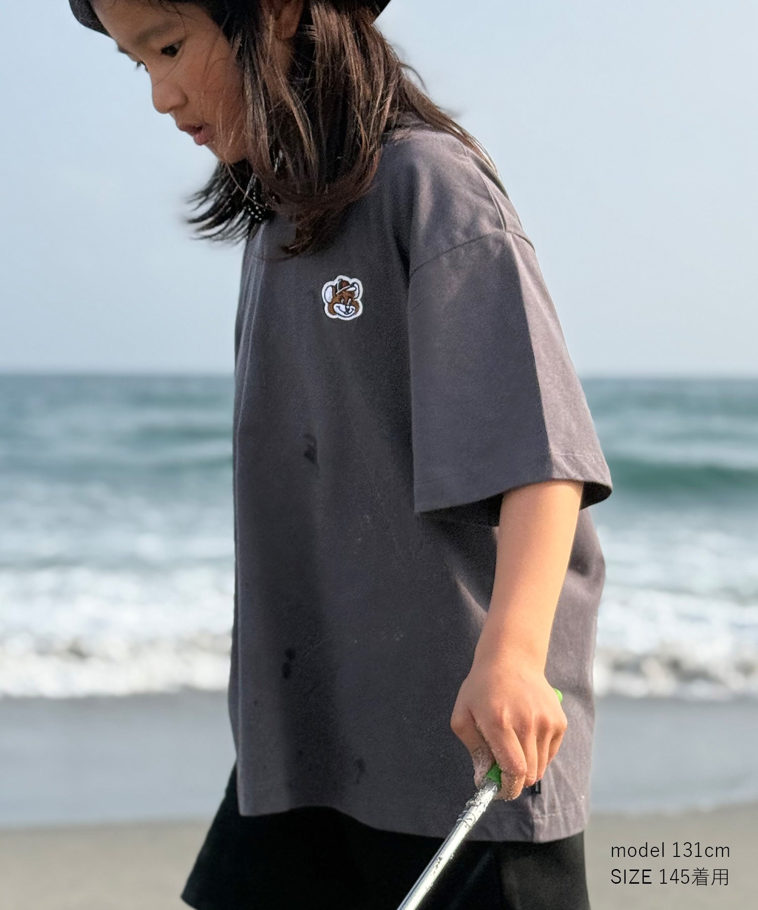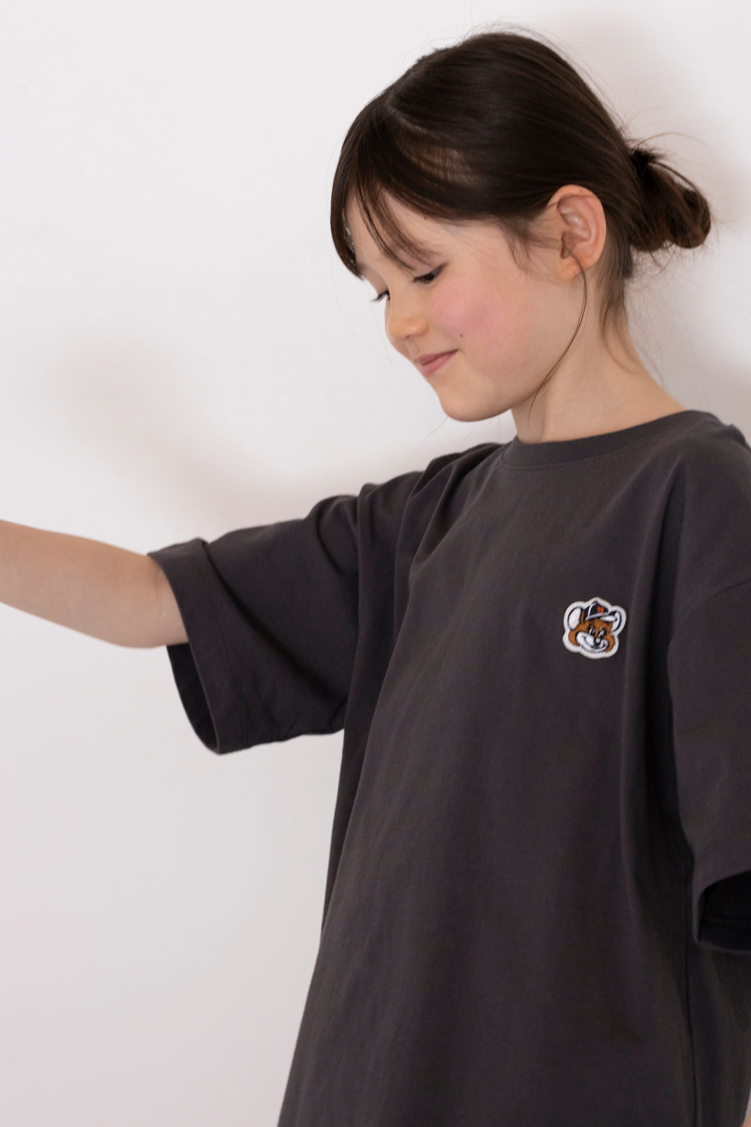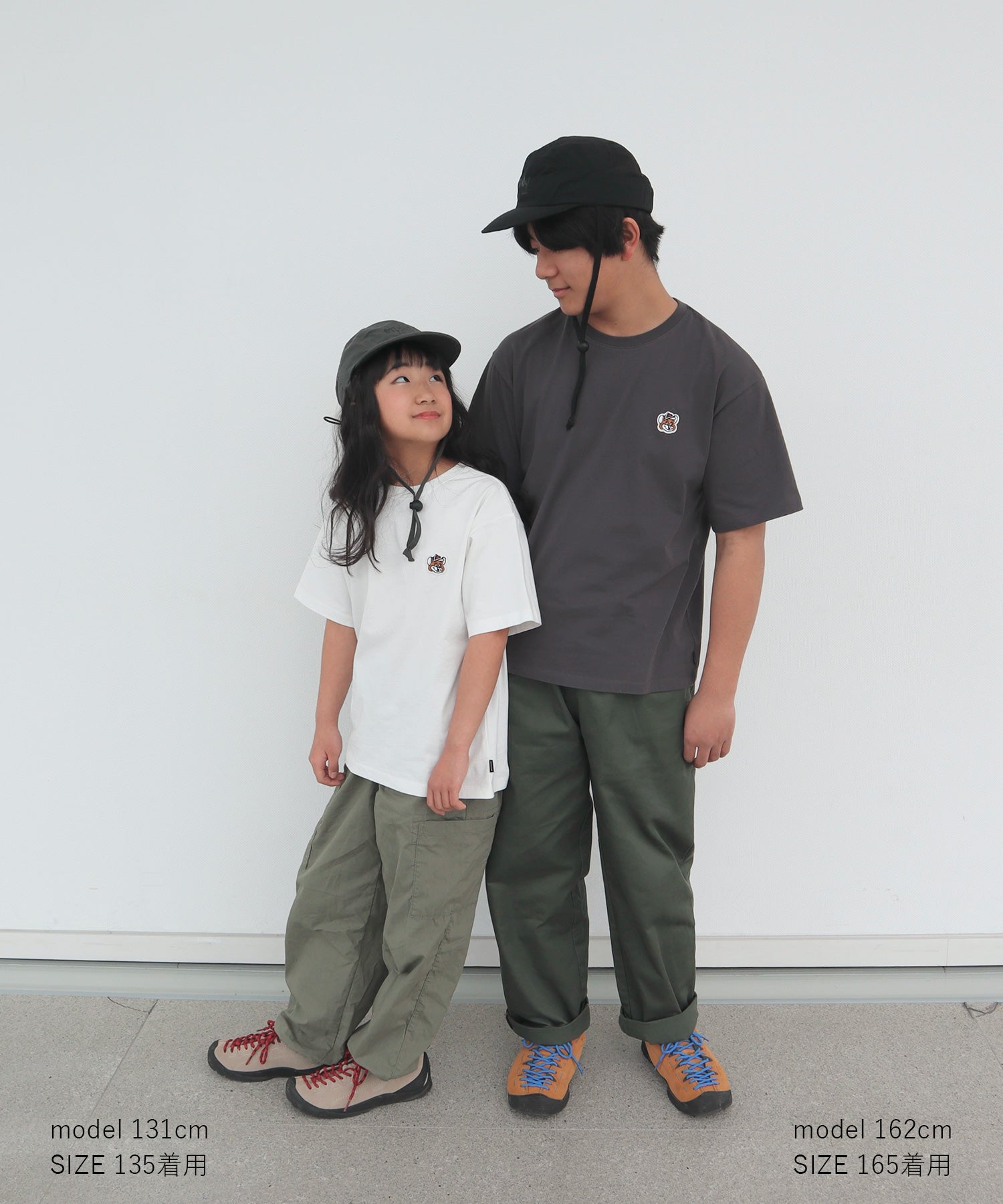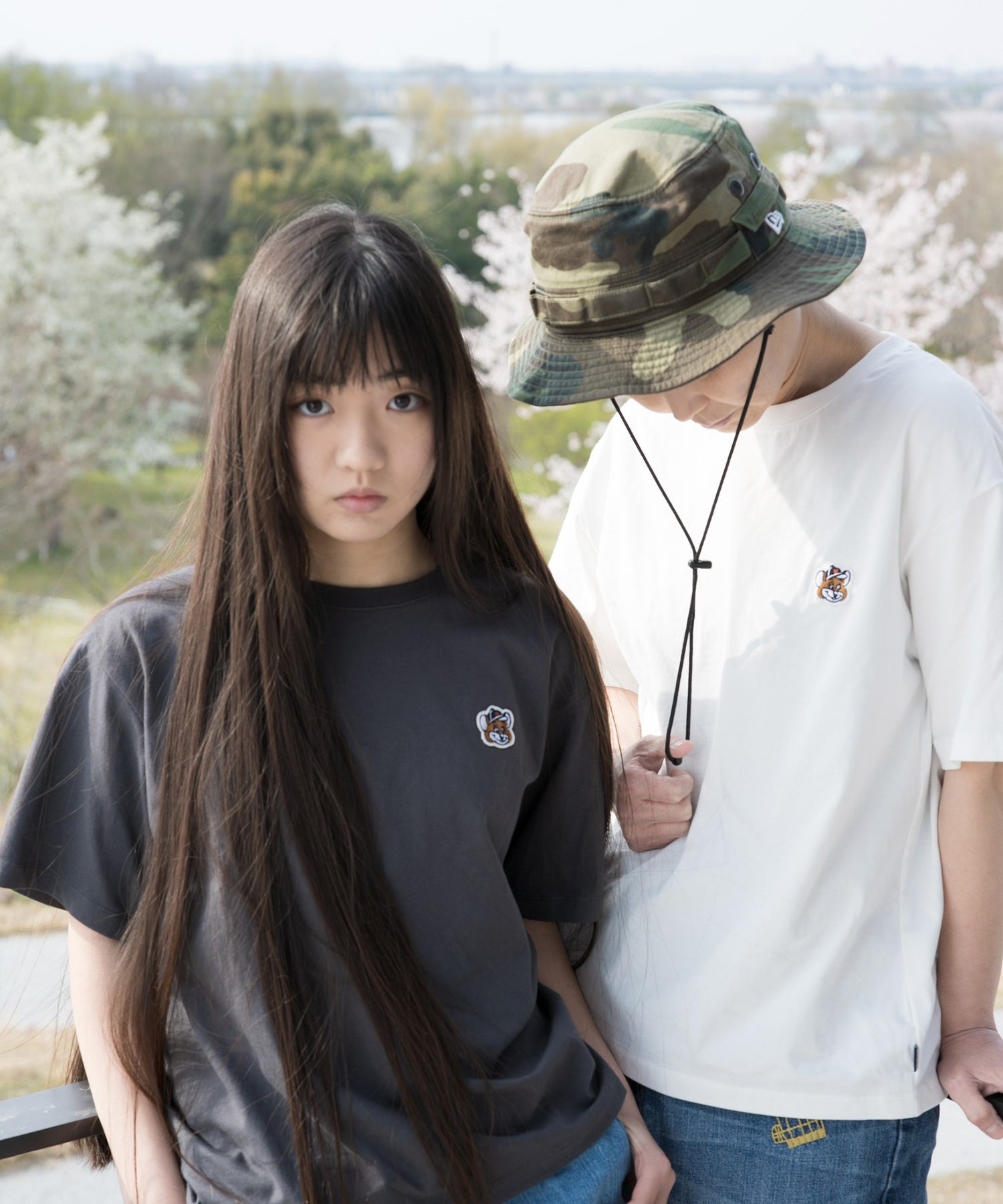 形は定番のジャストルーズ型。ややドロップショルダーで、アームホールもややゆったりと作っており動きを妨げません。左脇に付けたピスネームもポイント。キッズから大人まで着やすい色展開。